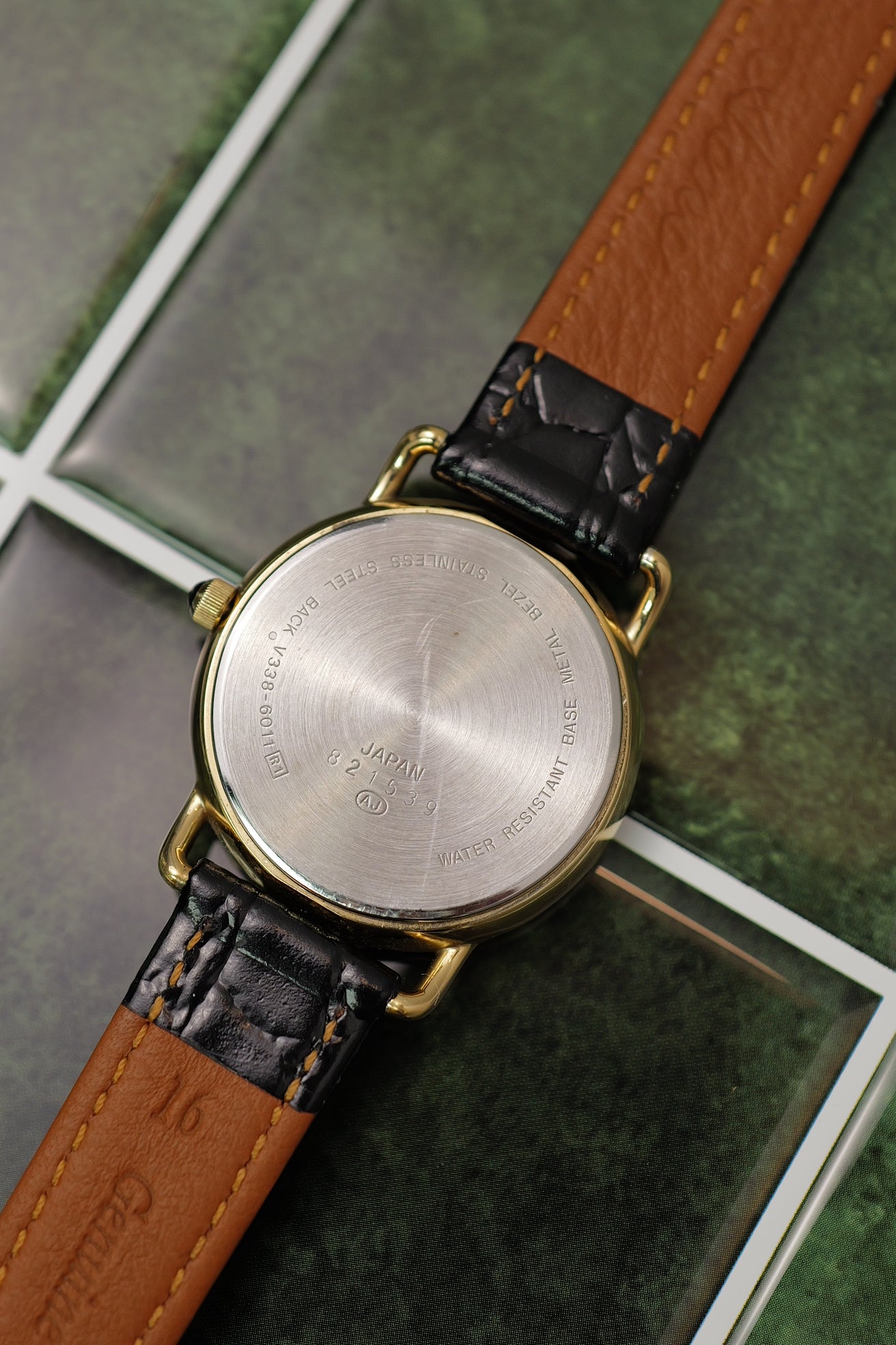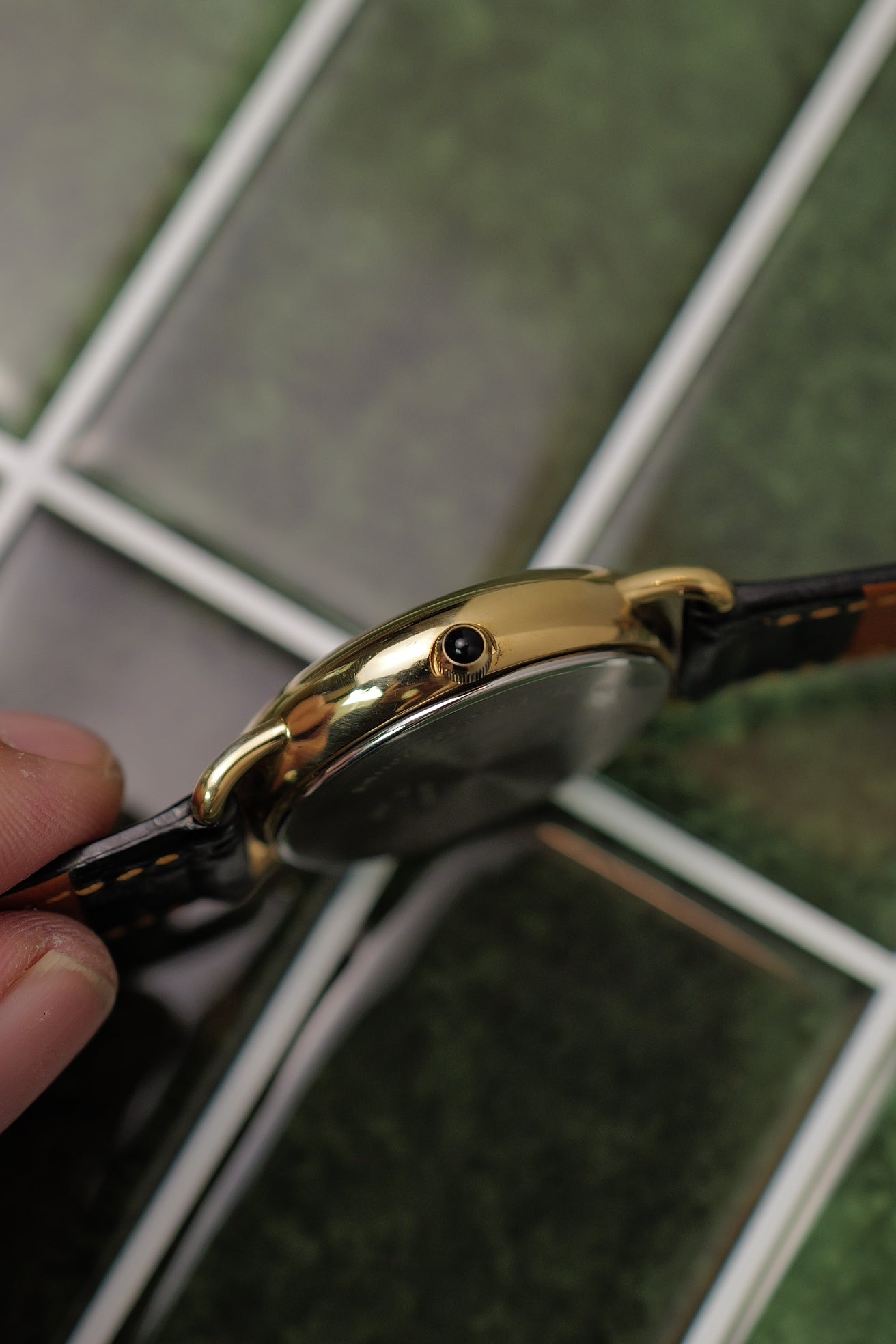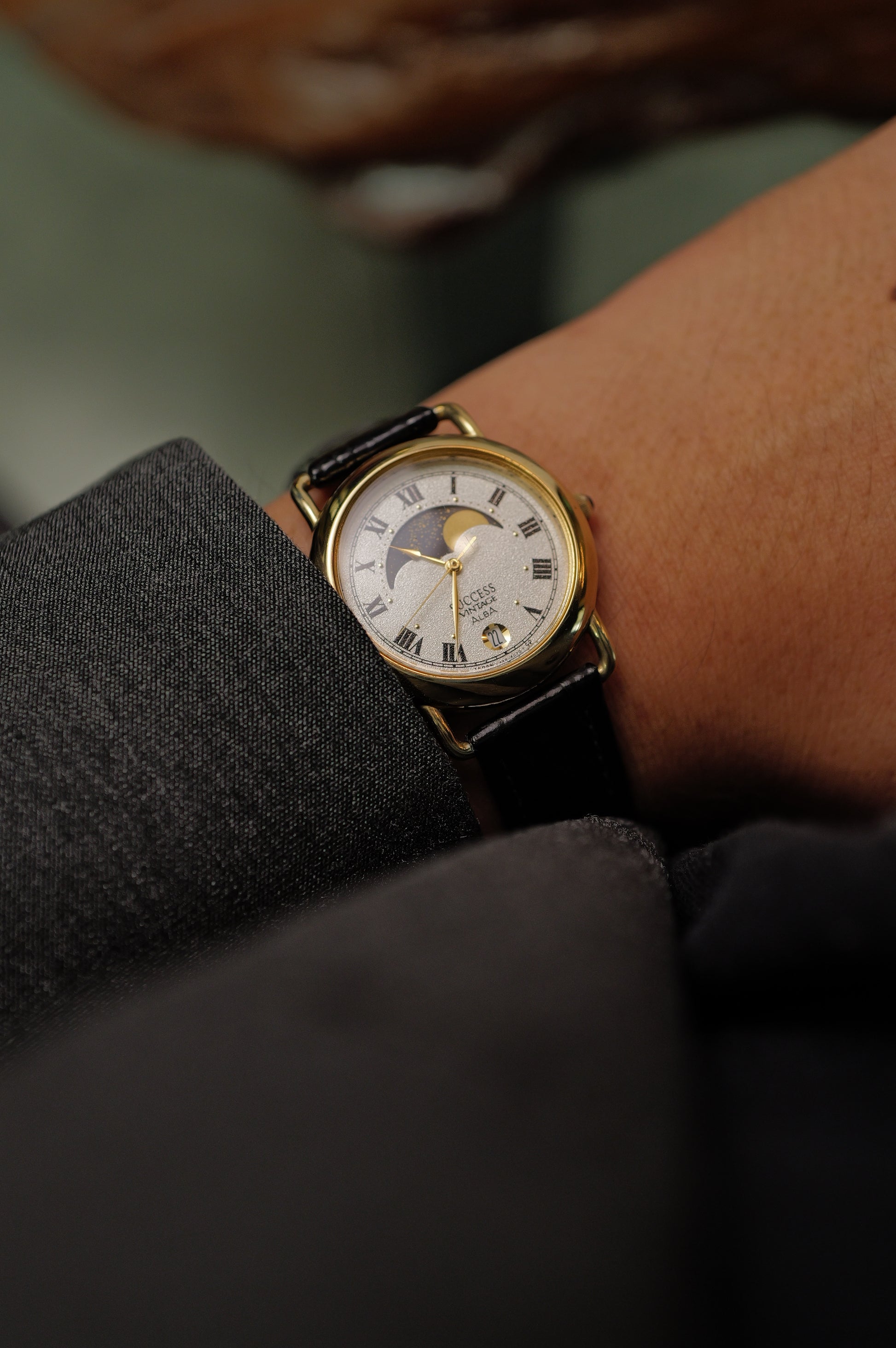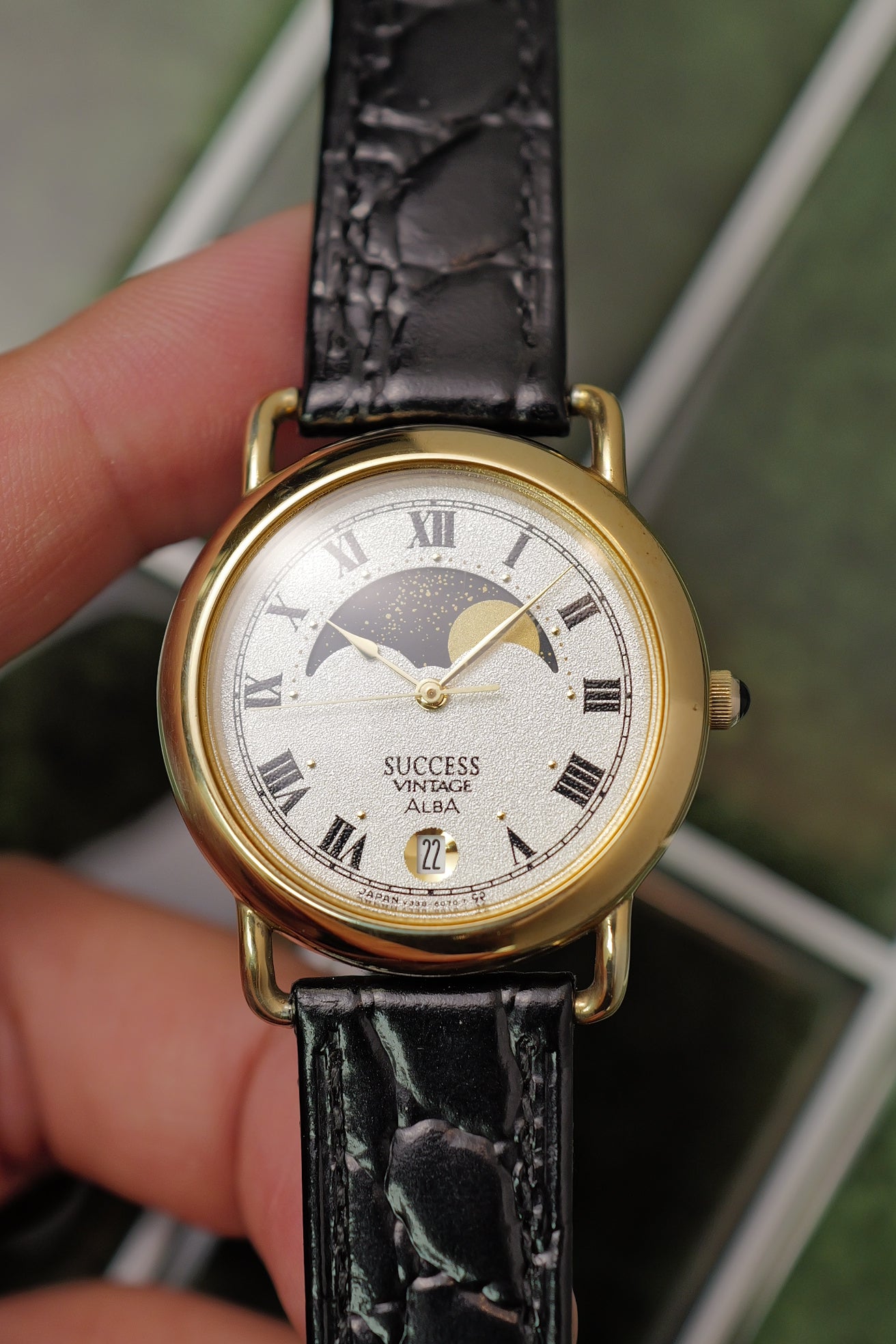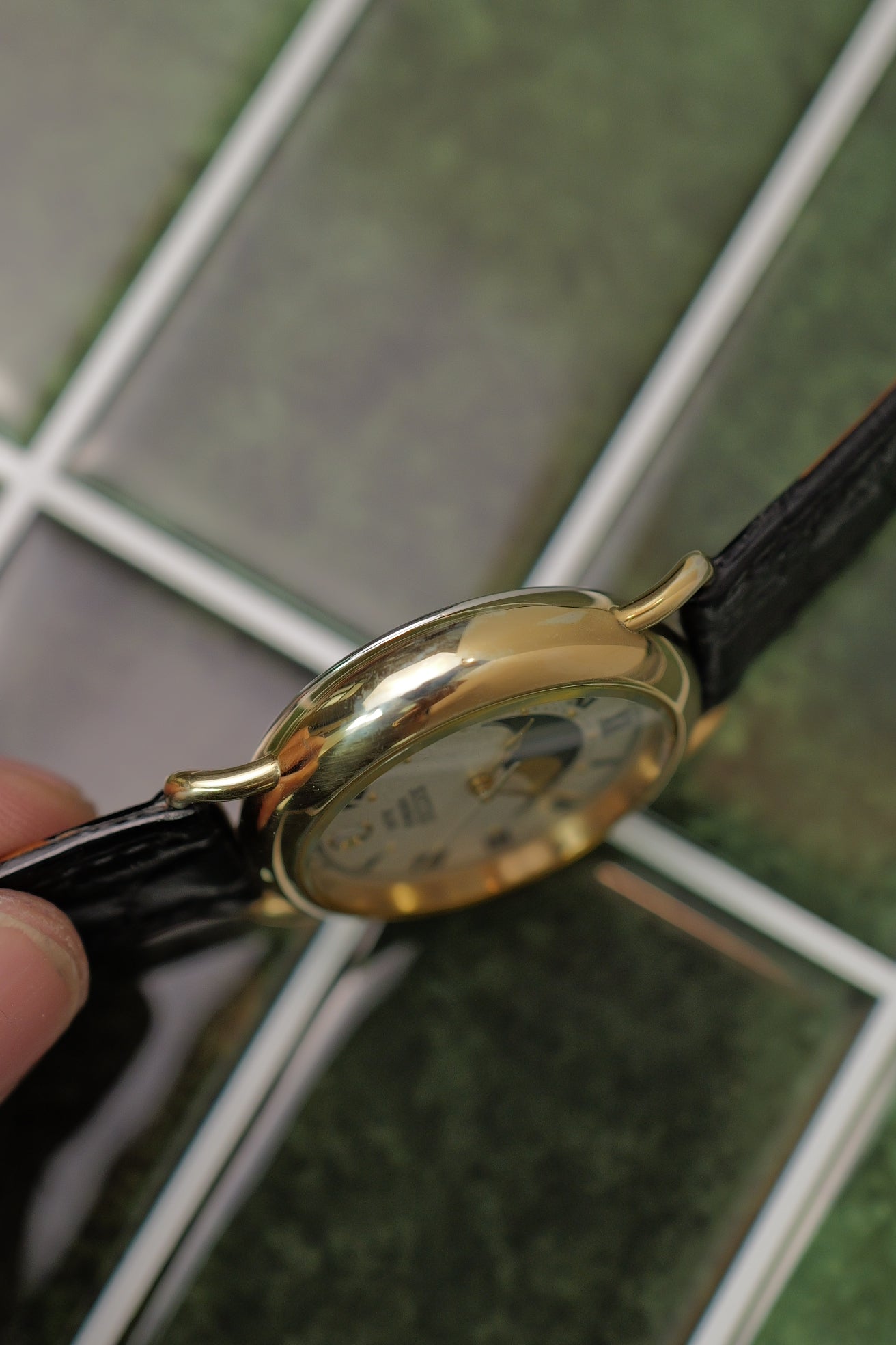 A highly rare and unique moonphase, with a rarely seen "pebble" shaped case. One of the most beautiful moonphase i have curated, with very balanced typography and dial design. i especially love how the case and the glass compliments each other, with a convex design to complete the pebble shape. very slight hairline scratches on the glass only visible in close up.