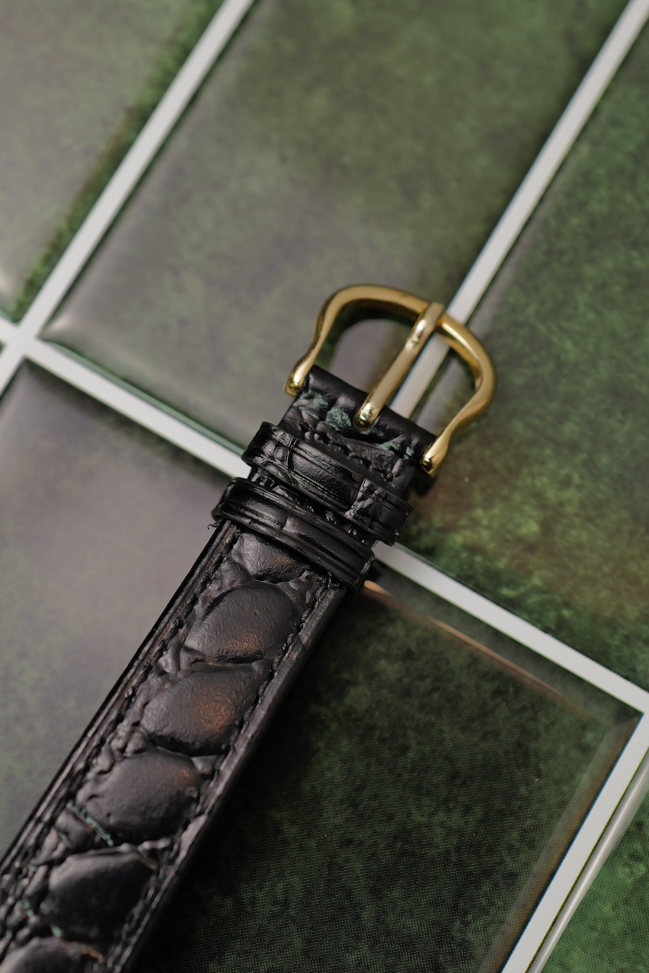 Watch has no dial corrosion or glass scratches. attached with a new black after market strap and original buckle