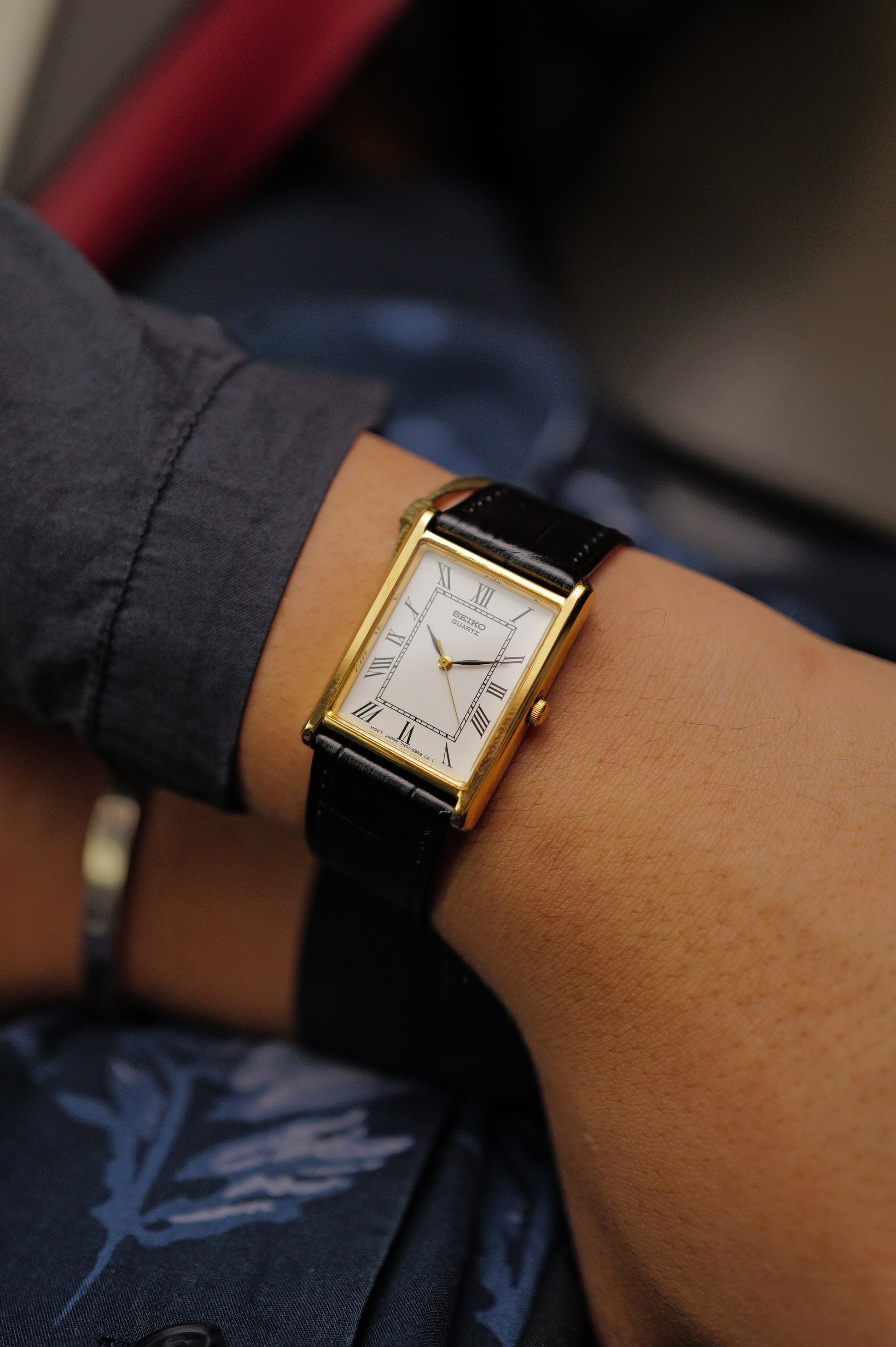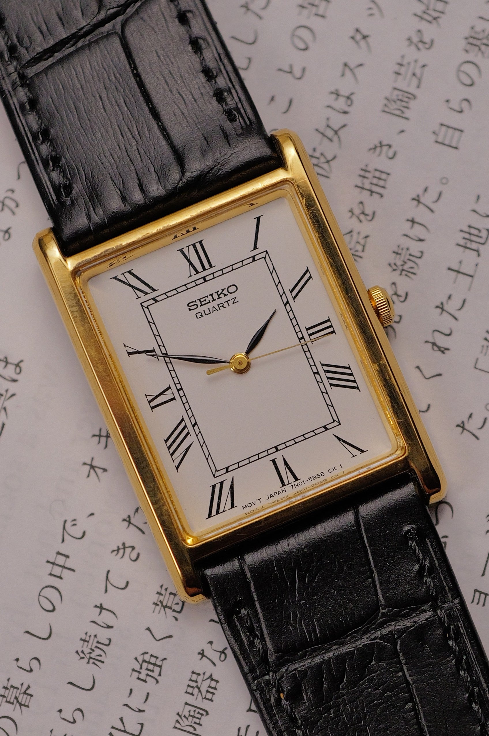 A beautiful Seiko Tank with all quintessential elements, rail road tracks, roman numerals, and in a rectangle. not a piece which pops up often or is a piece you'll be able to find easily.