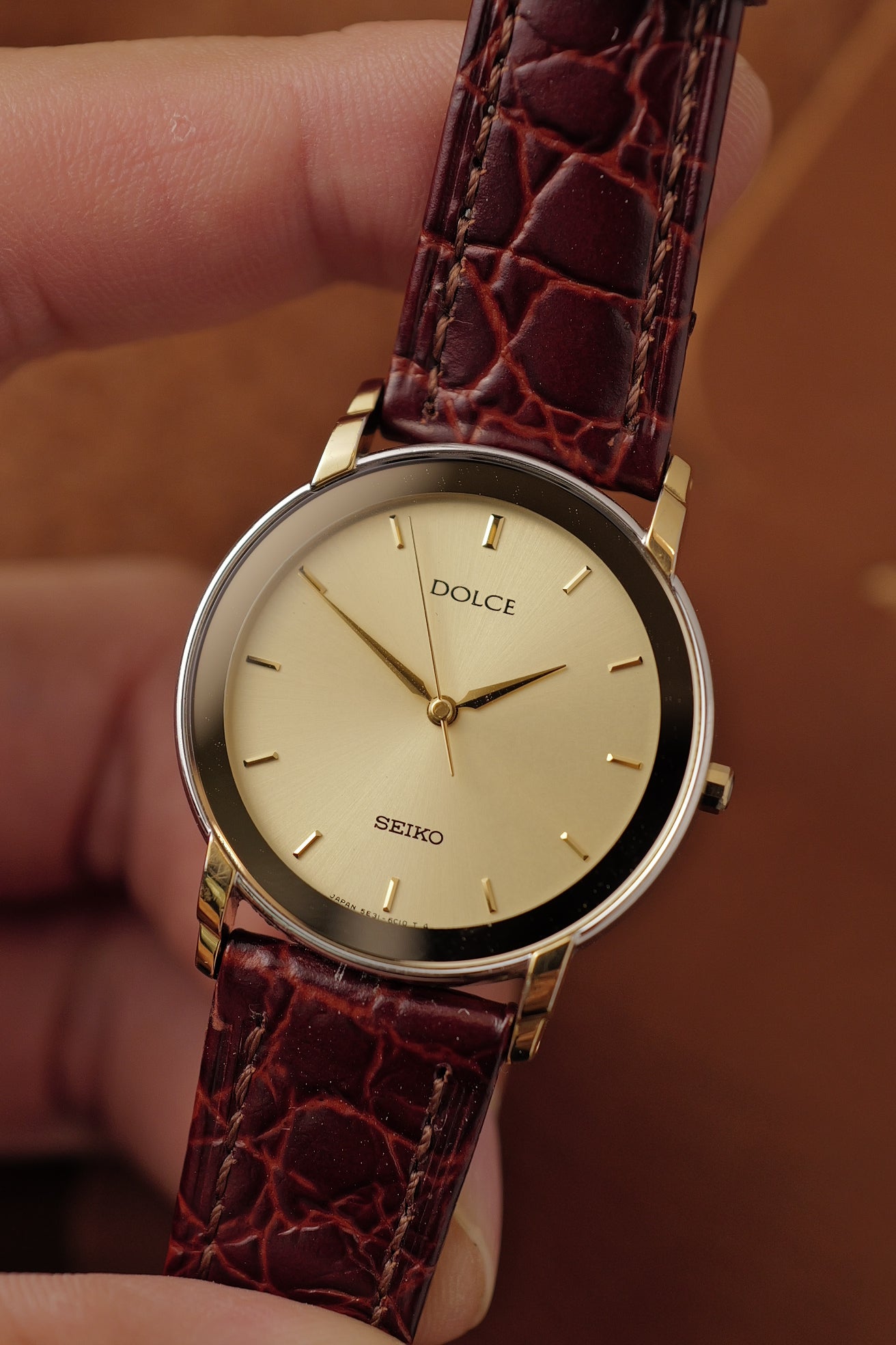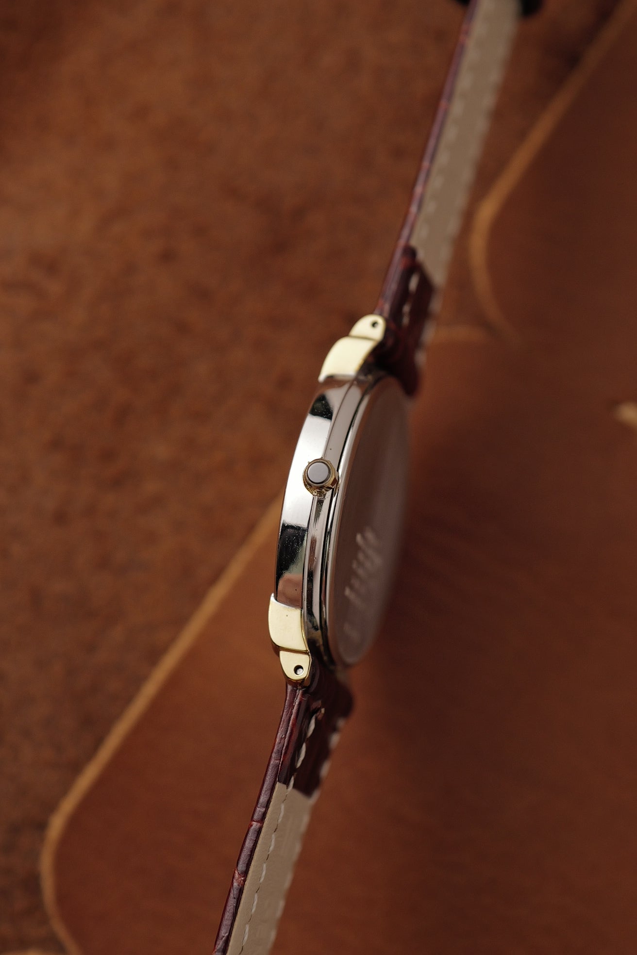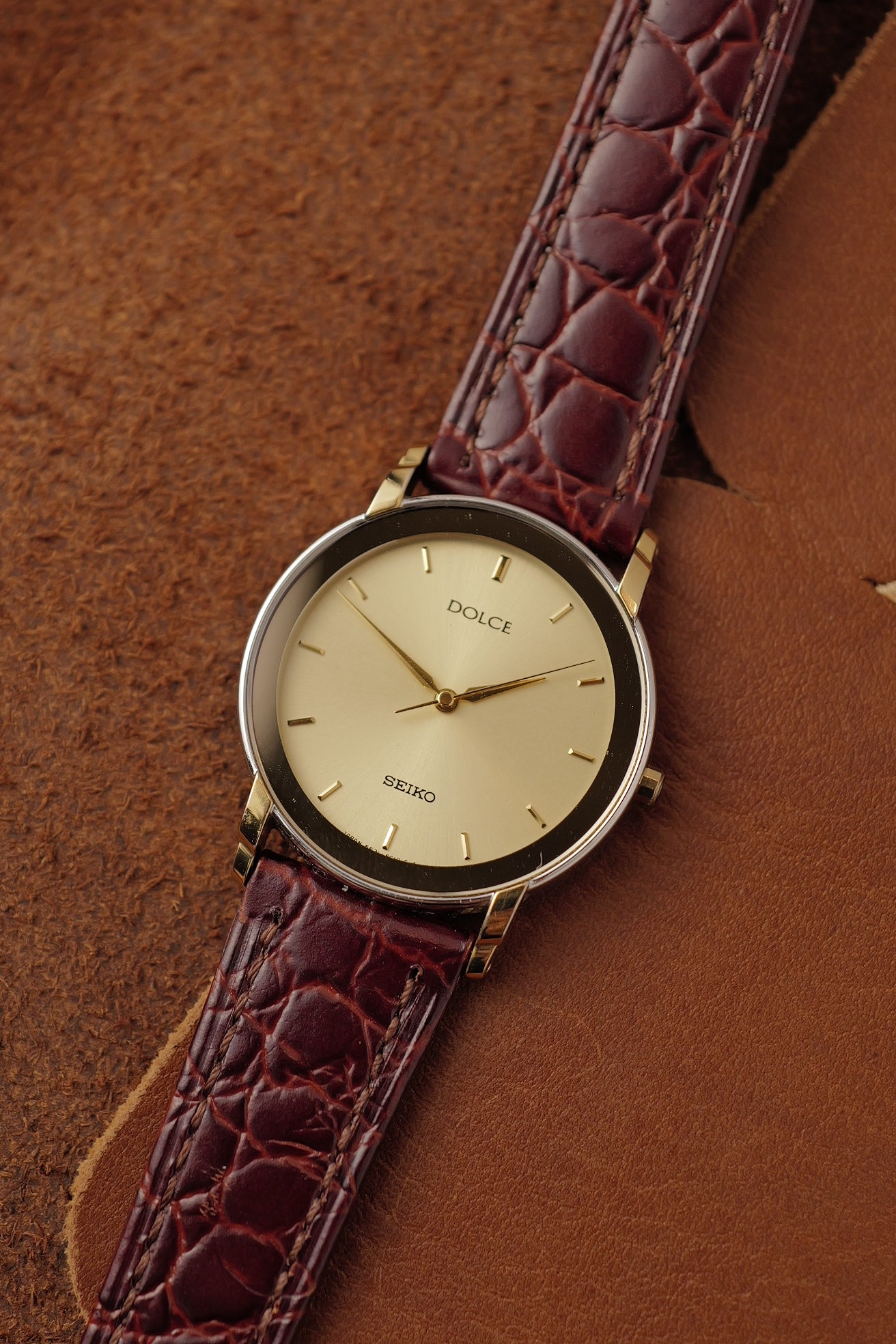 A gorgeous full glass front case dolce, with round polished gold-tone case with smooth bezel. Champagne sunburst dial with thin gold stick markers and pencil-style gold hands. Crocodile-embossed brown leather strap and narrow lugs complete the refined, minimalist feel and the MVP design of this piece is its front Crystal, which goes fully flat.