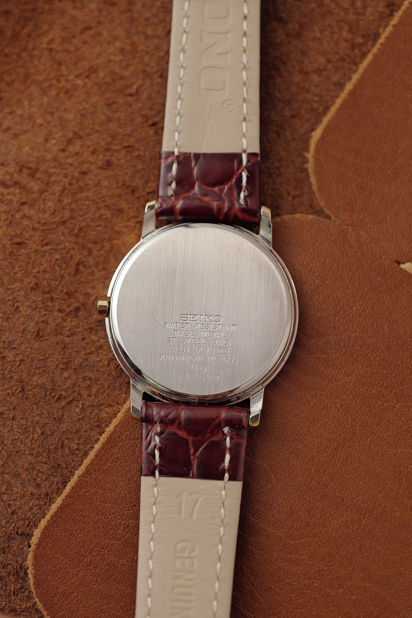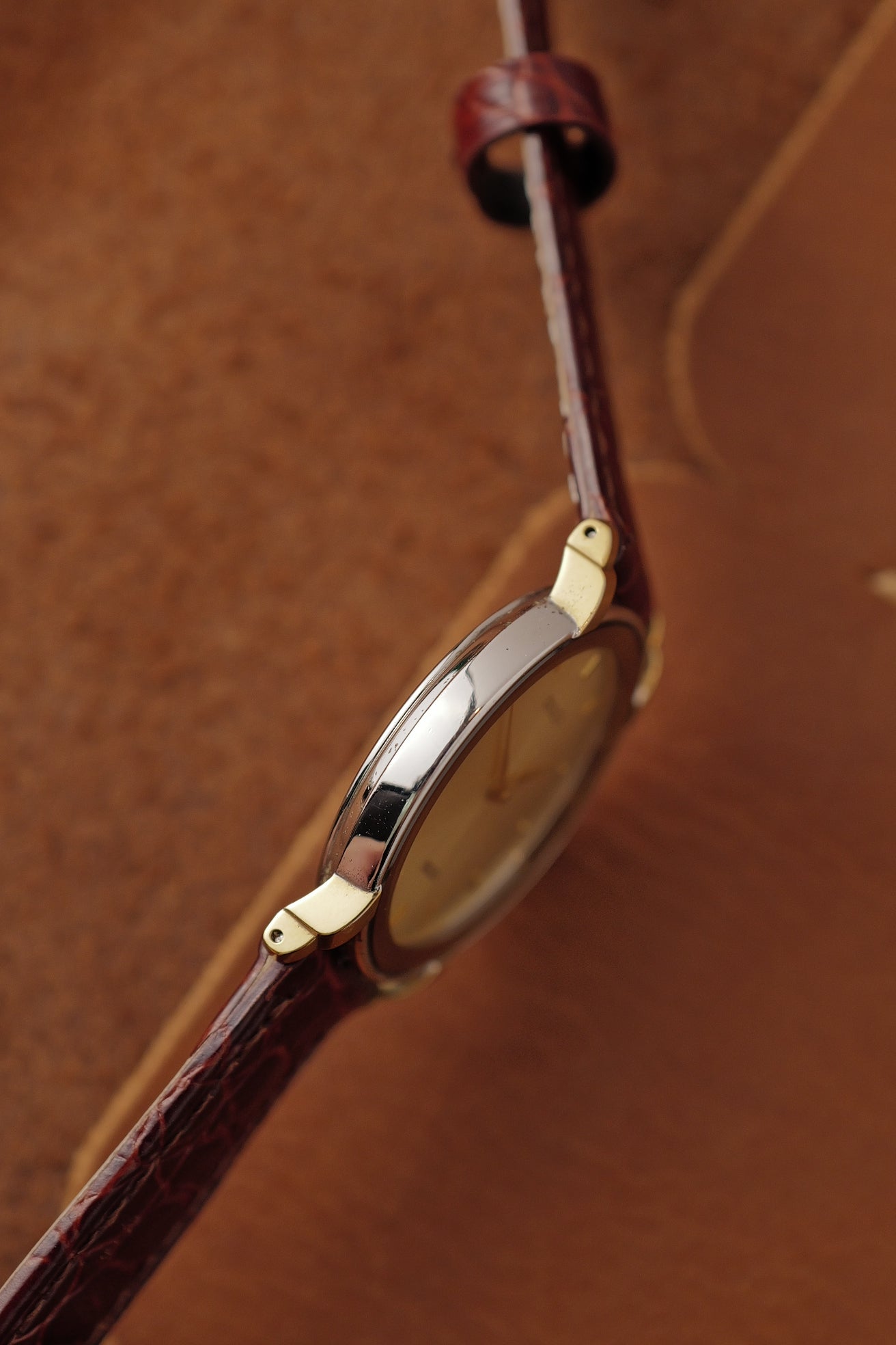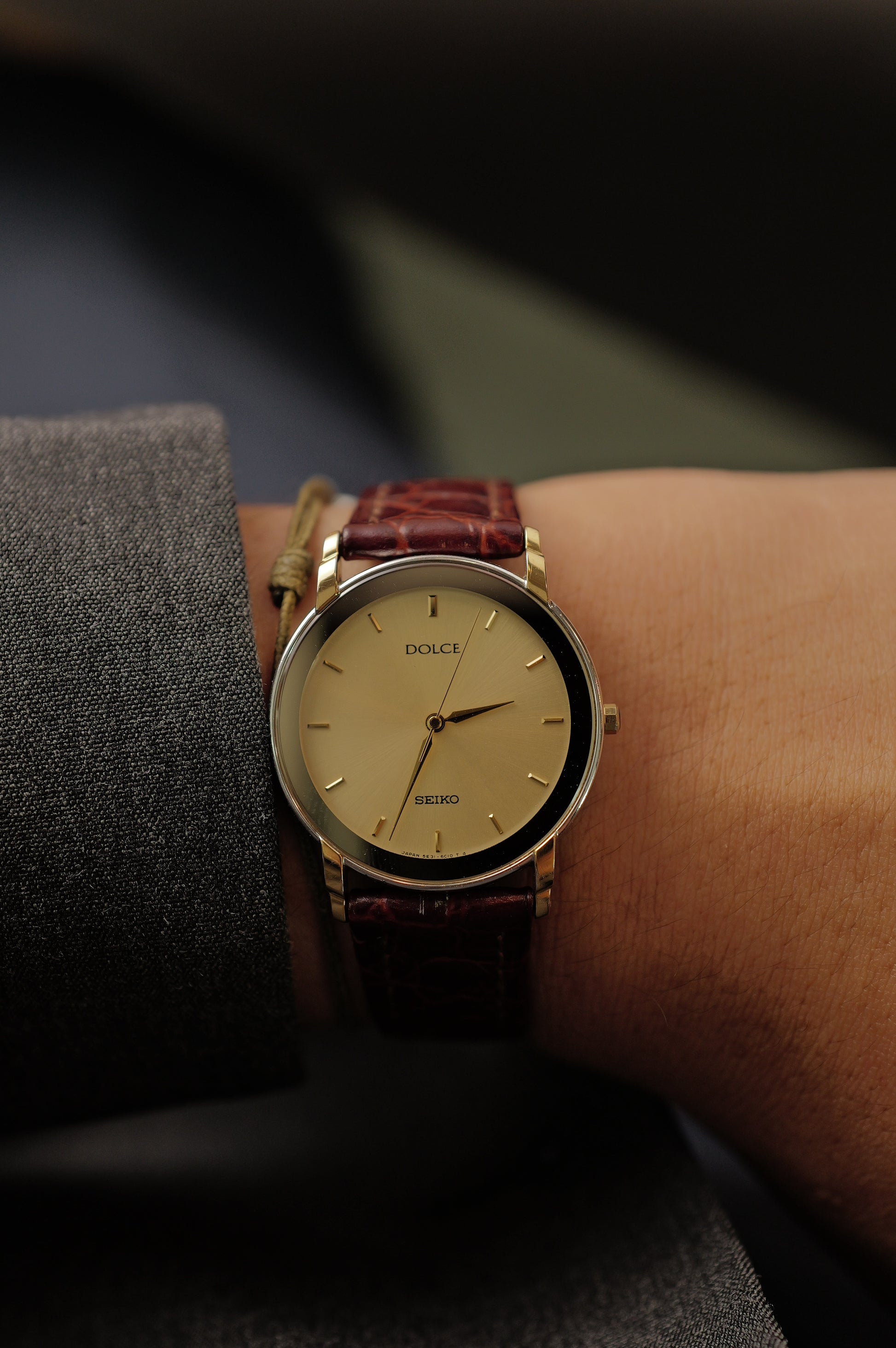 A gorgeous full glass front case dolce, with round polished gold-tone case with smooth bezel. Champagne sunburst dial with thin gold stick markers and pencil-style gold hands. Crocodile-embossed brown leather strap and narrow lugs complete the refined, minimalist feel and the MVP design of this piece is its front Crystal, which goes fully flat.
