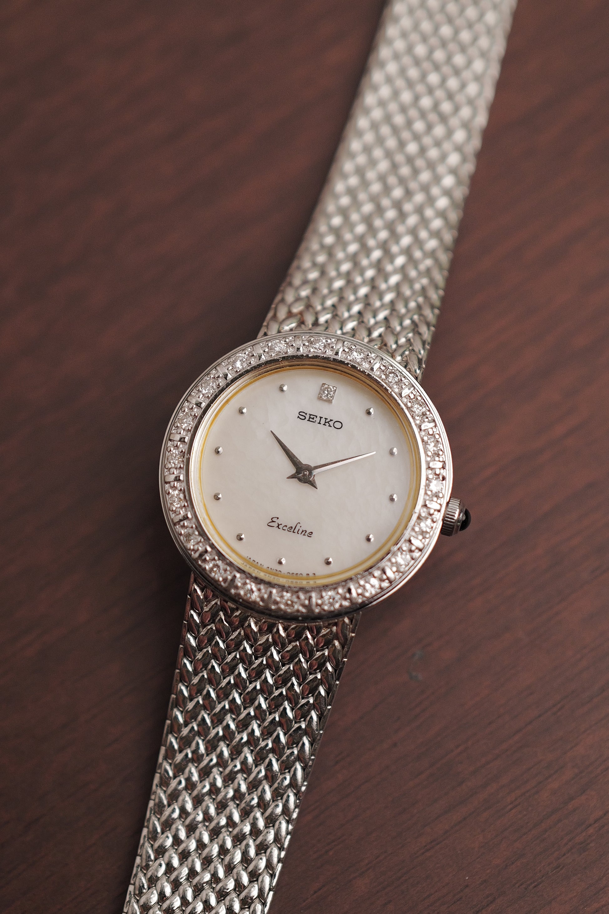| Watch Summary | A 20-diamond bezel seiko exceline with a mother of pearl dial. A rarer variation with a steel finishing compared to it being gold. Comes with a cut to size integrated bracelet design. One of the top-echelon exceline models in the seiko catalogue when real diamonds were used. |