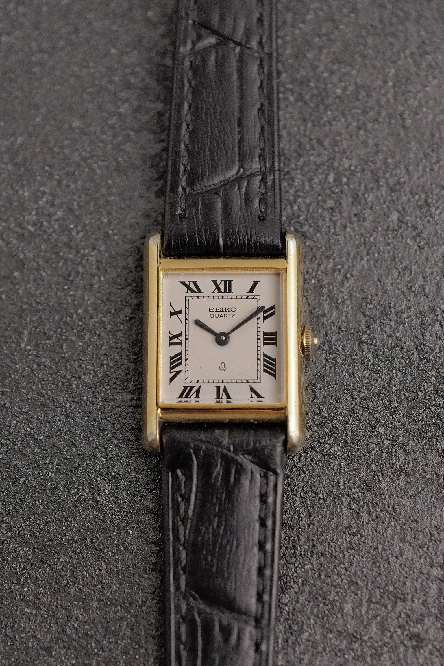 | Watch Summary | The "OG", the first of the first seiko tanks, the perfect homage of the cartier tank, with similar chemin de fer minute markers, thick bold roman numerals and a sleek case. Comes attached on a new strap and aftermarket gold buckle |