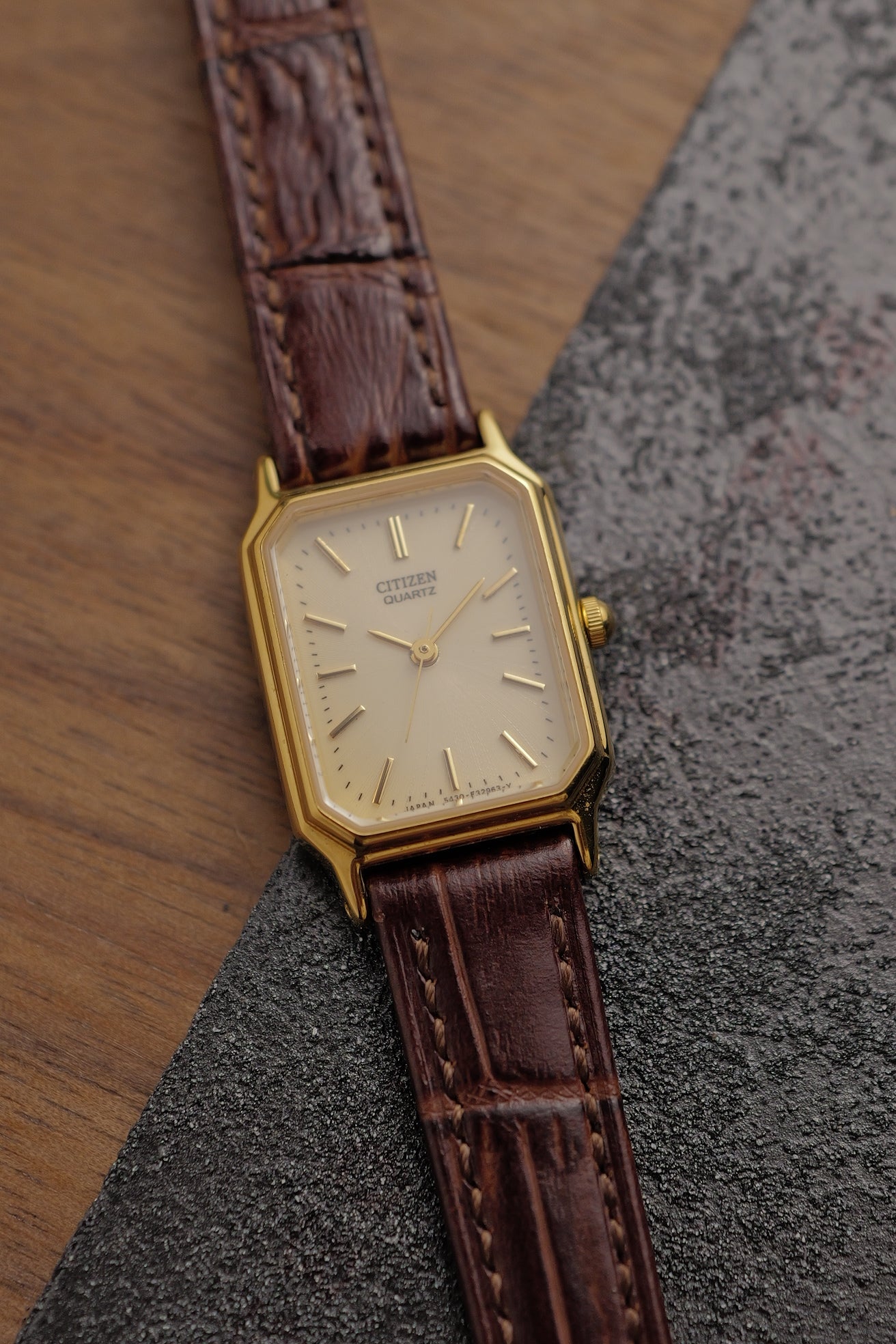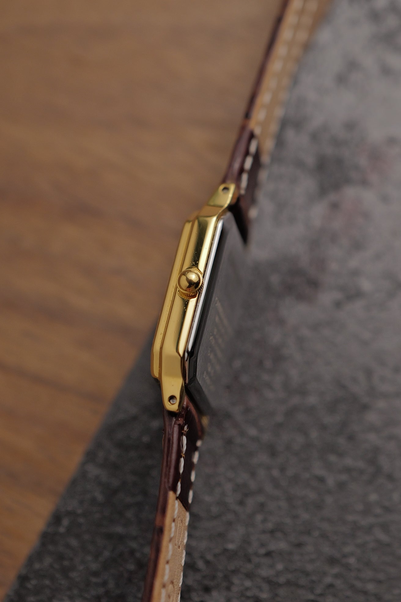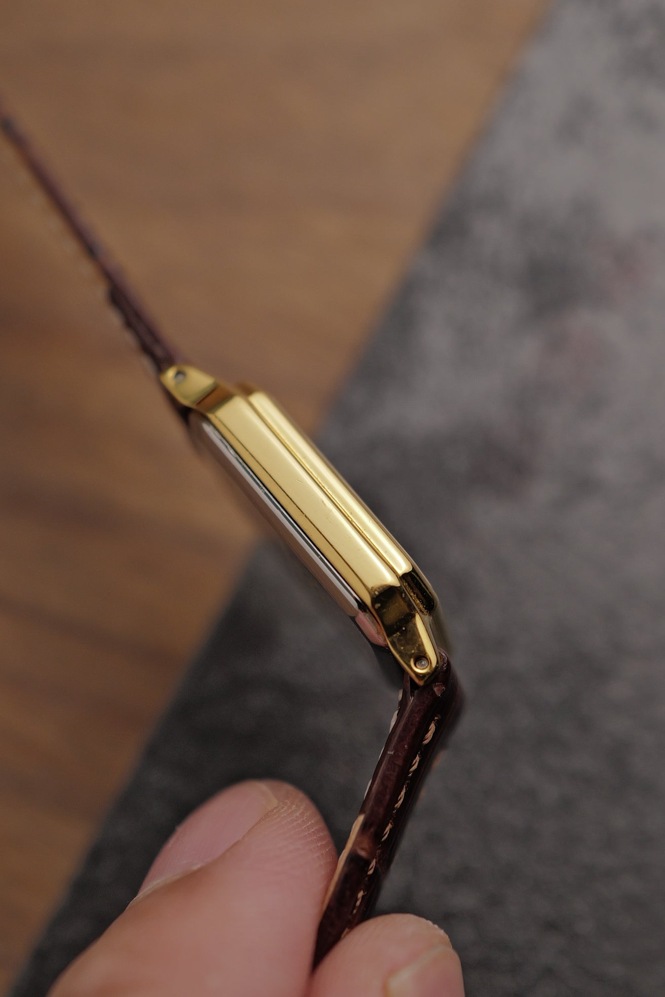 A hexagonal-esque tank gold-tone case with sharp facets and polished finish. The dial is very gorgeous, if you look closely its actually a sunburst champagne finishing with applied baton indices and thin gold pencil hands. comes attached with a new after market strap and buckle. |