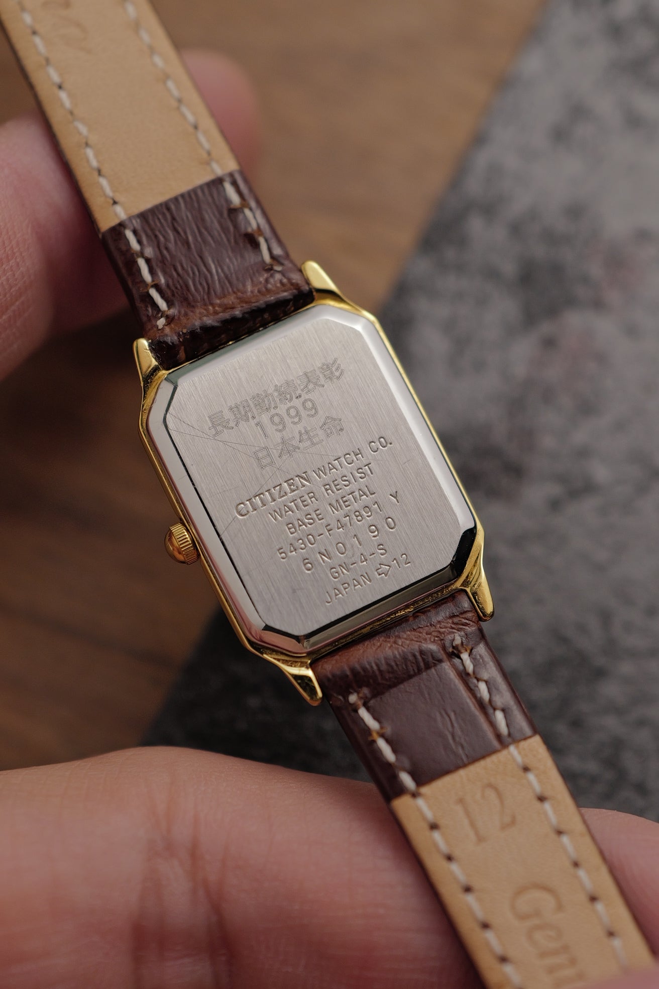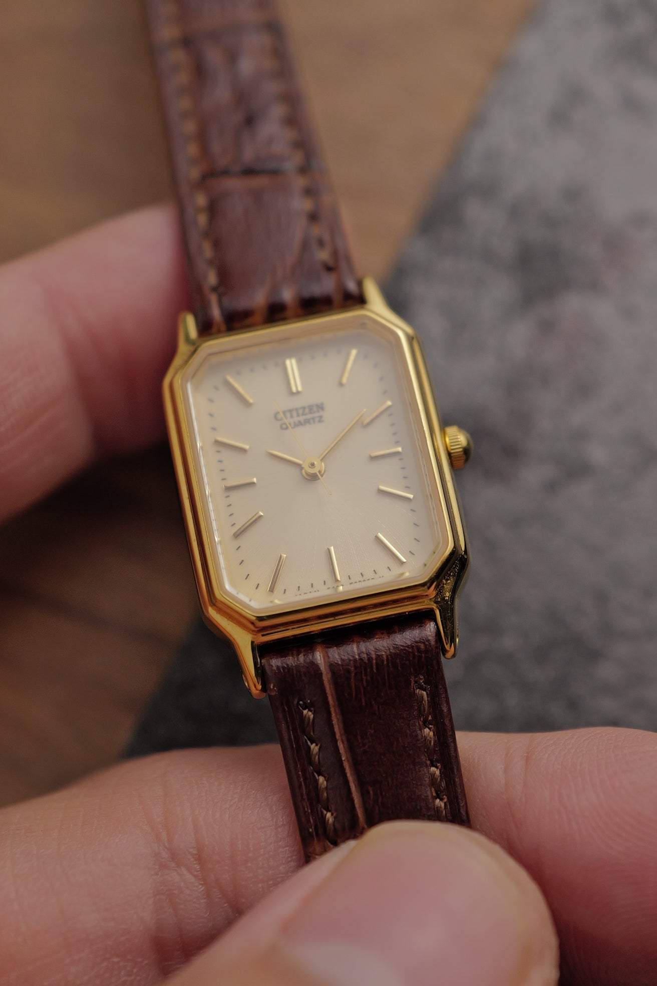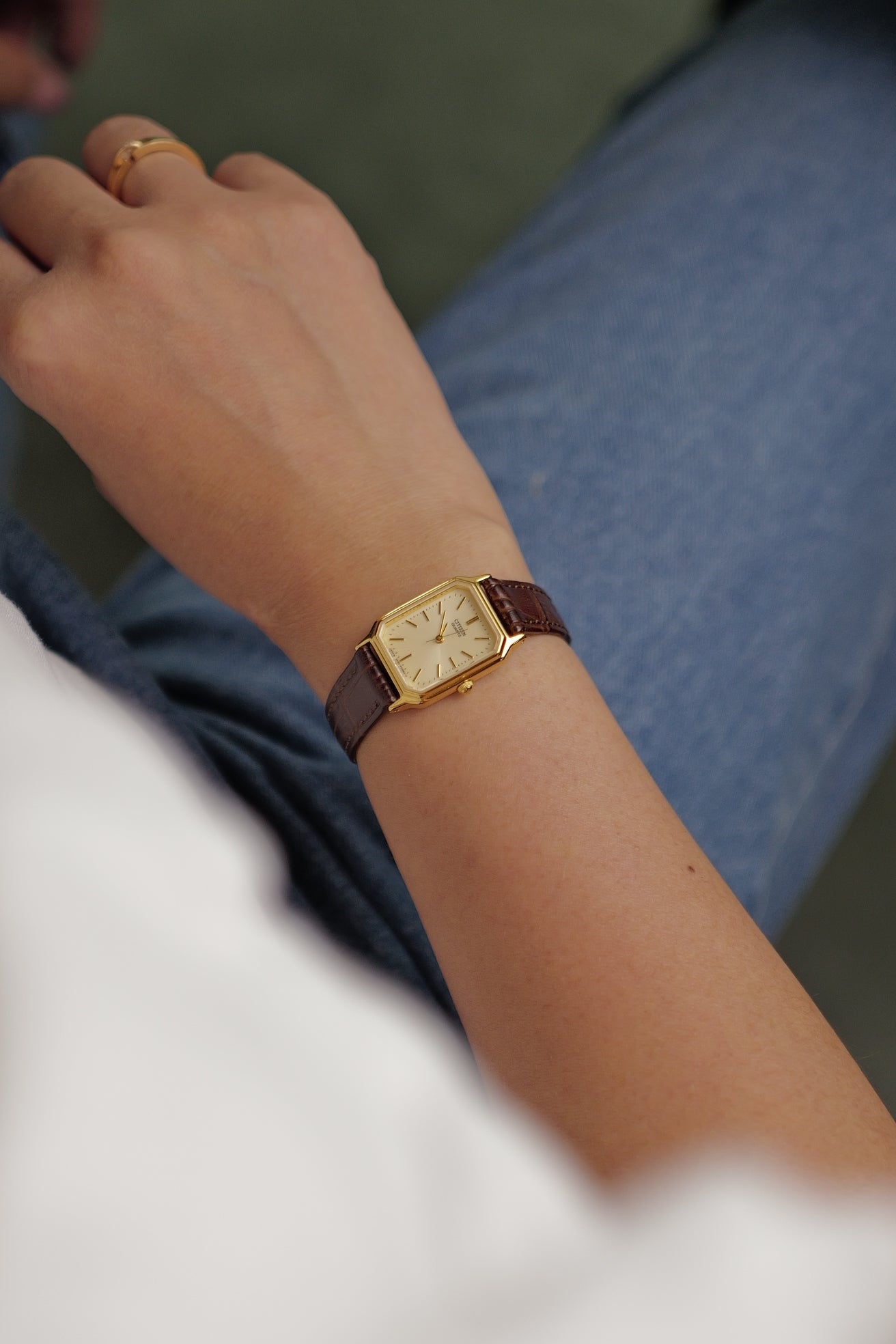 A hexagonal-esque tank gold-tone case with sharp facets and polished finish. The dial is very gorgeous, if you look closely its actually a sunburst champagne finishing with applied baton indices and thin gold pencil hands. comes attached with a new after market strap and buckle. |