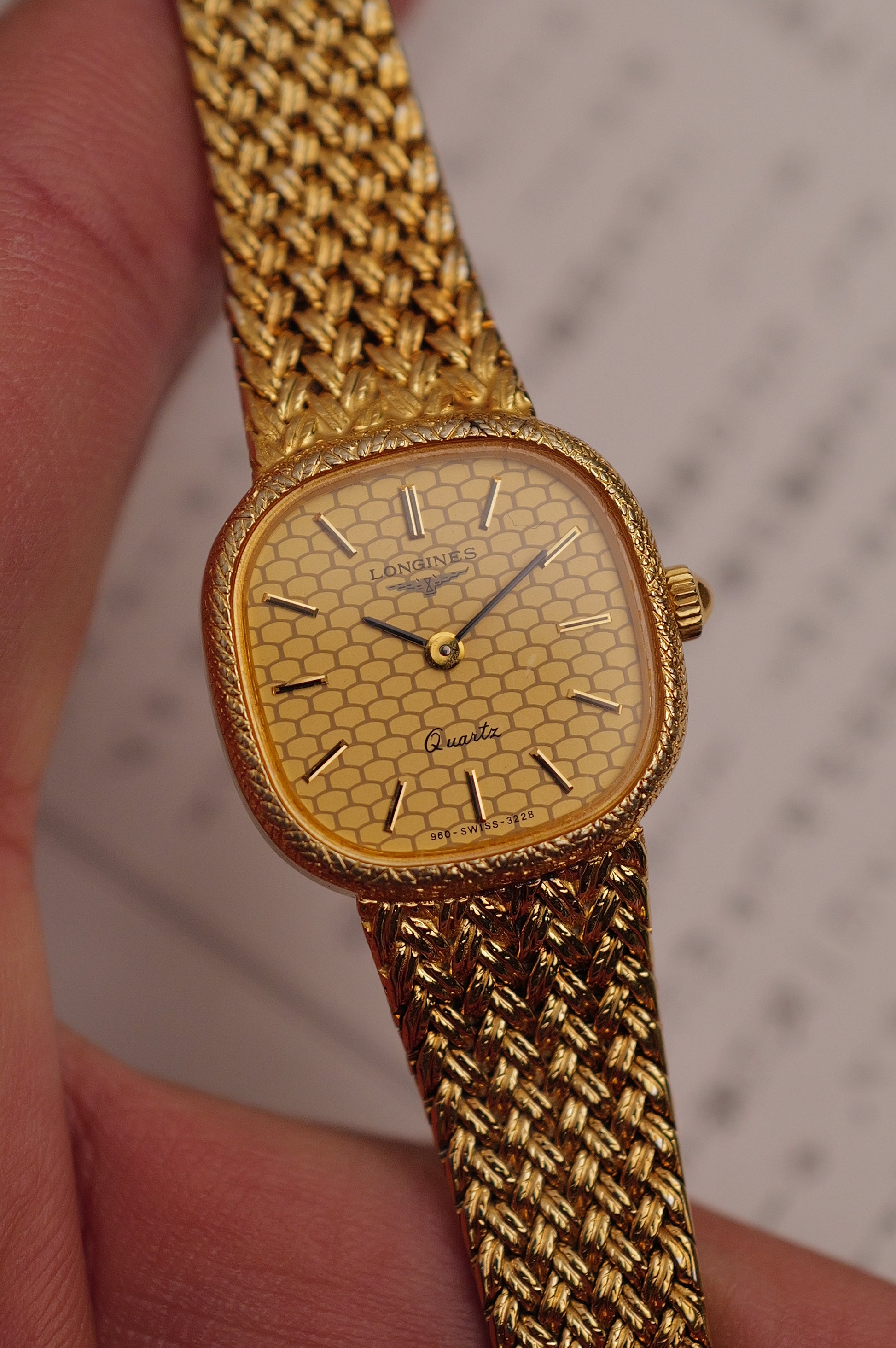 | Watch Summary | This watch immediately catches my eye with its Honey comb textured dial which gives the piece a uniquely elegant shimmer without being overpowering. The case itself features an square shape with soft edges and a minimalist layout , not to mention the most striking aspect of this piece is the woven gold-tone integrated bracelet, |