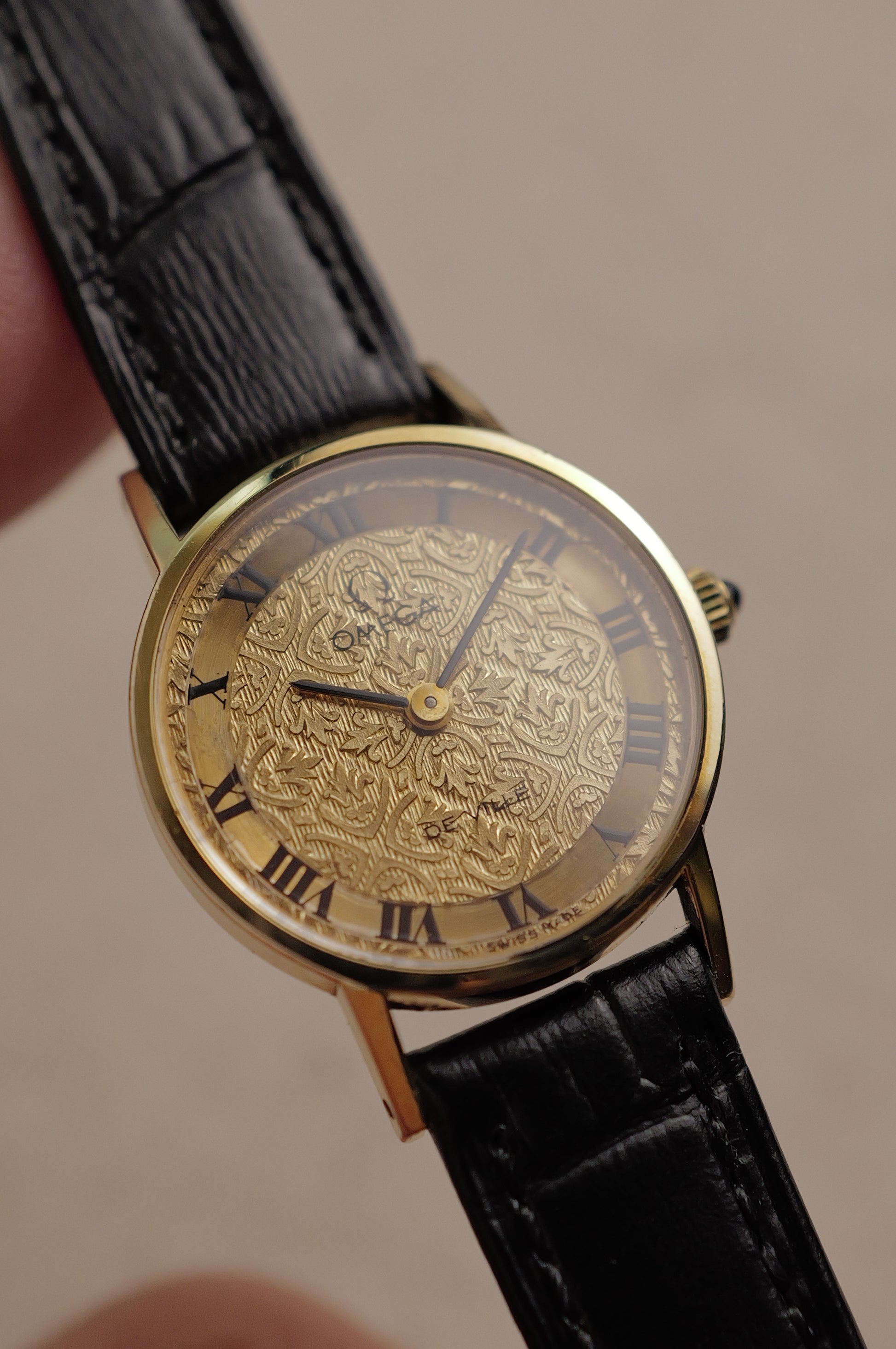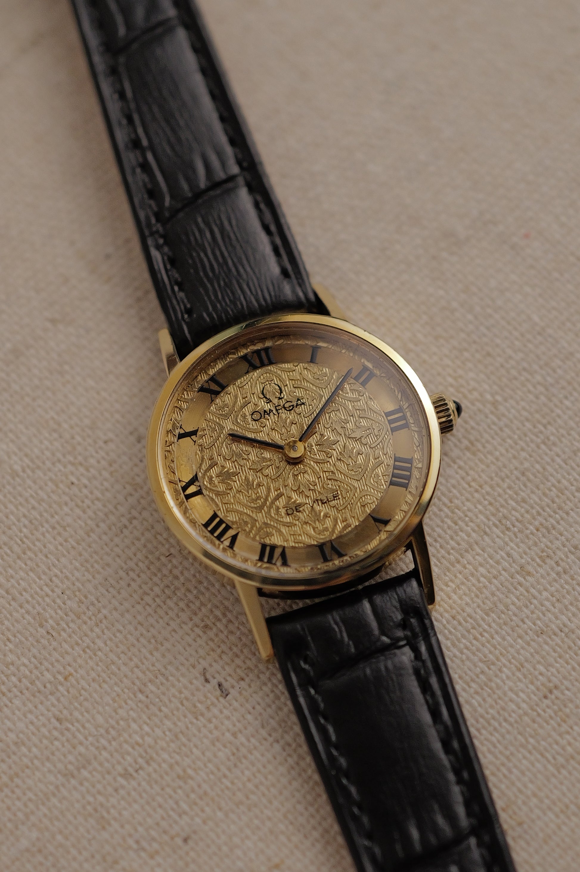 A beautiful omega made during the 70s, with a beautifully stamped/engraved dial. Mini floral repeating motif patterns around the dial, complimented by its iconic roman numerals. internally, the Omega 625 watch movement was produced from 1973, acting as one of the workhorse movements from omega. watch movement has been regulated to a +-20s/day on average |