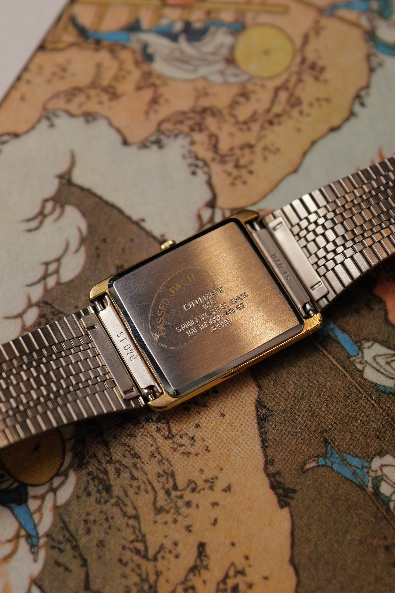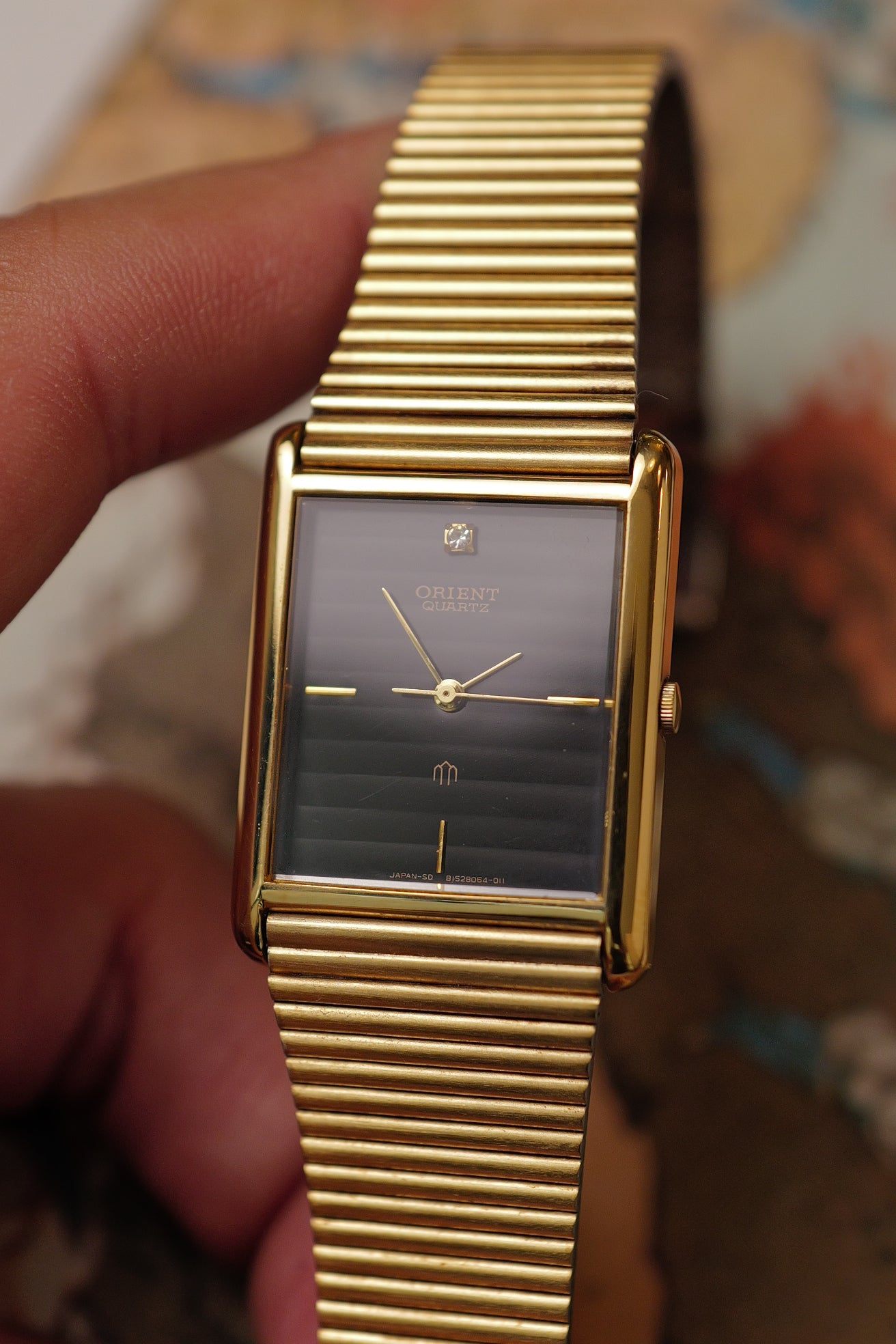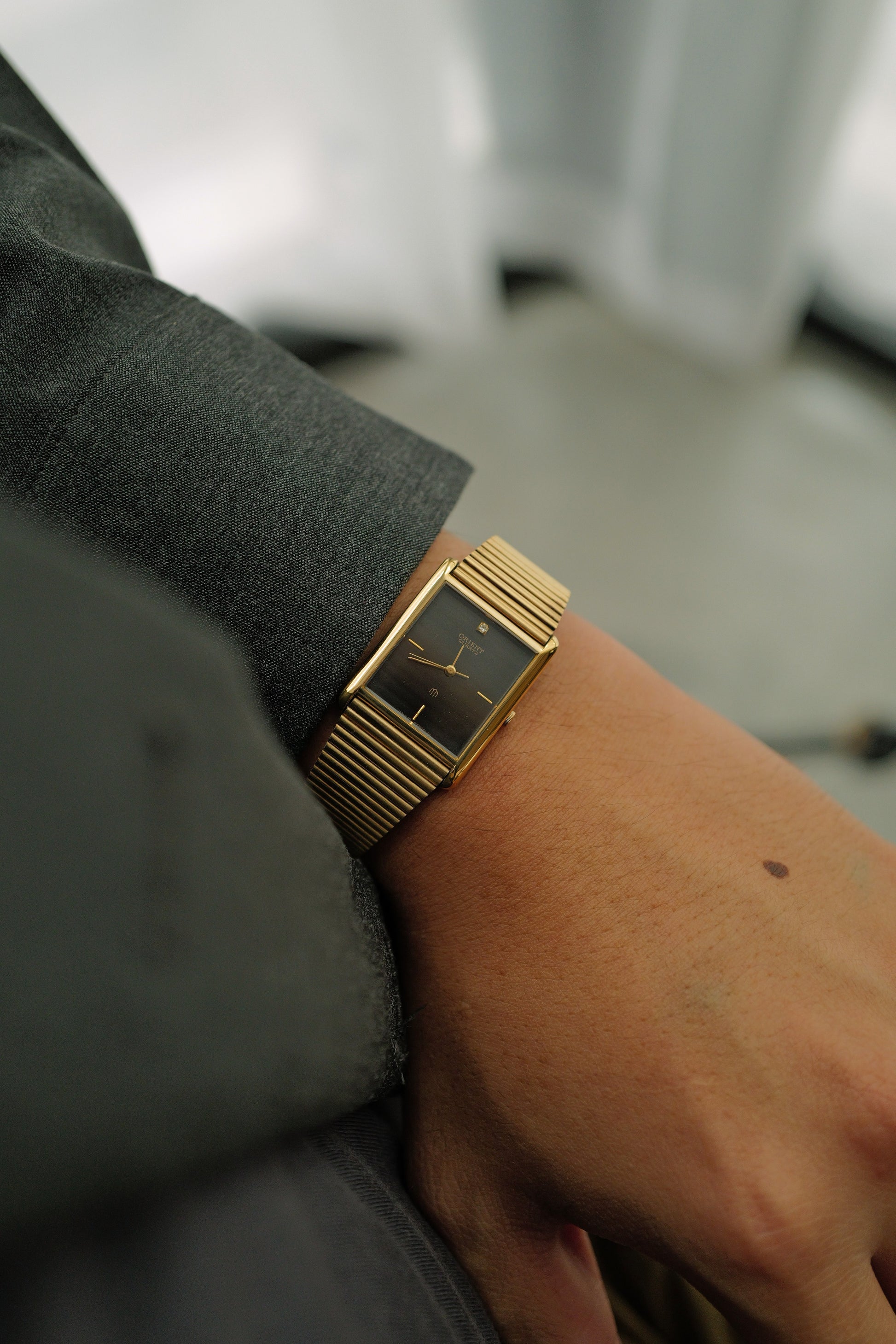 Another beautiful Display unit piece we curated from thailand. An orient Tank with a very unique stripe dial design, partly reflective, partly matte. From specific angle it looks like a black dial, yet some angles you see the alternating grey lines. An gold adjustable bracelet for all wrist and convenience in fitting all wrists.