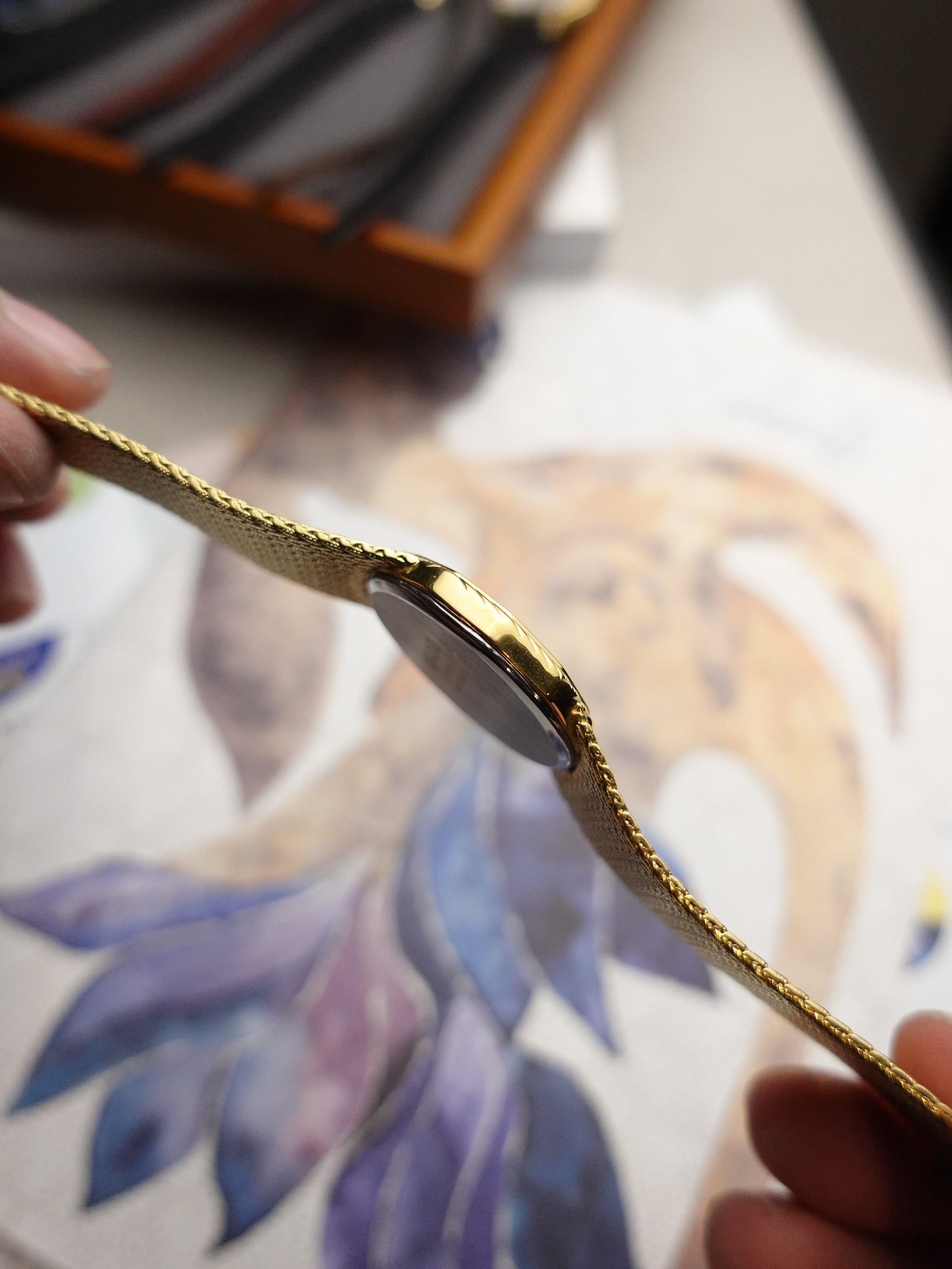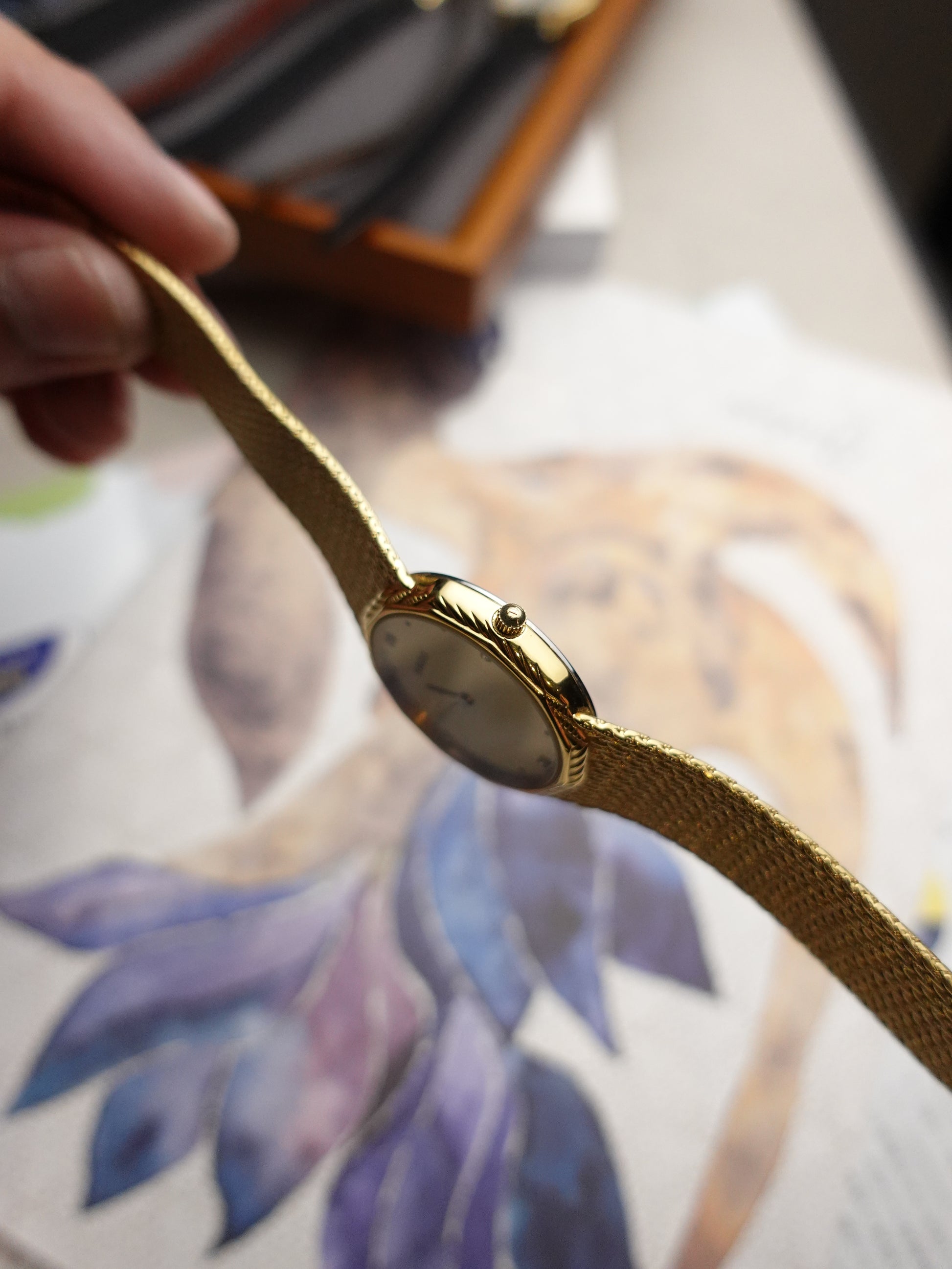 a near pristine condition gold rado with integrated bracelet. max wrist at 18.4CM, bracelet does require cutting to fit.