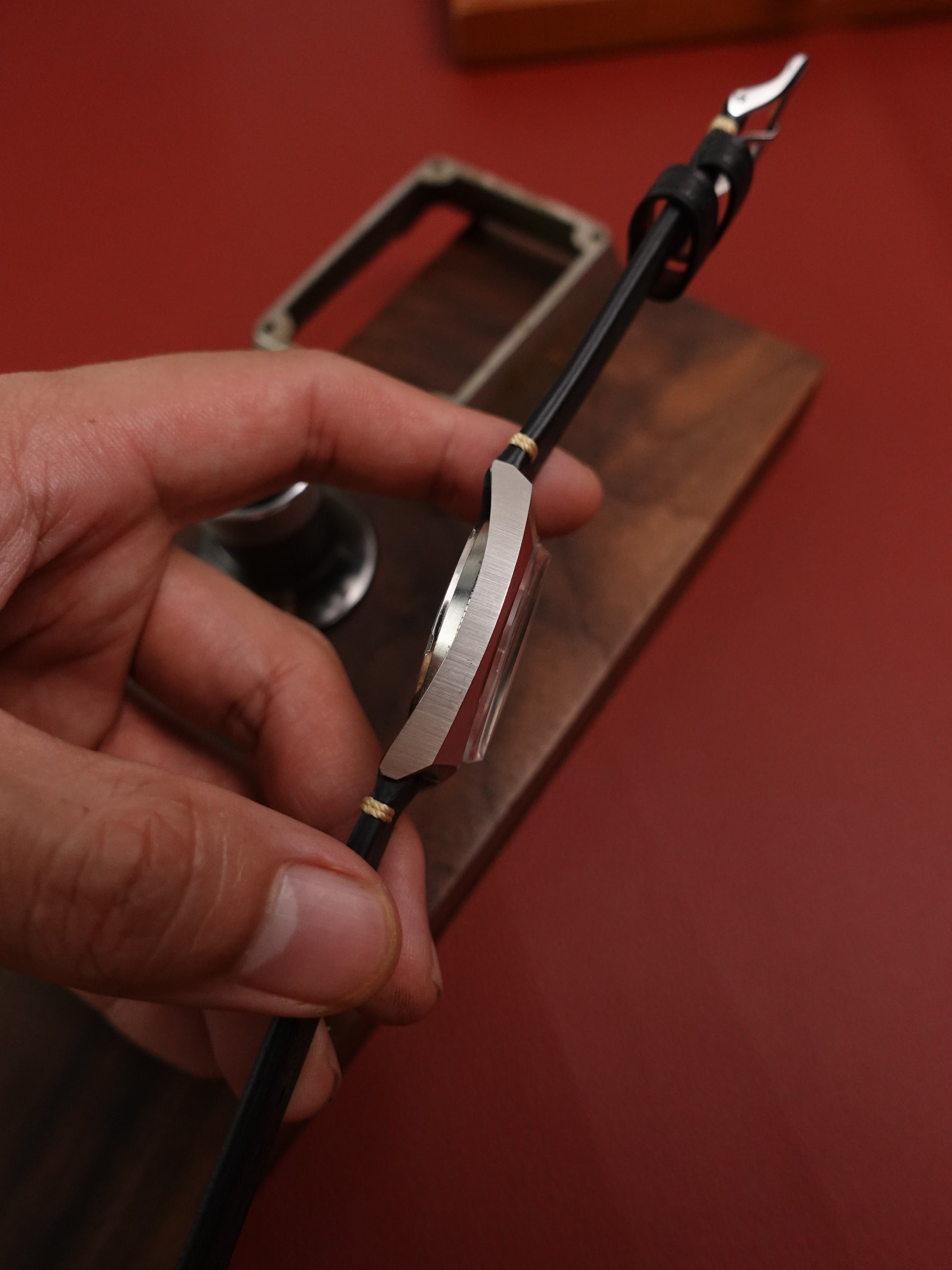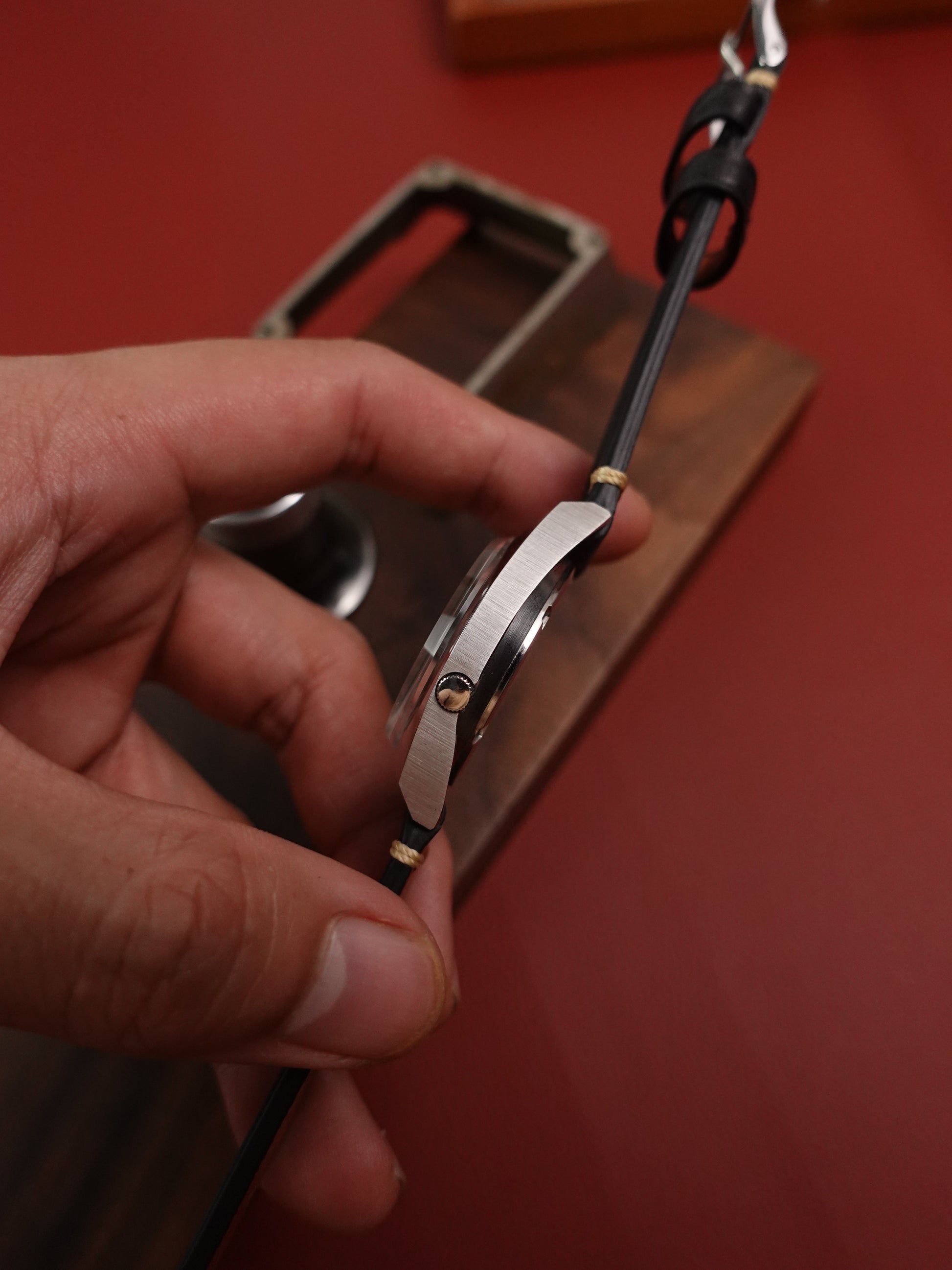The acrylic glass is in excellent condition, with close to no blemishes. Case has very minor hairlines on the polished side, brushed size is essentially new. Comes attached with a leather strap as shown. Date and day window moves without any issue.