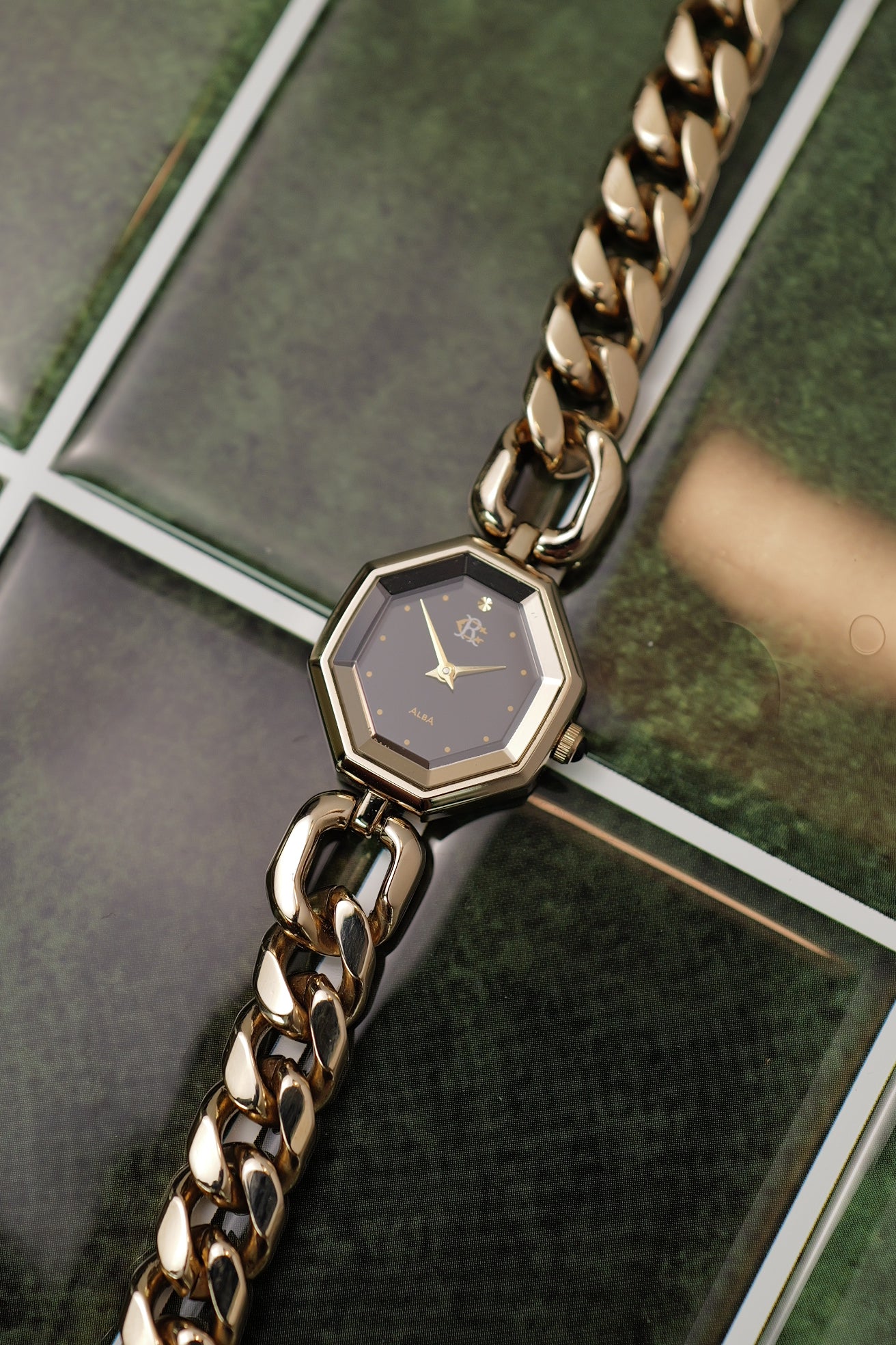 An unique seiko alba octa with a cuban chain inspired design. Extremely beautiful as it essentially acts like a bracelet than a watch. Meant to wear on the loose side as the cuban chain isnt adjustable (but the end clips are!). A convex glass which in the same time is faceted, and a black dial which just blends completely into the gold/black combo on this specific watch.