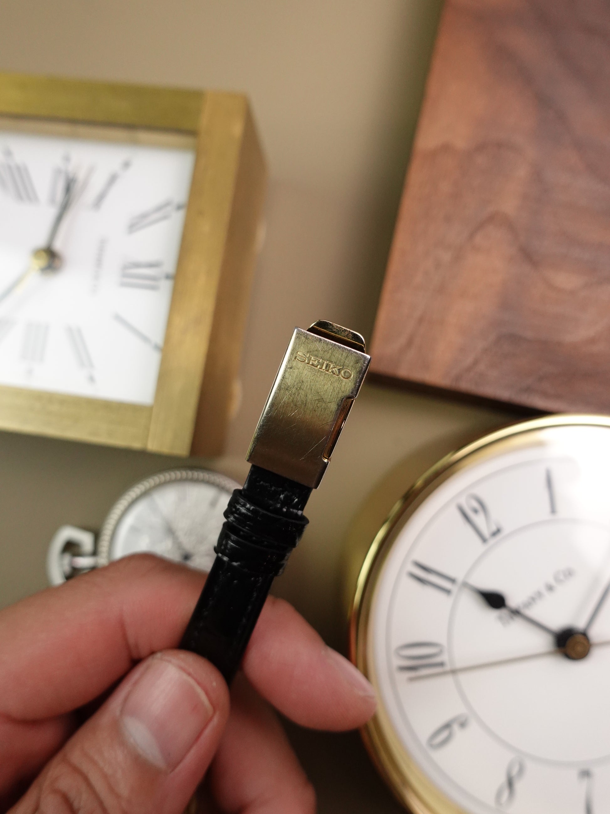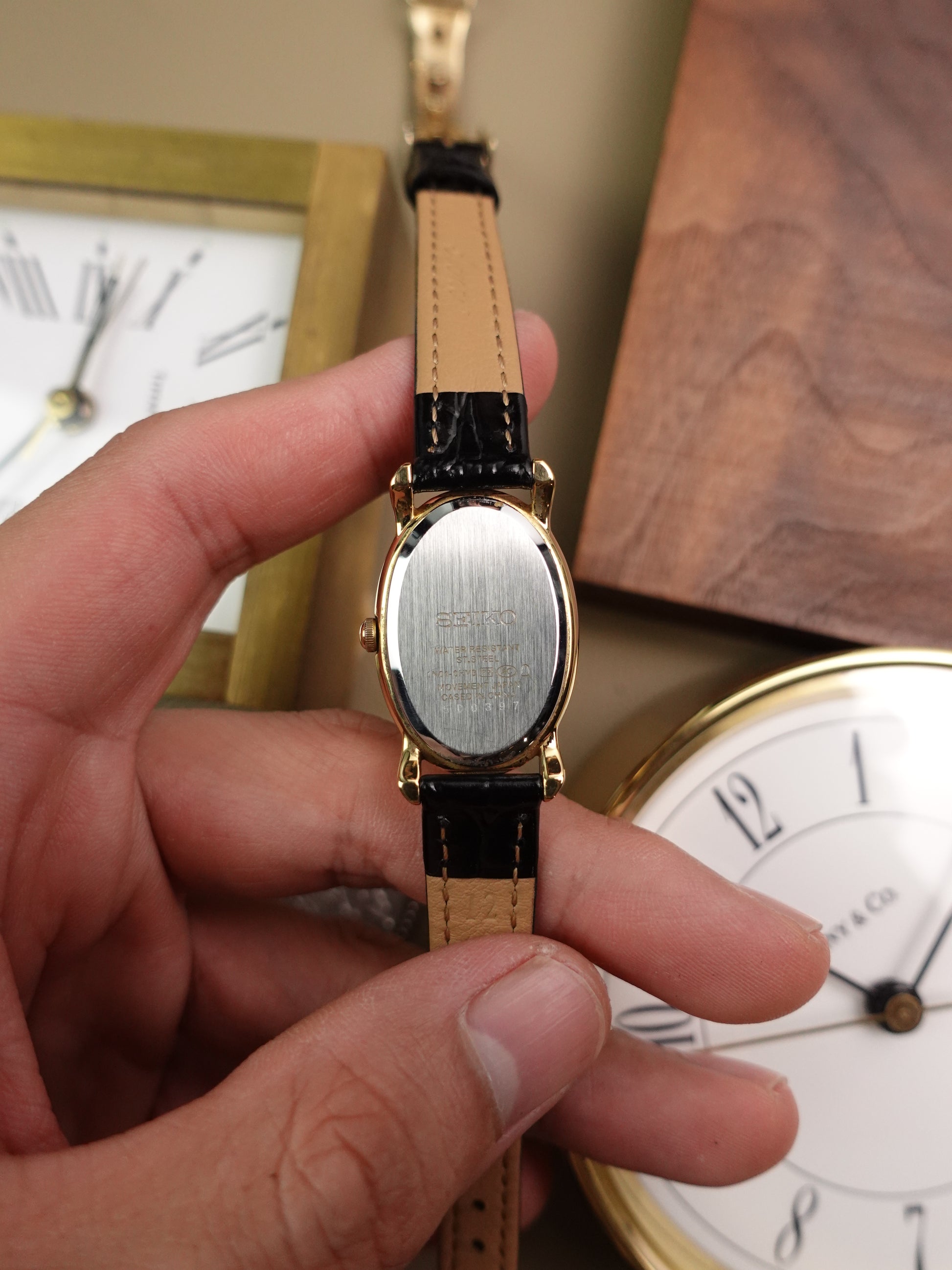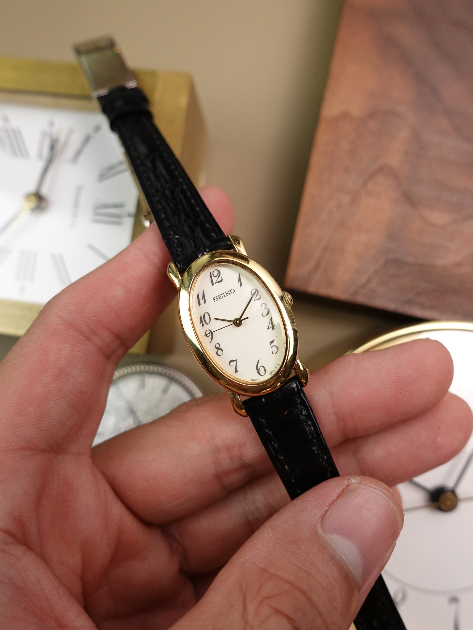 A Late 90s seiko baignoire with a variation of the arabic numerals. rounder and bigger than the normal baignoire seiko which we usually list, this variation comes with its original clasp as well!