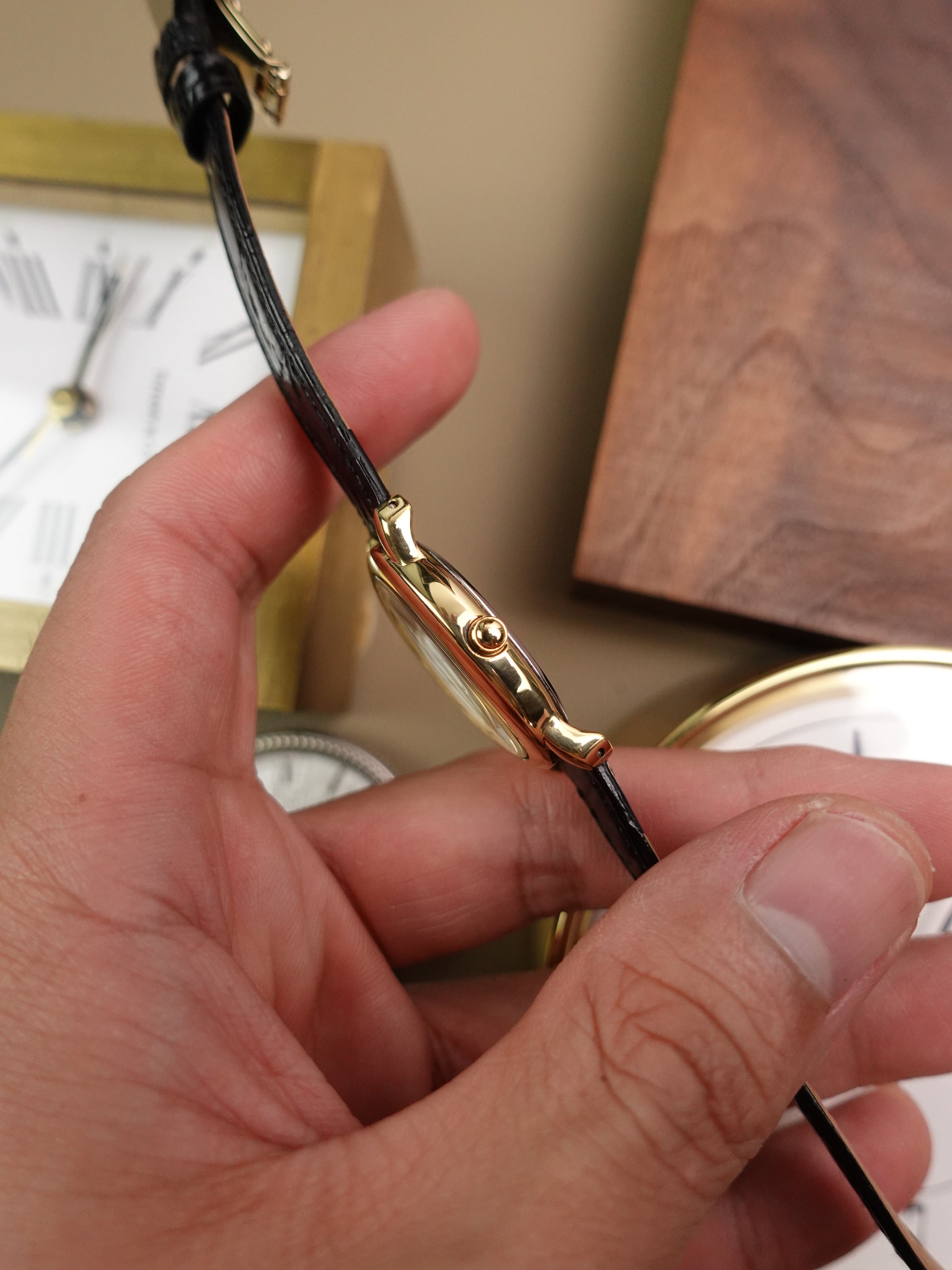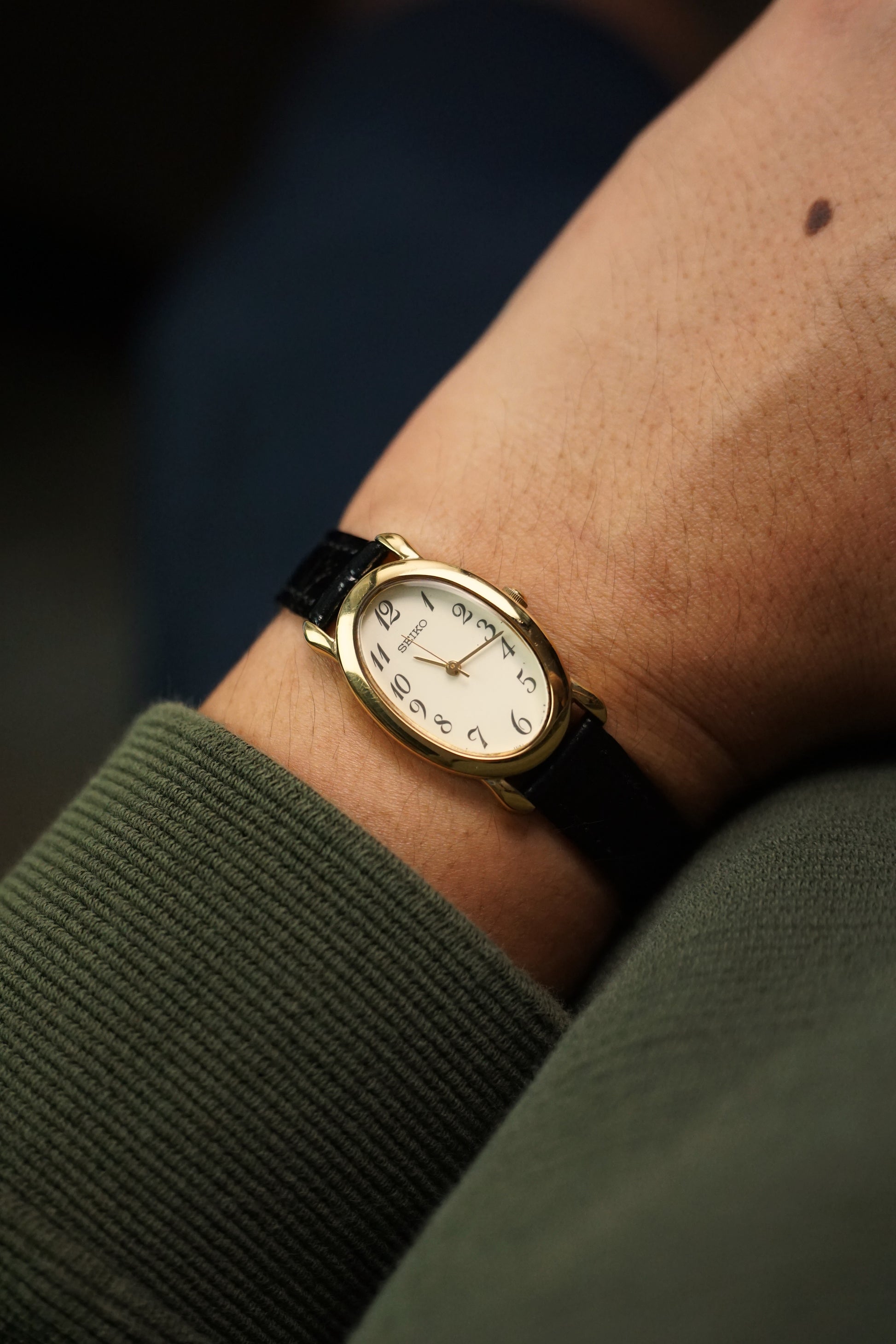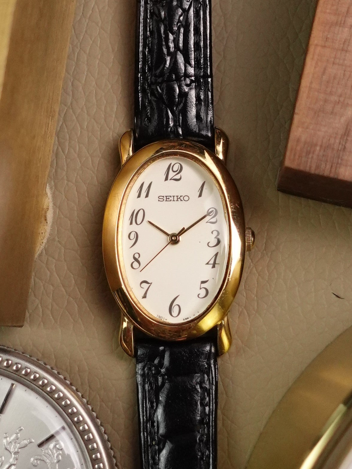A Late 90s seiko baignoire with a variation of the arabic numerals. rounder and bigger than the normal baignoire seiko which we usually list, this variation comes with its original clasp as well!