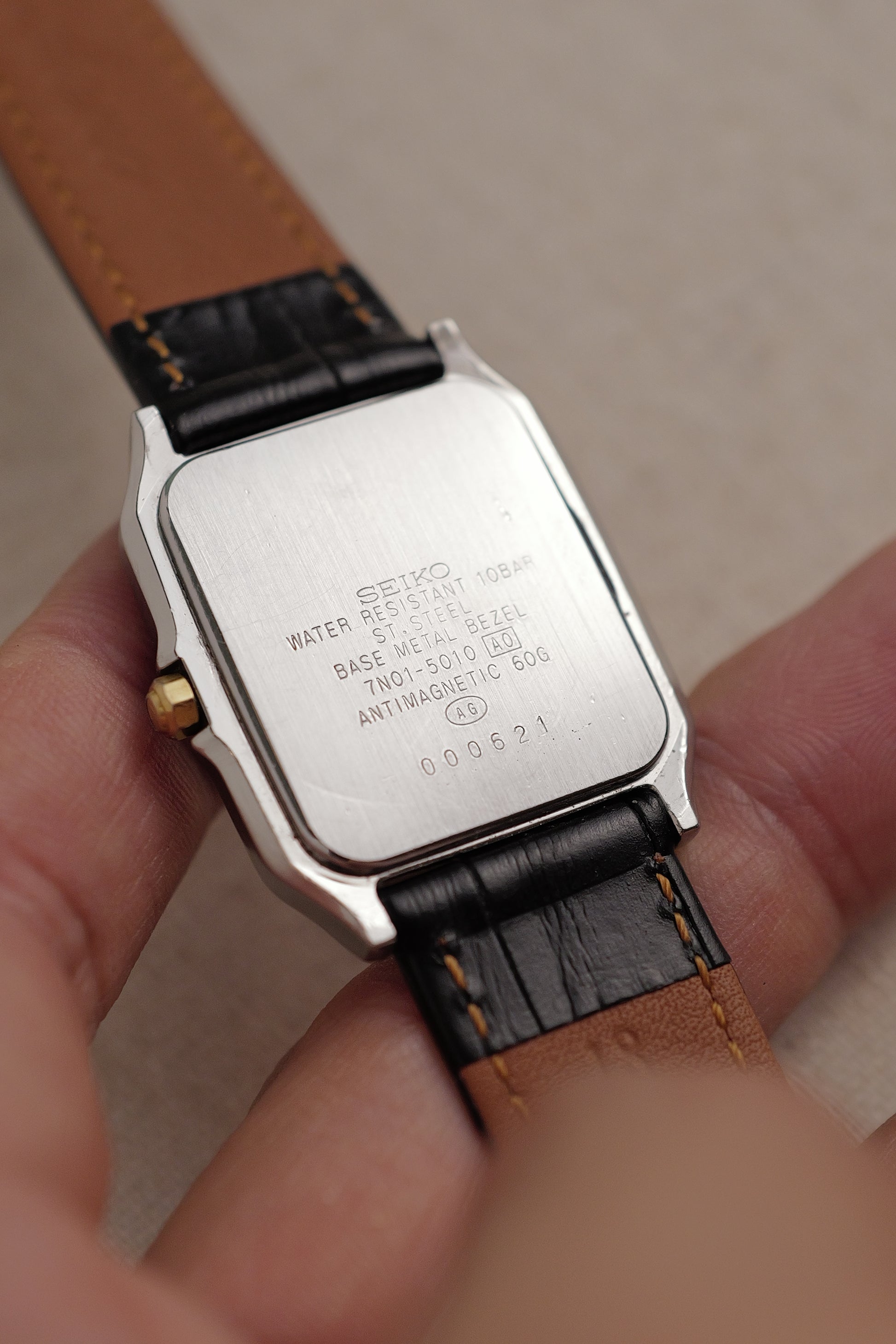 | Watch Summary | The Seiko Cadet 7N01-5010 is a classic vintage quartz watch produced in the late 1980s to early 1990s, known for its minimalist aesthetic and similar resemblance to the ever famous Cartier Santos. More than its resemblance to Cartier Santos , is its own uniqueness and personality. This particular model features a rectangular, slightly curved case with soft edges and a clean, understated dial. |