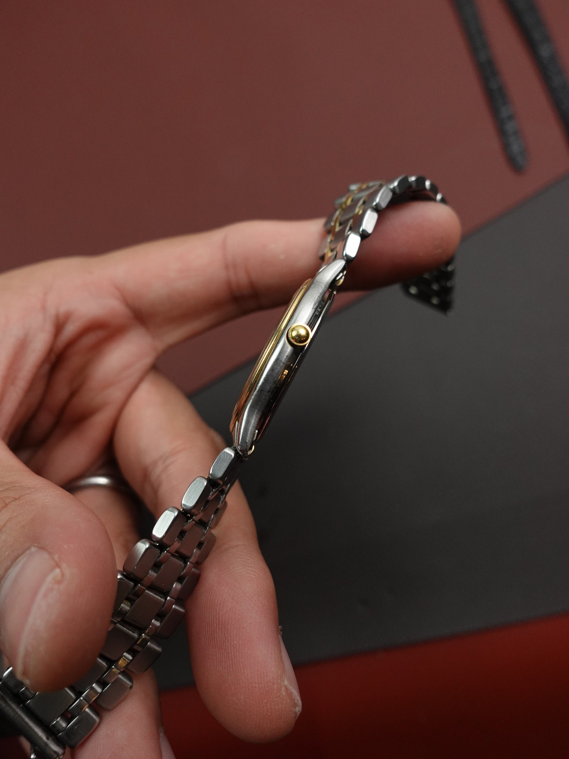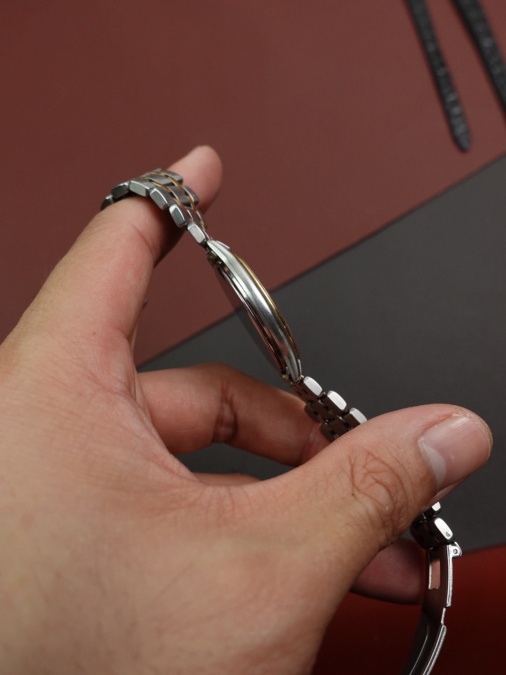 The contemporary Basic series, known to be their high end quartz series for accuracy and reliability. This model is extremely unique, coming with a day date function on the 6 o clock, with a special typography as well. An cream-like dial colour brings the vintage look in full effect! This piece comes with a rare original bracelet which fits up to 18cm.