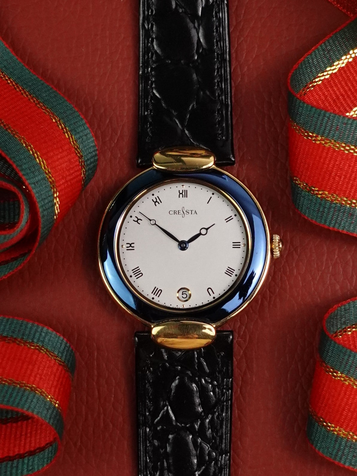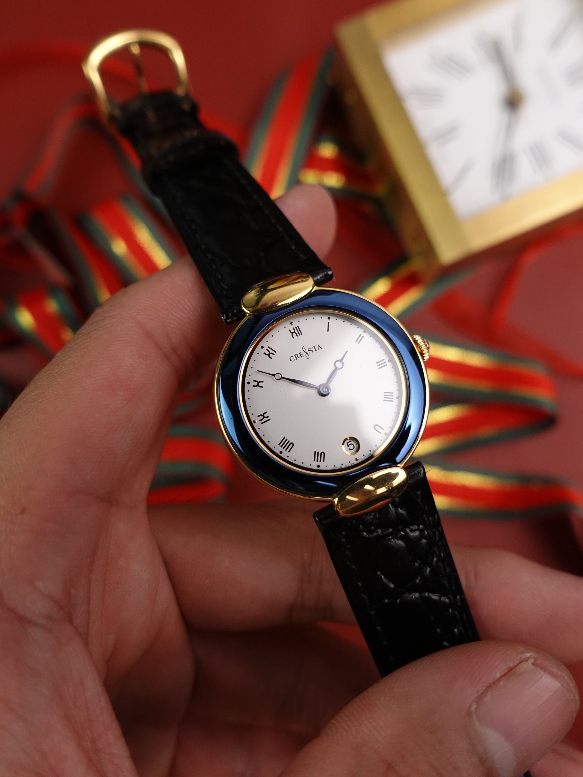 You wouldn't have known if i didnt say... its a seiko! the Cresta series from the early 90s. with Classy and Dressy in mind, the watch screams elegance! a very beautiful glossy blue dial, with a unique font numeralisation. And come on.. breguet hands?! This piece has all the points of a classic.
