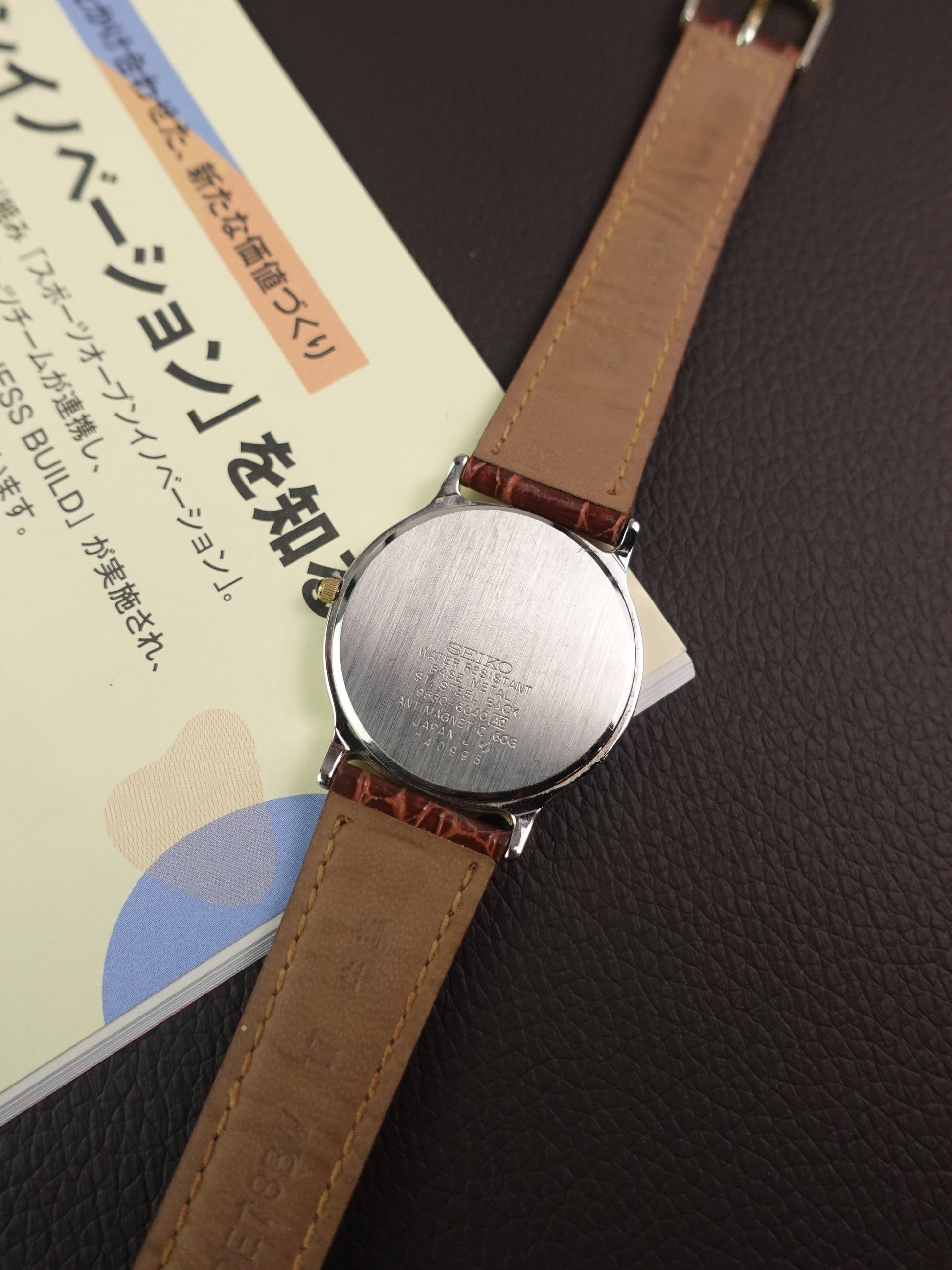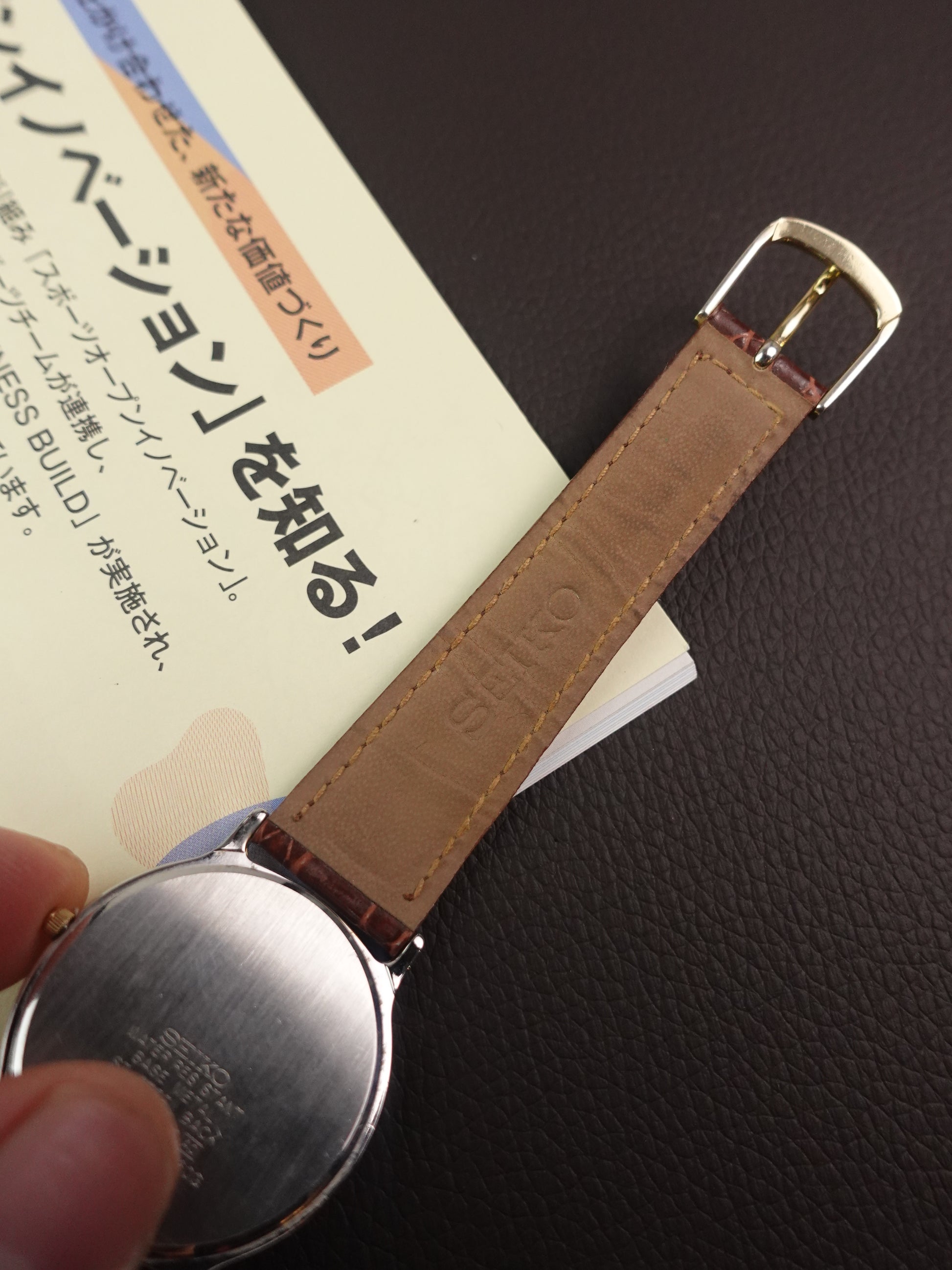 This variation is in excellent condition, without dial corrosion or glass scratches. The watch comes in an original Seiko strap and a gold buckle