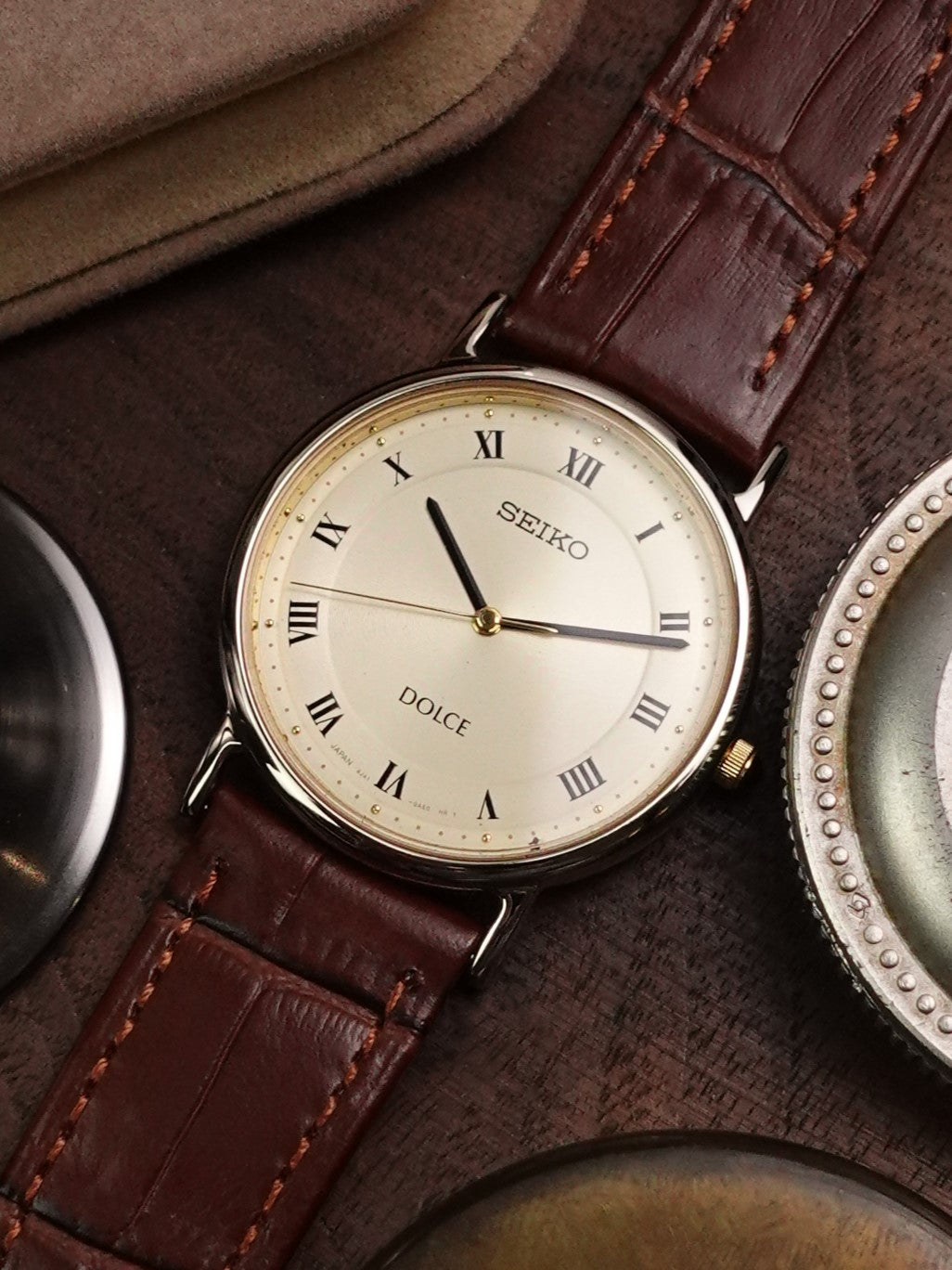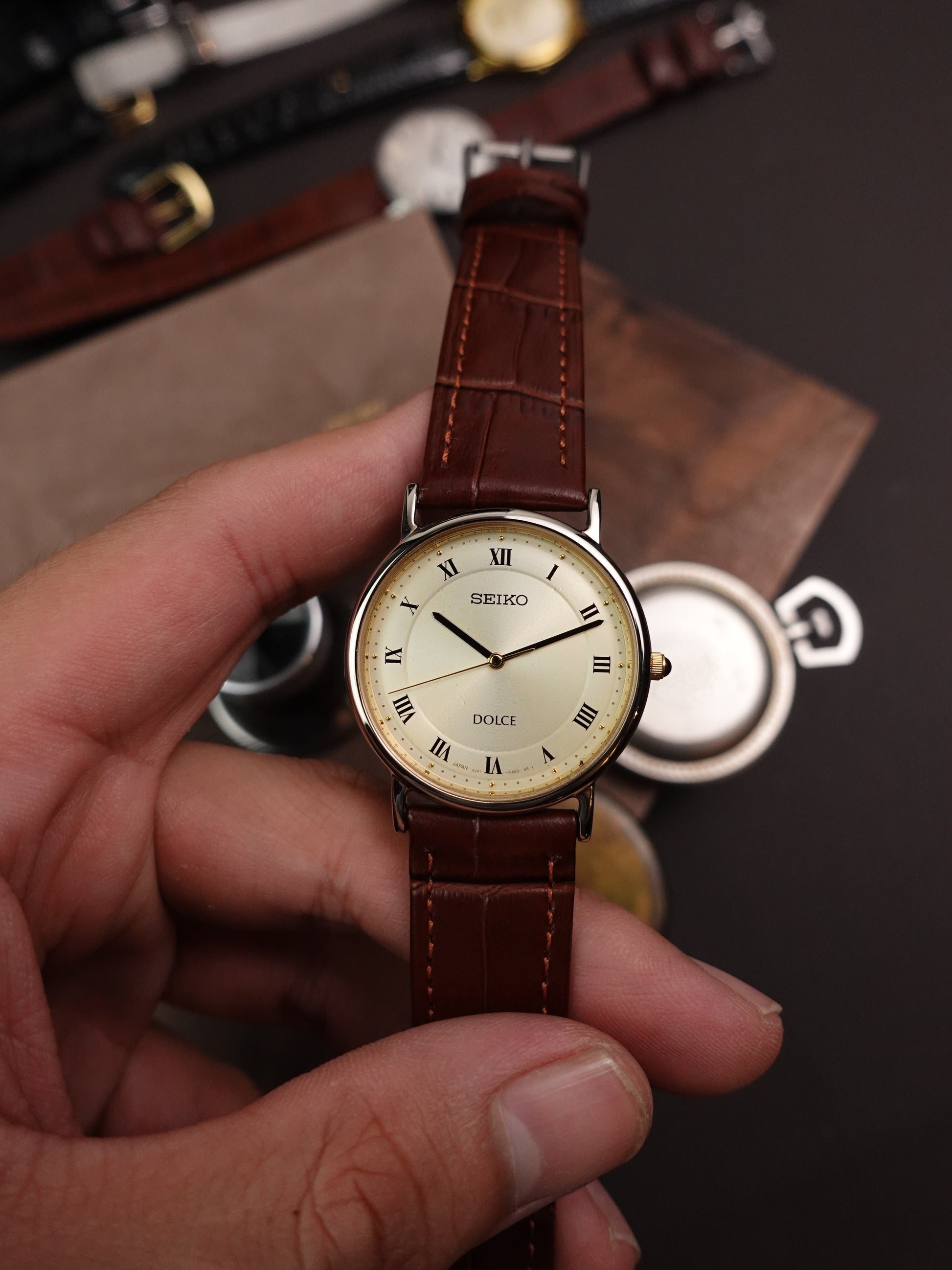 The dolce from this period were the top of the line products on the seiko catalogue, and they didnt come cheap! costing around 2k MYR to 3k MYR on average. You will notice the design is more exaggerated, big DOLCE wording (compare to dolce), a sunburst dial finishing (than a textured), and small roman numerals.