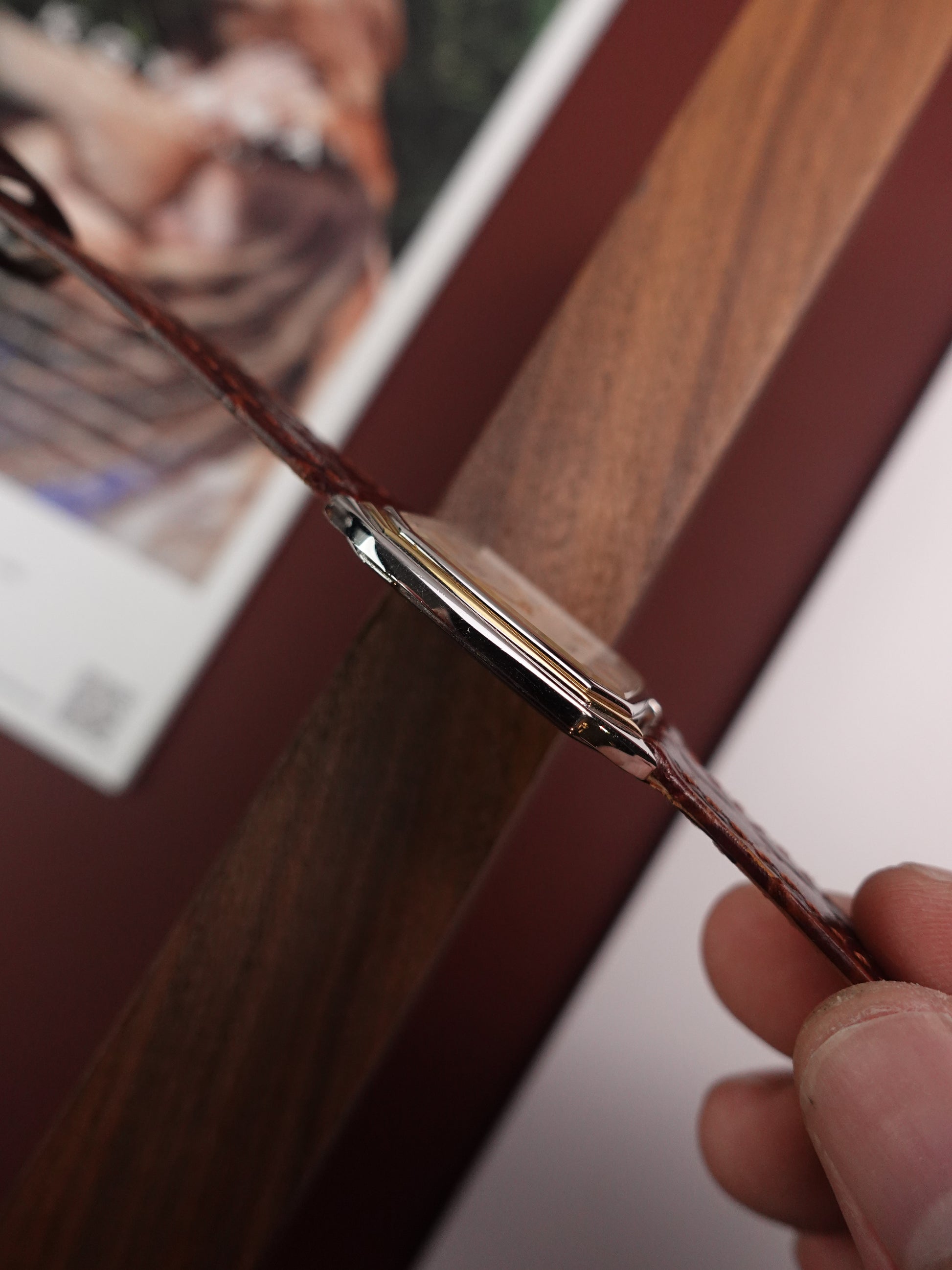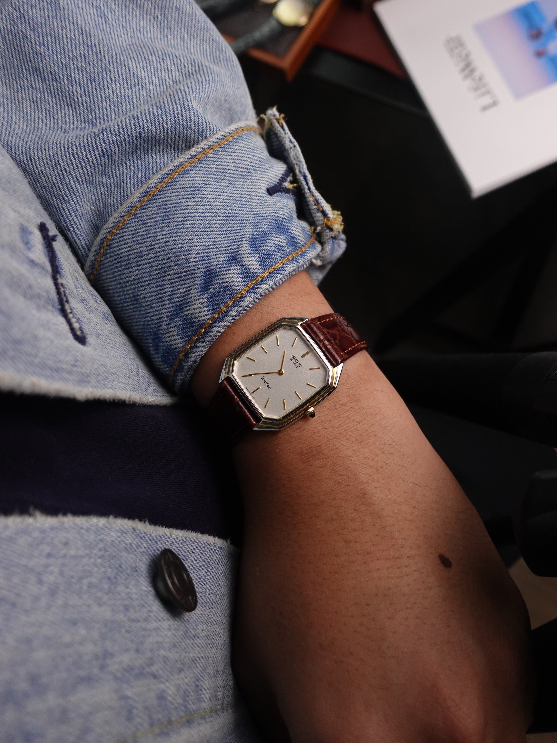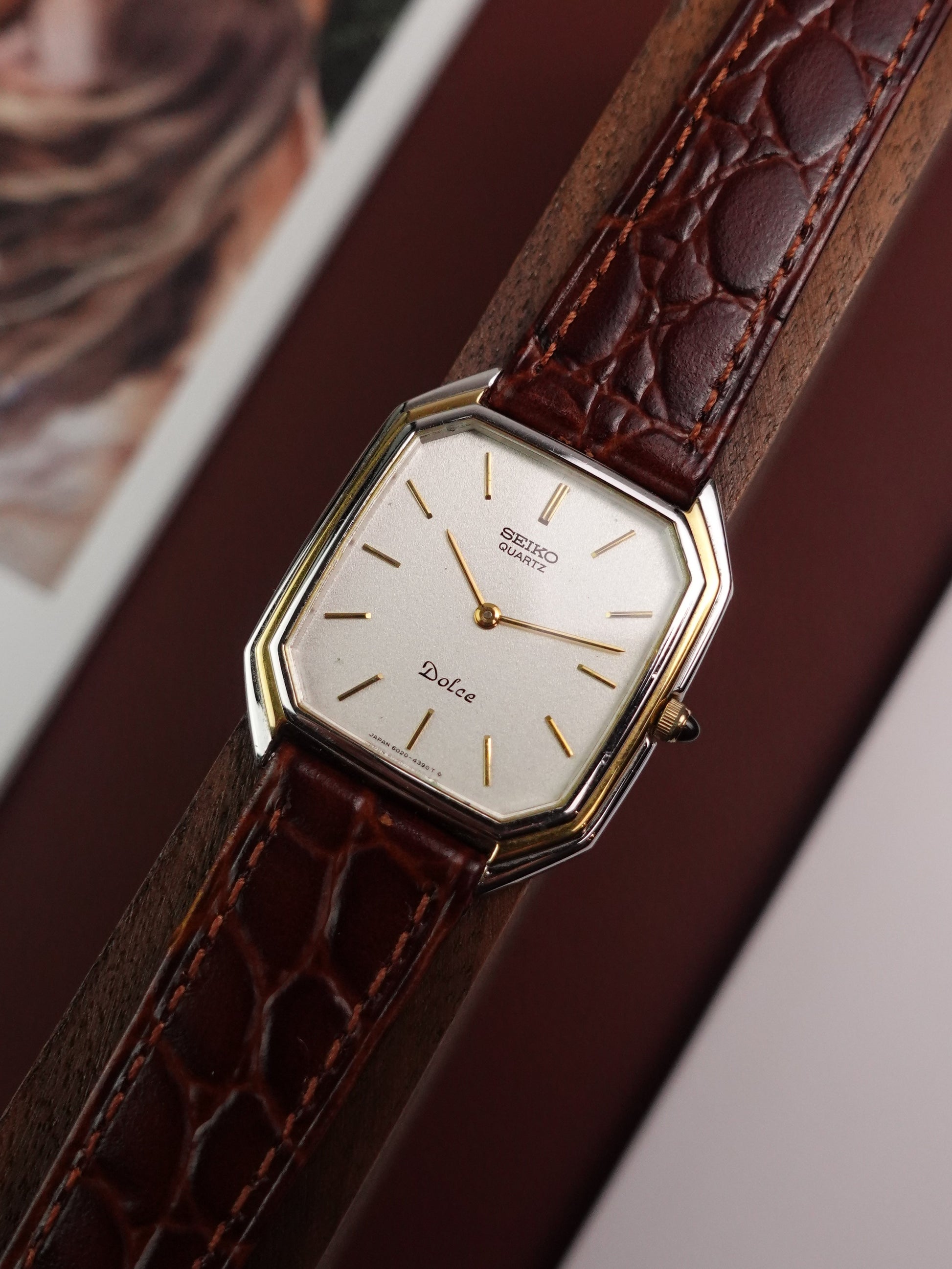 A Step Case Dolce From the early 80s, referenced on the 6020 movement. Comes with a unique case material, a combination of PDP (Palladium) and SGP (Gold plating) coating.
