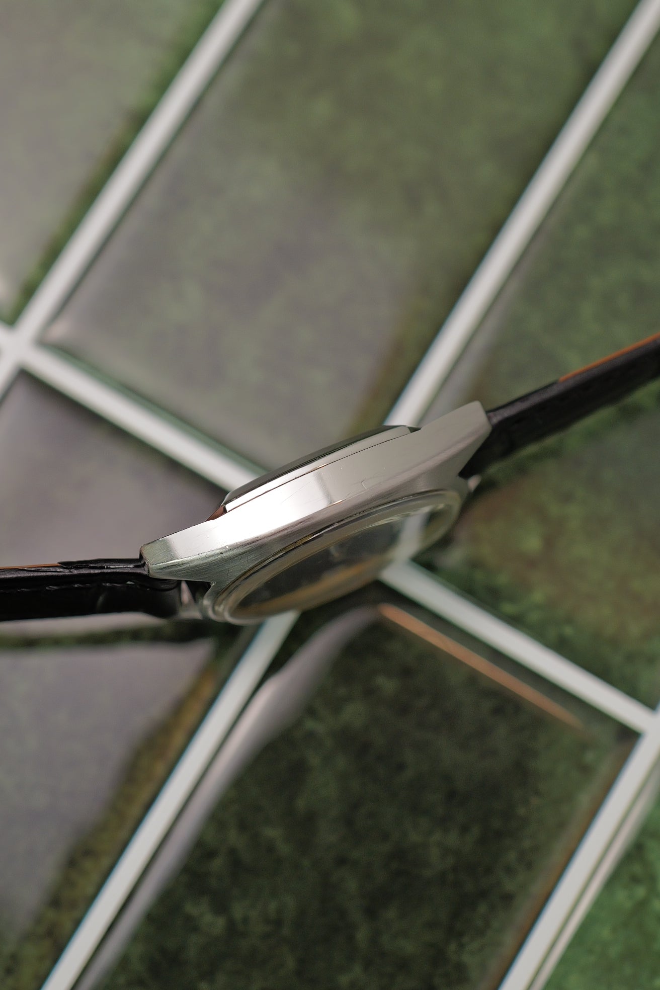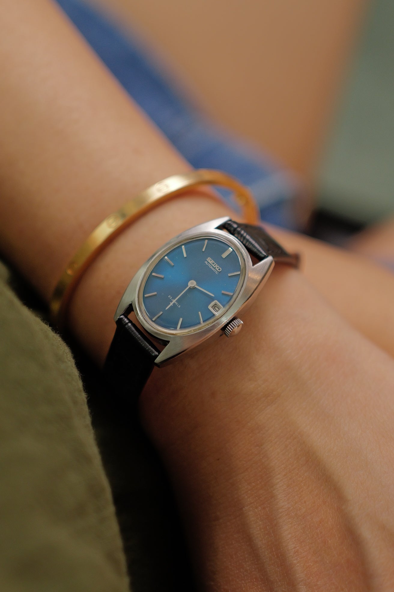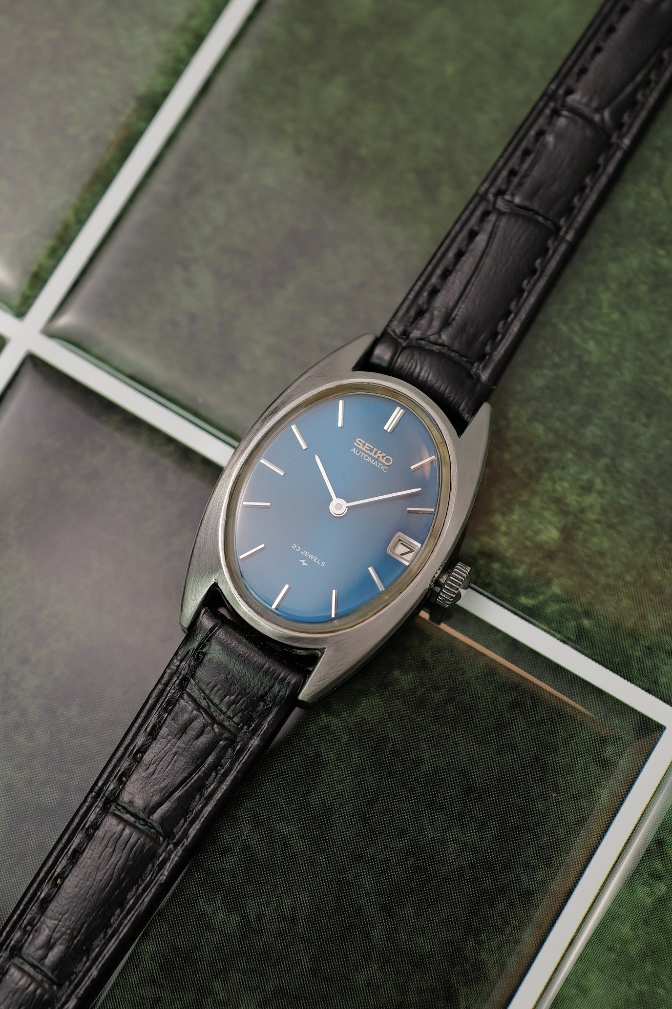 A very quirky blue seiko automatic we have in stock today! A softly brushed, oval-shaped case is pure 1970s space-age minimalism, a combination of both the ellipse and C-shape case configuration. No doubt my favourite part of this watch is.. the DIAL, rich, metallic blue, radiating brightly towards the acrylic glass