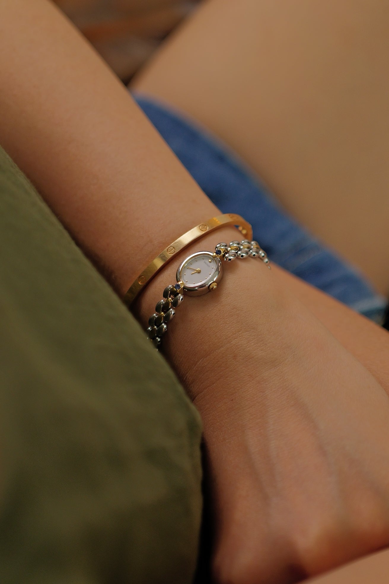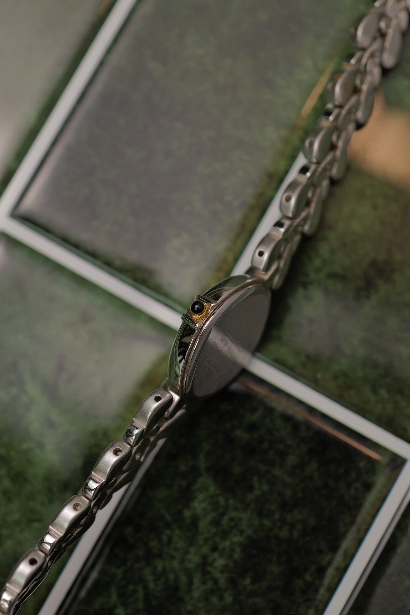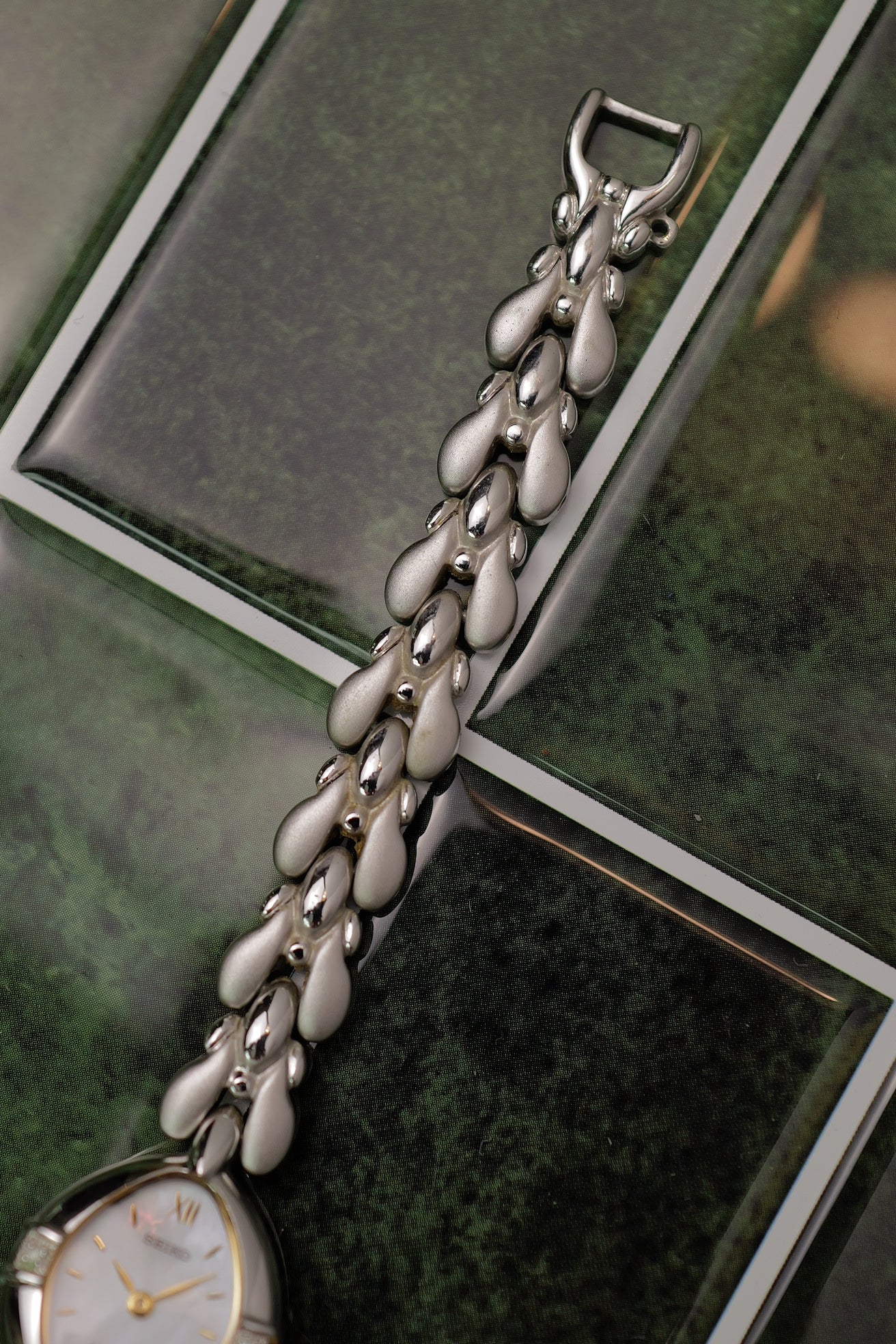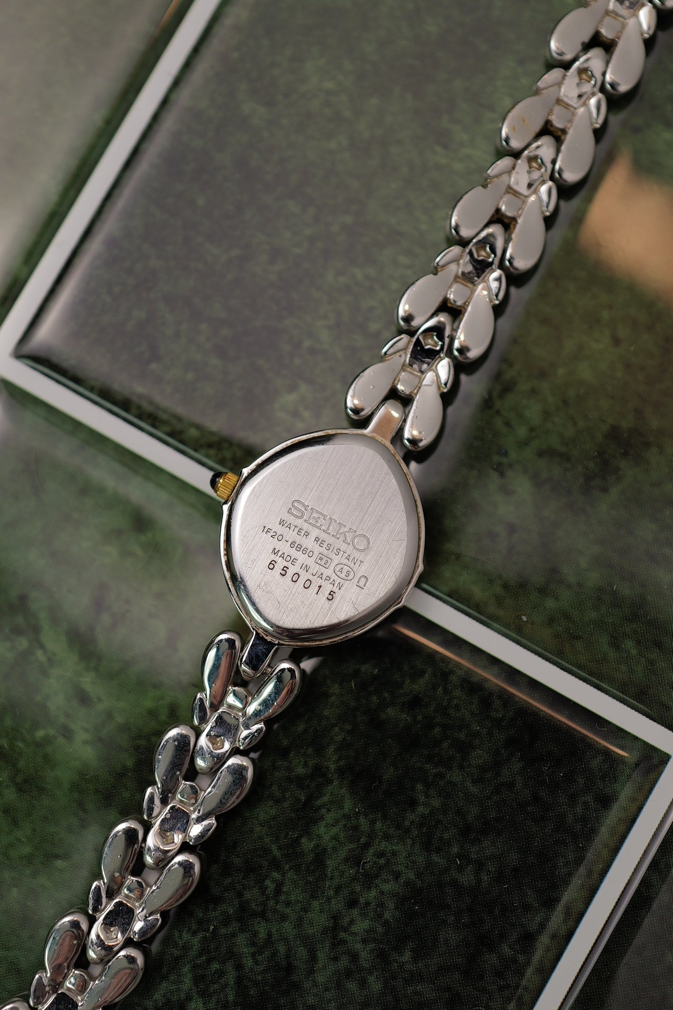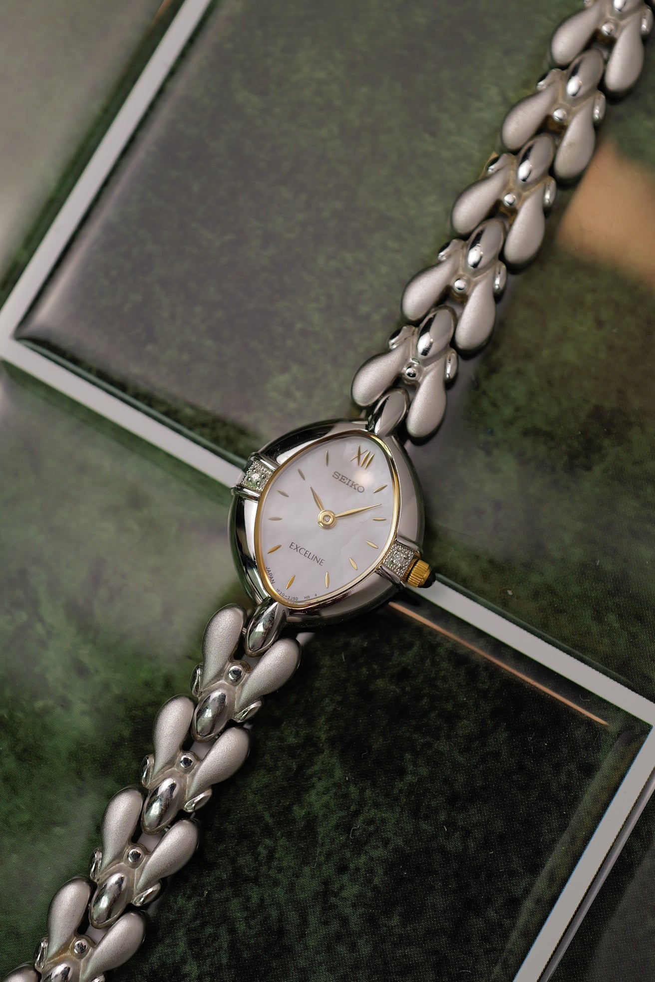 an oval shaped seiko exceline on a rare mother of pearl variation. This was the 90s when MOP was the trend, with seiko adapting more funky dials than sticking to the 80's yellowish patined dial. On flat ground it looks pear white but when viewed on an angle, its a light tint of rainbow mother of pearl.