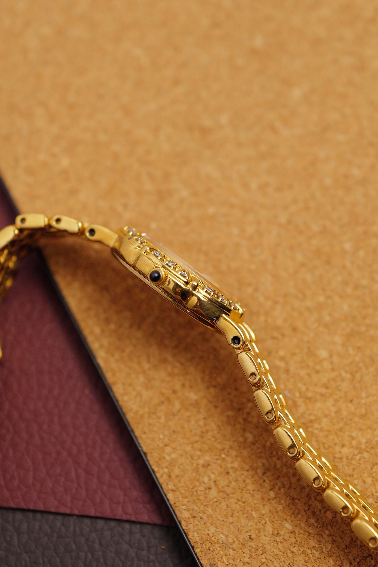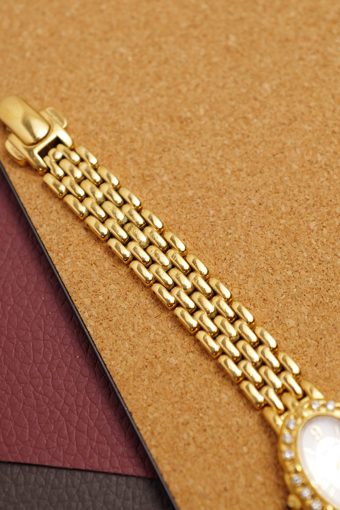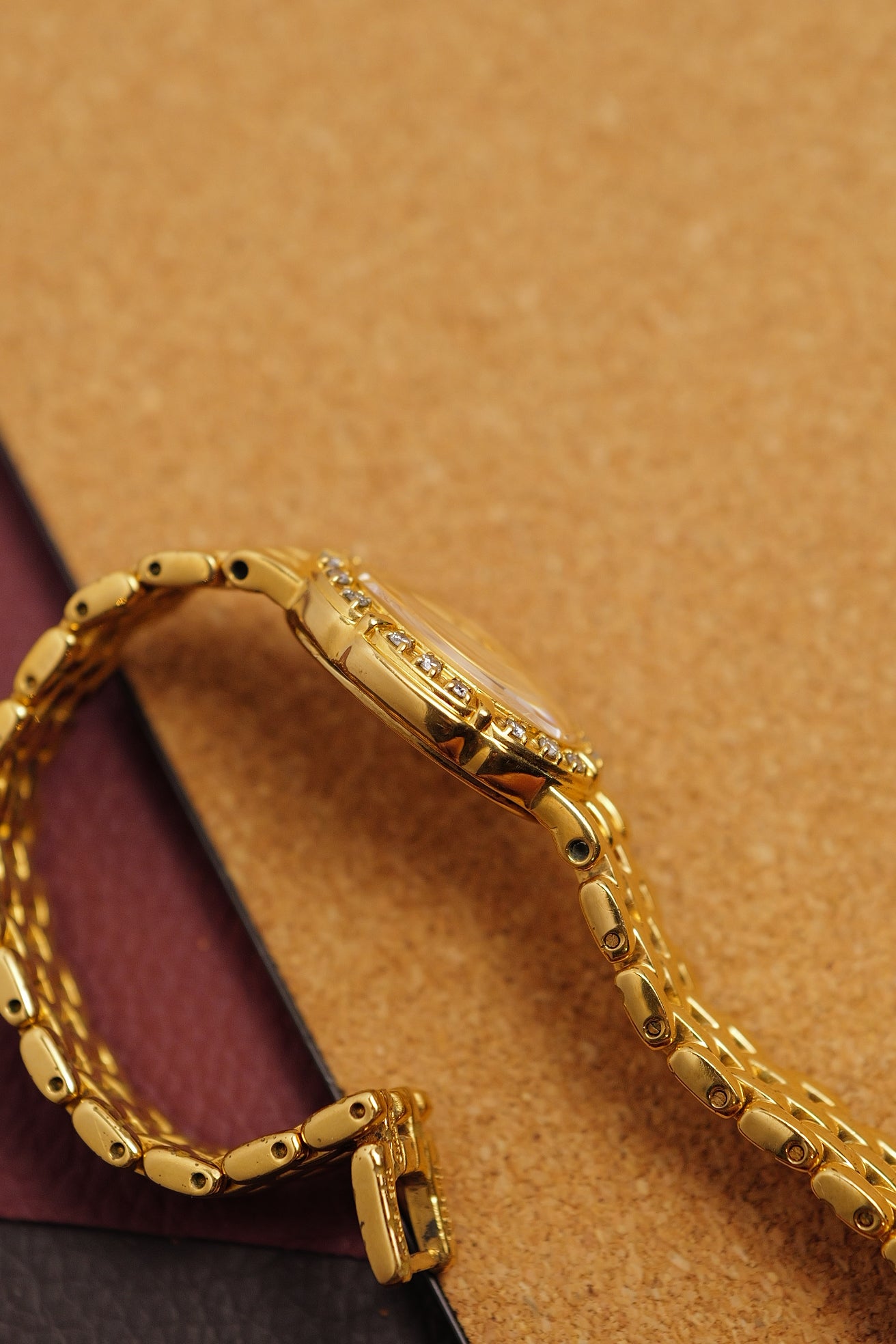 A rare Exceline women's vintage dress watch, which comes in a luxurious gold-tone finish. Features a beautiful oval shaped case with an eye catching diamond bezel . Further complimented by the mother of pearl champagne colored dial ,which adds to the overall aesthetic of the watch .