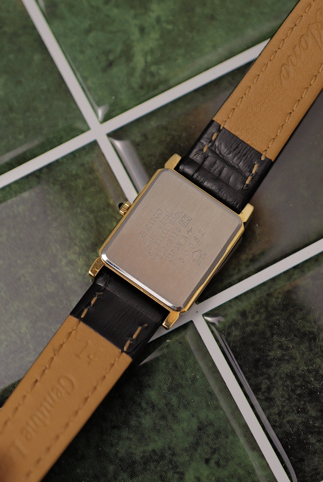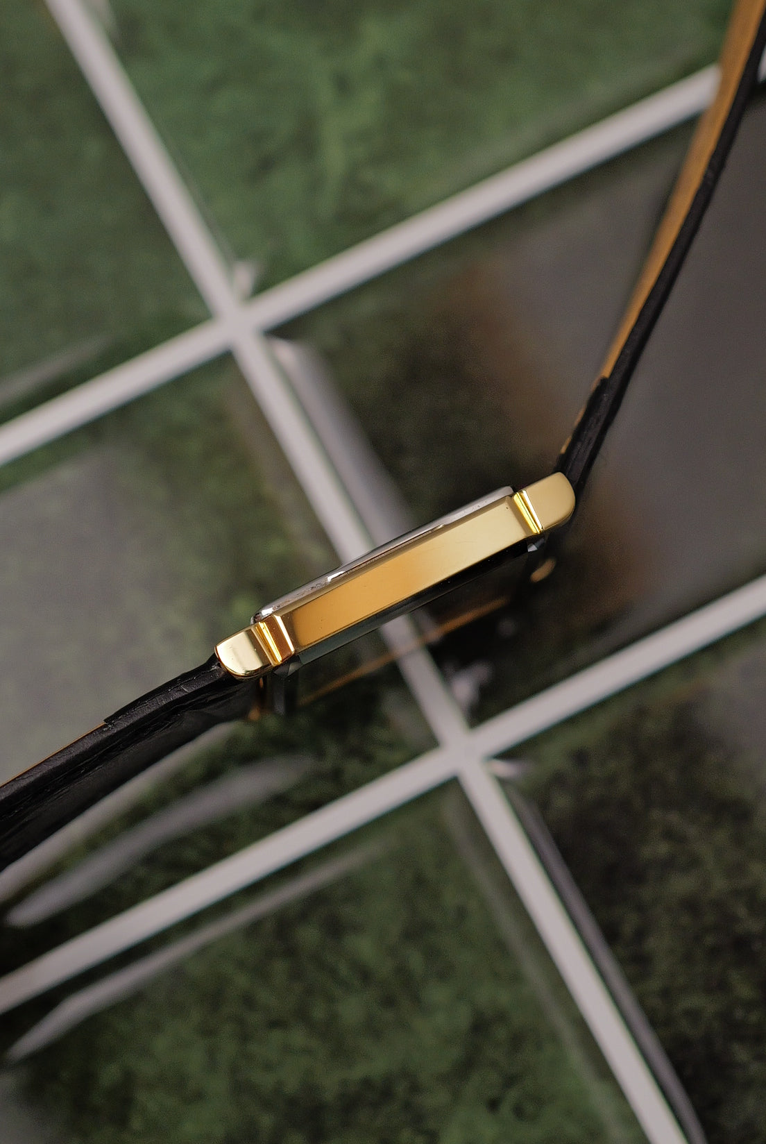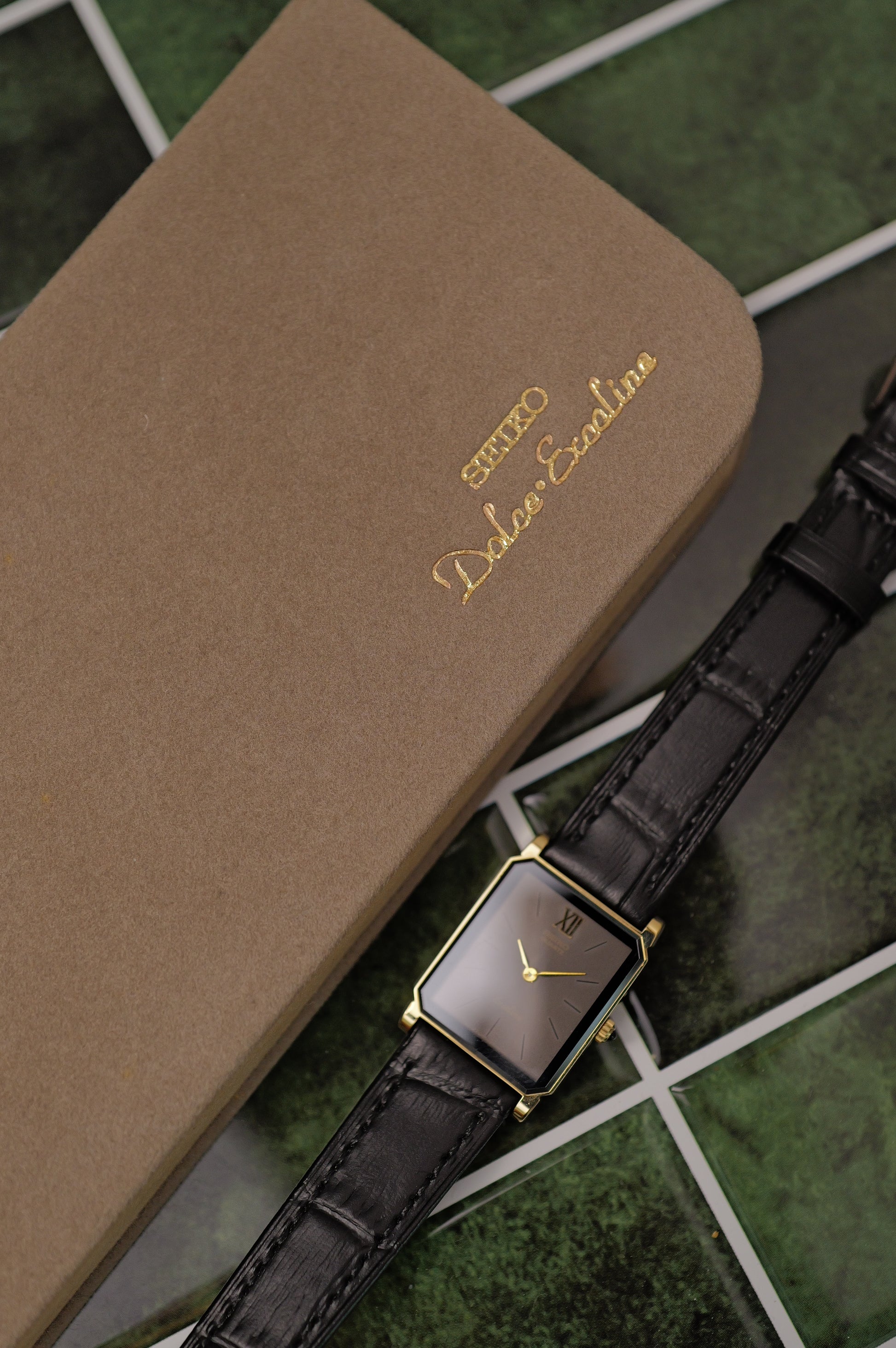 With a stark black dial interrupted only by a lone gold Roman numeral at twelve, this square Seiko is one moody watch! But as with all gold and black combo. A matte dial which contrasts against the polished piano black bezel, all embedded within the fully glass front piece construction. Comes with a beautifully lightly patina-ed dial as you can observe the evenly lightening areas on the dial.