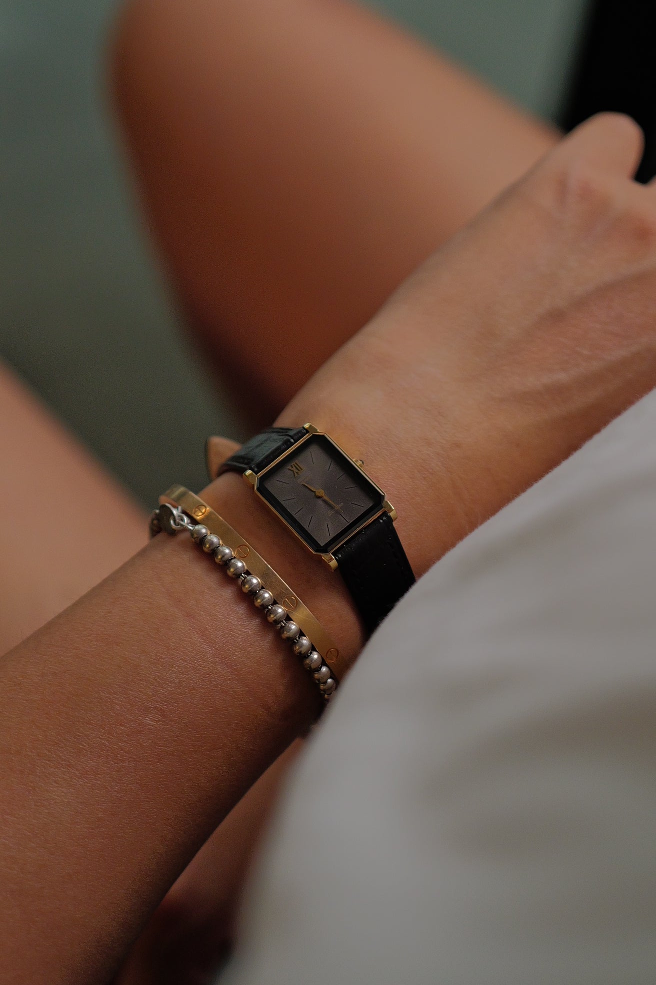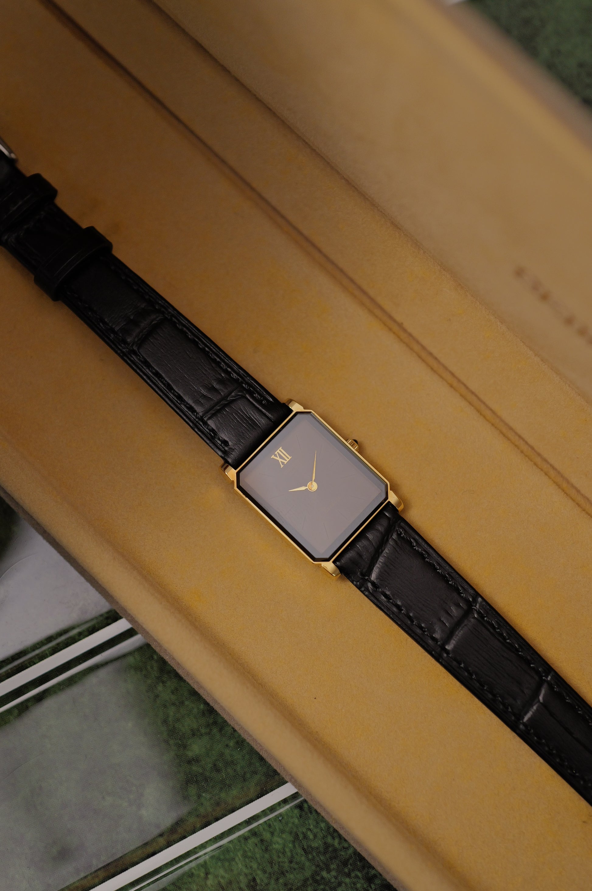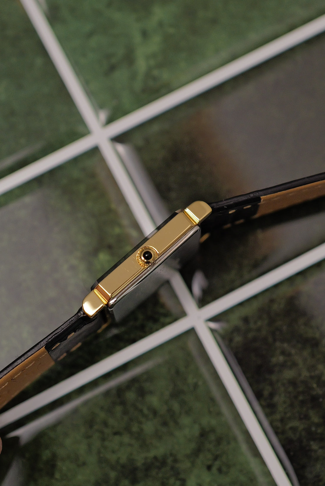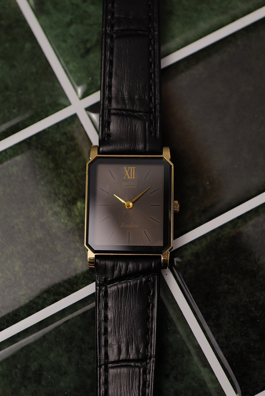 With a stark black dial interrupted only by a lone gold Roman numeral at twelve, this square Seiko is one moody watch! But as with all gold and black combo. A matte dial which contrasts against the polished piano black bezel, all embedded within the fully glass front piece construction. Comes with a beautifully lightly patina-ed dial as you can observe the evenly lightening areas on the dial.