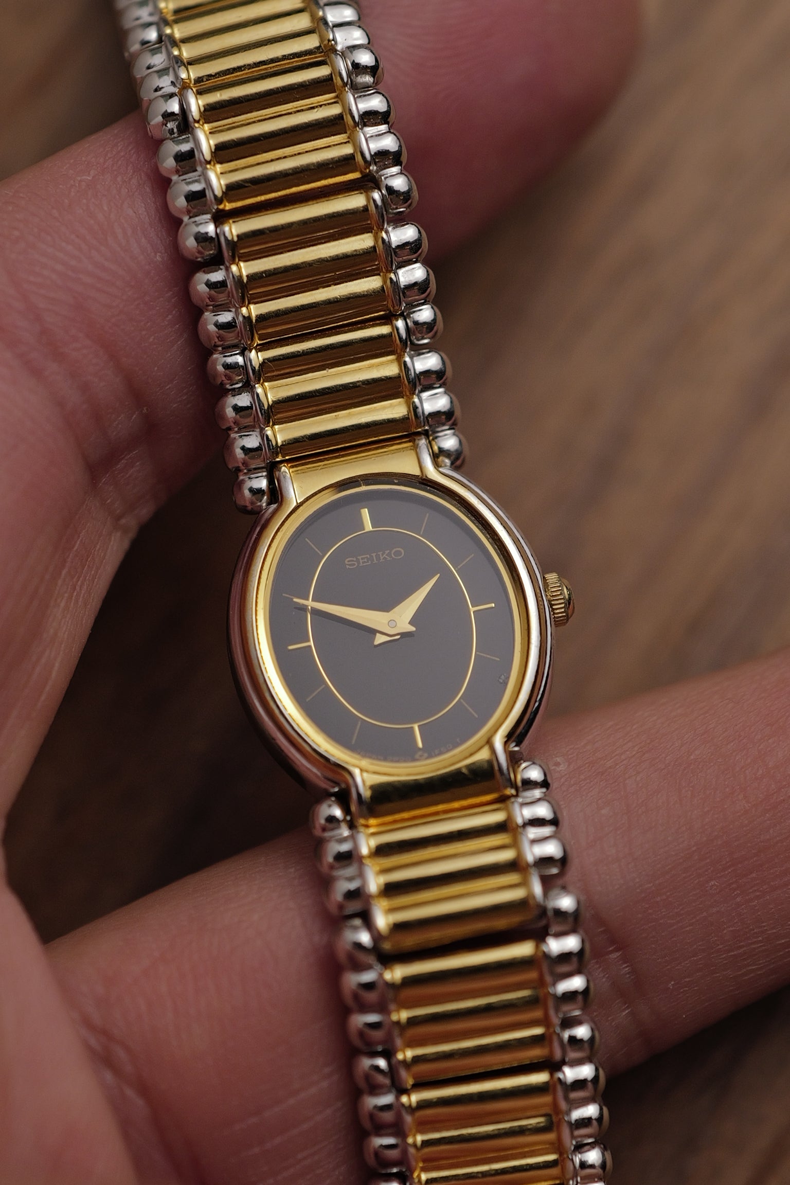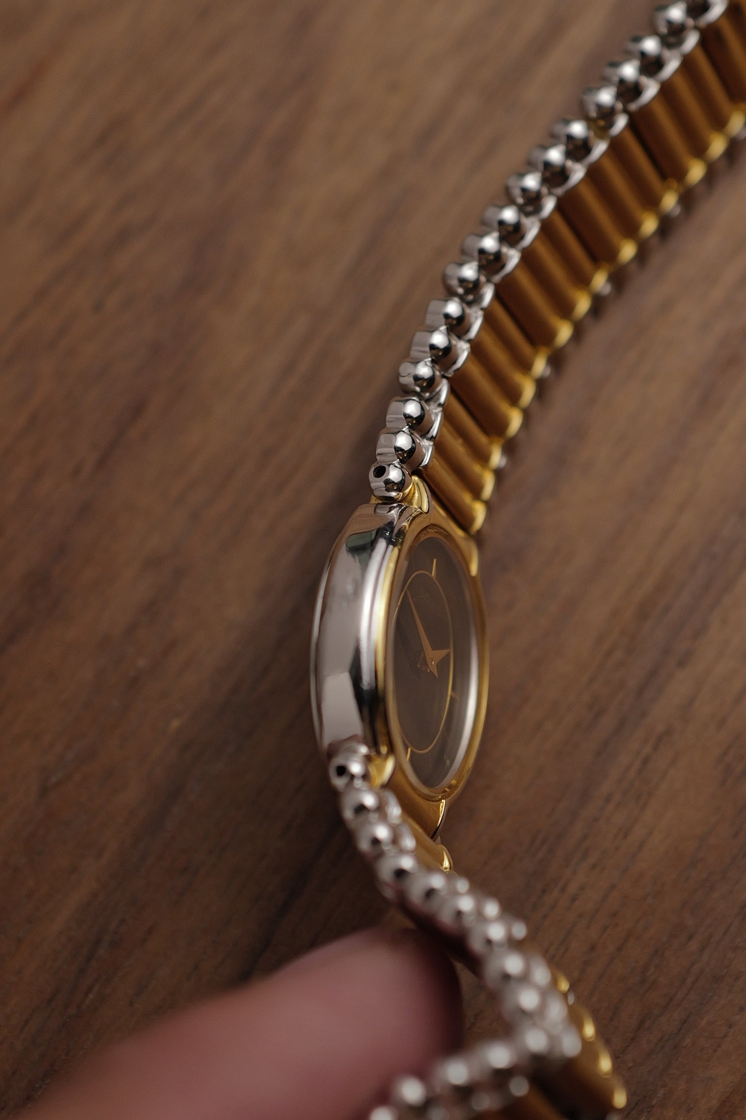 Watch Summary A bambo-inspirred bracelet design in a 2 tone colourway. A black dial with gold markers on the 3,6,9,12 section of the watch. Bamboo inspired watches has been on high demand recently, ranging from the cartiers to the JLC. Comes on a maximum wrist of 16cm.