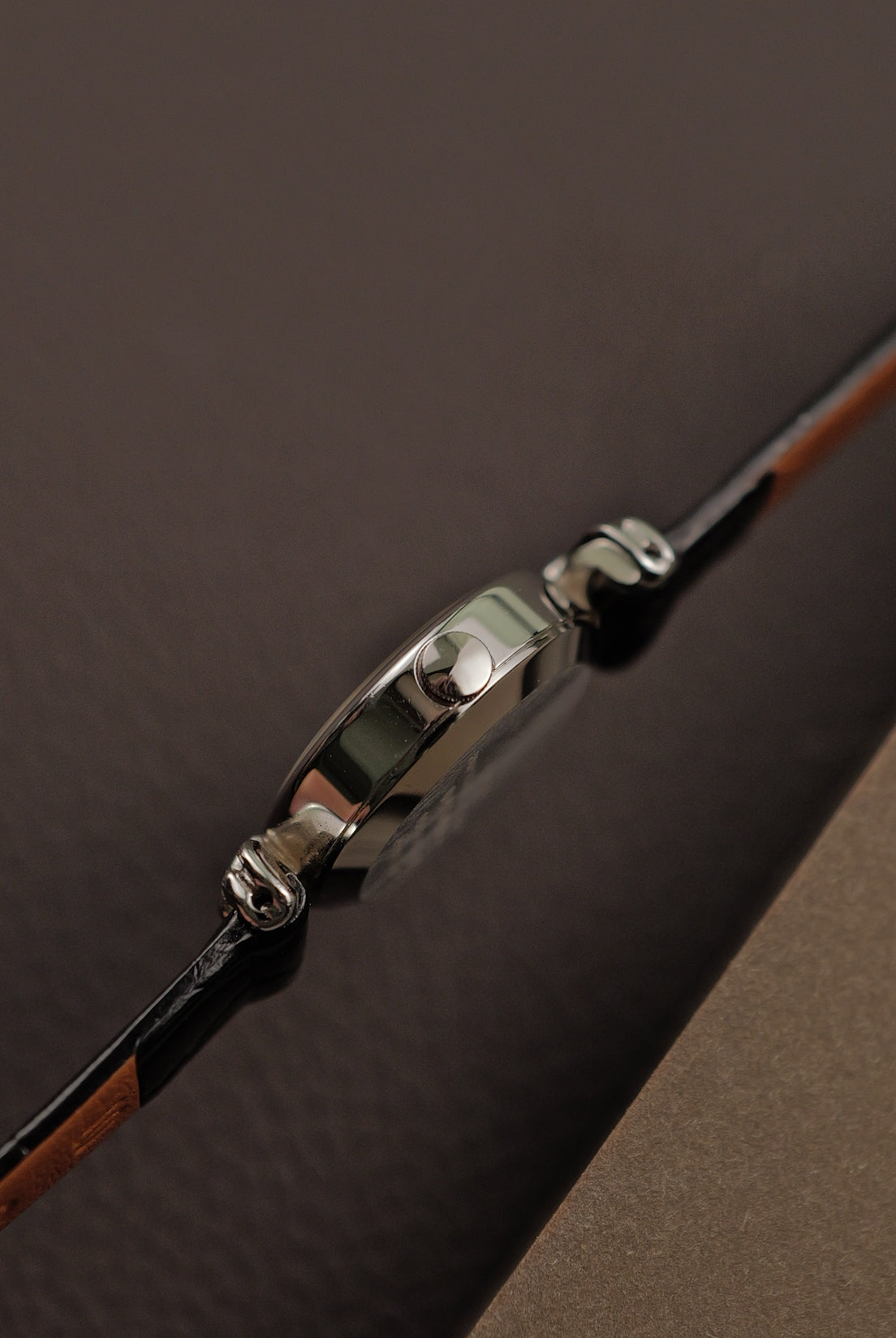 Watch Summary Round stainless-steel case featuring a brushed top surface and polished sides. The silver dial has a radial brushed finish with slim baton hour indices and silver stick hands. More of an art-deco case design with those T-bars on the top and bottom of case