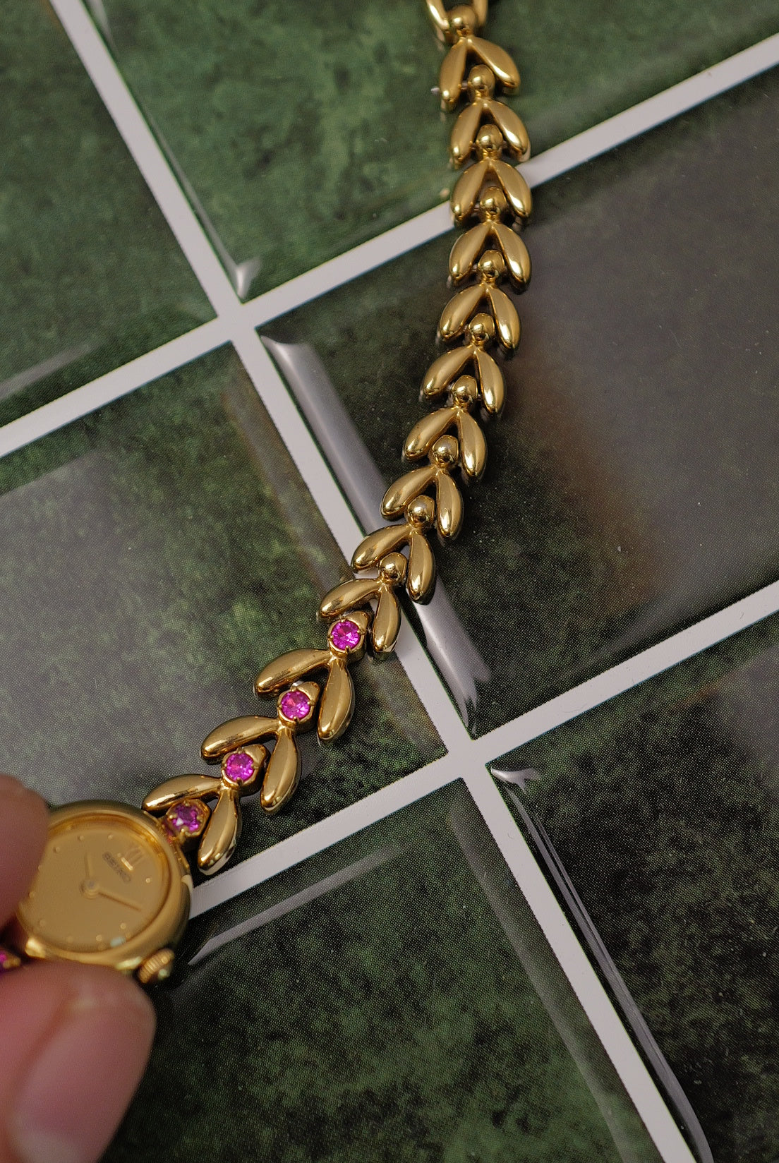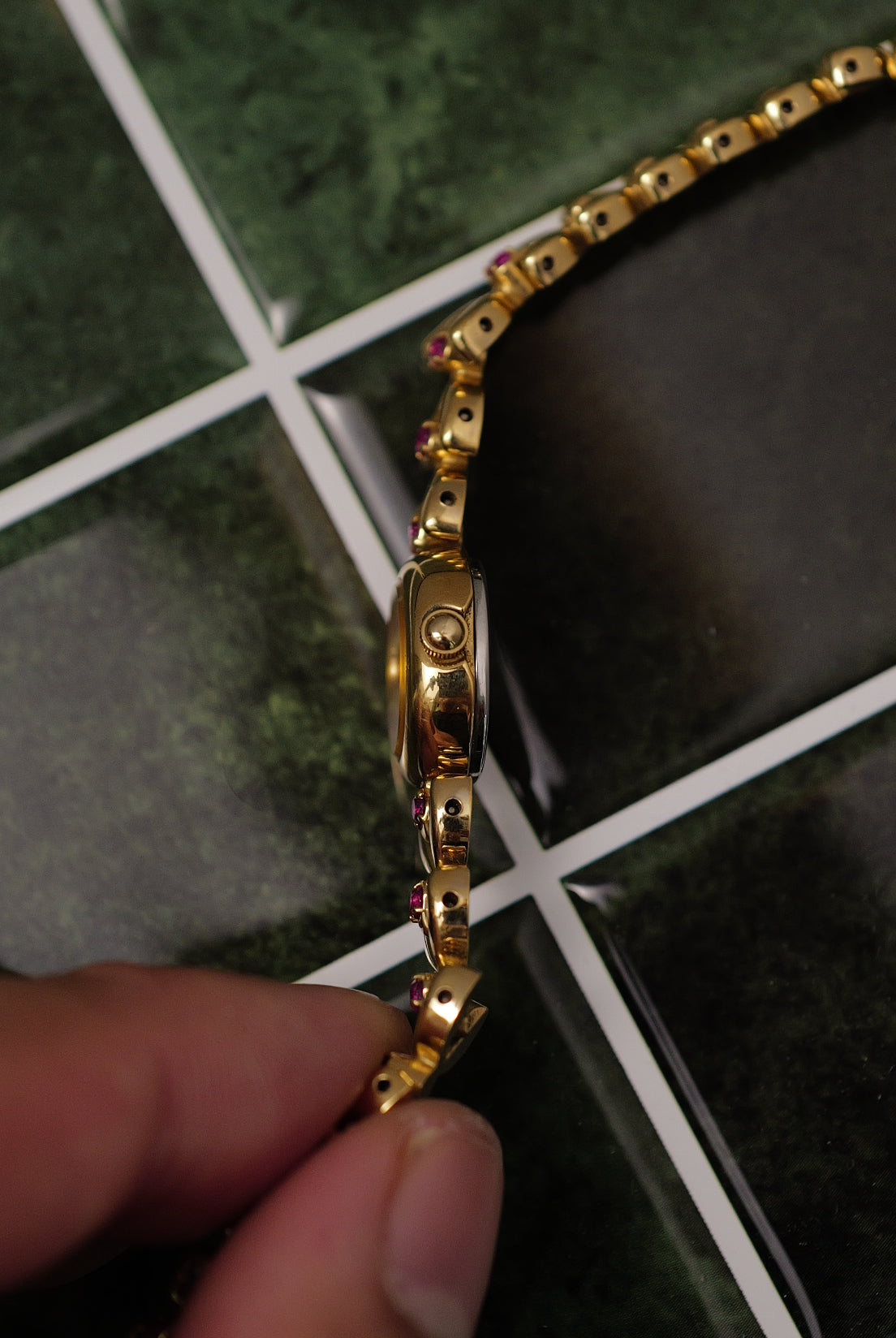 MVP item of this launch. Another 1E20 masterpiece, and for those who do not know, the 1E20 movement series had the most elegant and wildest design, with weird and beautiful inspirations, hence highly collectible. This is no exception, 8 pink gem sets in total, dainty and decorative, this piece feels like a bracelet first, watch second. The gold case surrounds a tiny dial, while the leaf-like links are studded with pink gemstone accents.