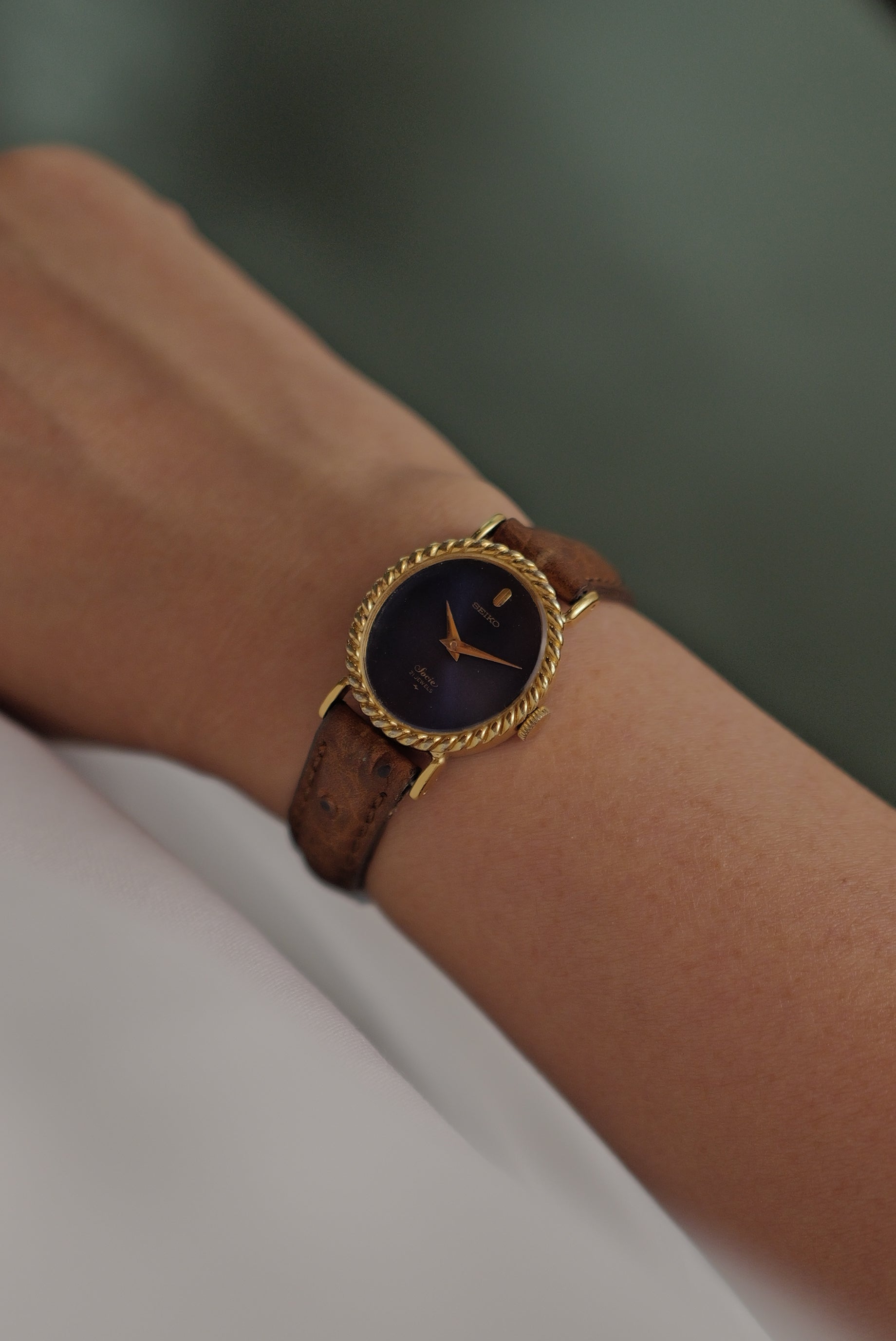 | Watch Summary | The ribbon bezel seikos will always be my favourite. It reminds me the of design mastermind seiko used to be (compare to what we're seeing nowadays from the brand). A bright blue satin dial with gold stamped linings. Paired on an ostrich strap. Movement was recently serviced on sep-2025 |