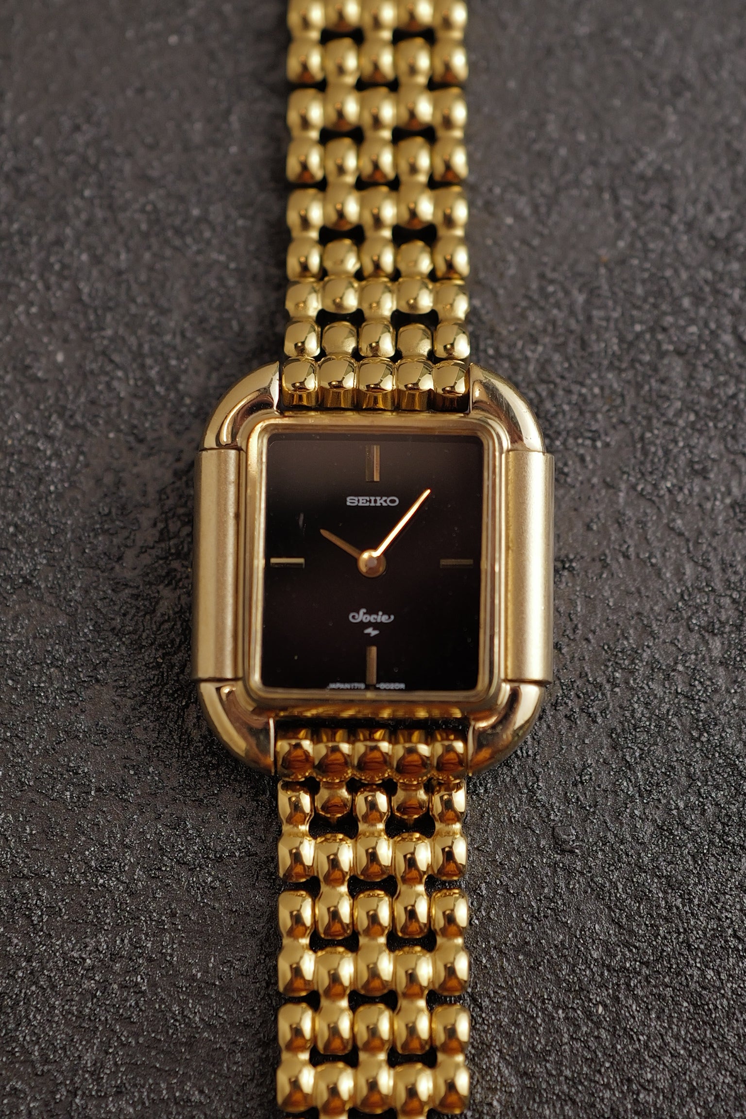 A rare manual-winding women's dress watch, part of Seiko’s Socie collection, known for its elegance, refined simplicity, and high-quality craftsmanship. A sophisticated round case with the manual winding crown at the back instead of the side . This piece is in perfect working condition with minor scratches on the case and it is fitted with a beautiful custom bracelet. Watch manual movement has been regulated to approx +-20sec a day. |