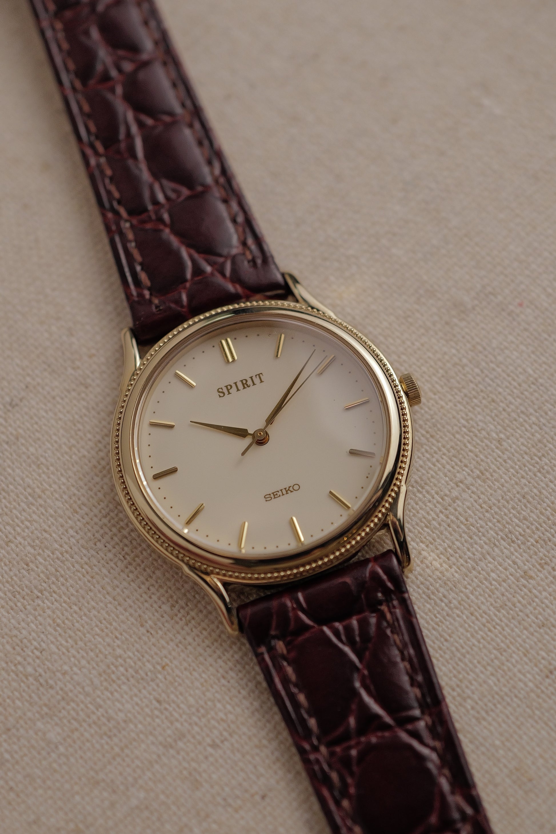 | Watch Summary | A classical convex domed seiko spirit for those 1994 birth year kiddos! Comes with a beaded bezel and an egg-white dial. I love how that added that subtle bezel design rather than just doing a smooth rounded bezel (as most seiko spirit were). Comes attached on a new strap and after market buckle |