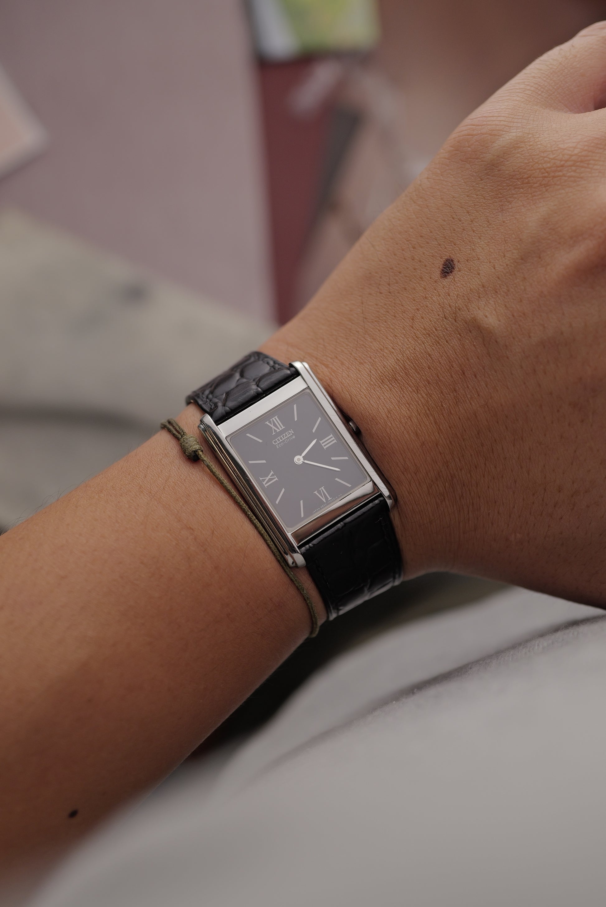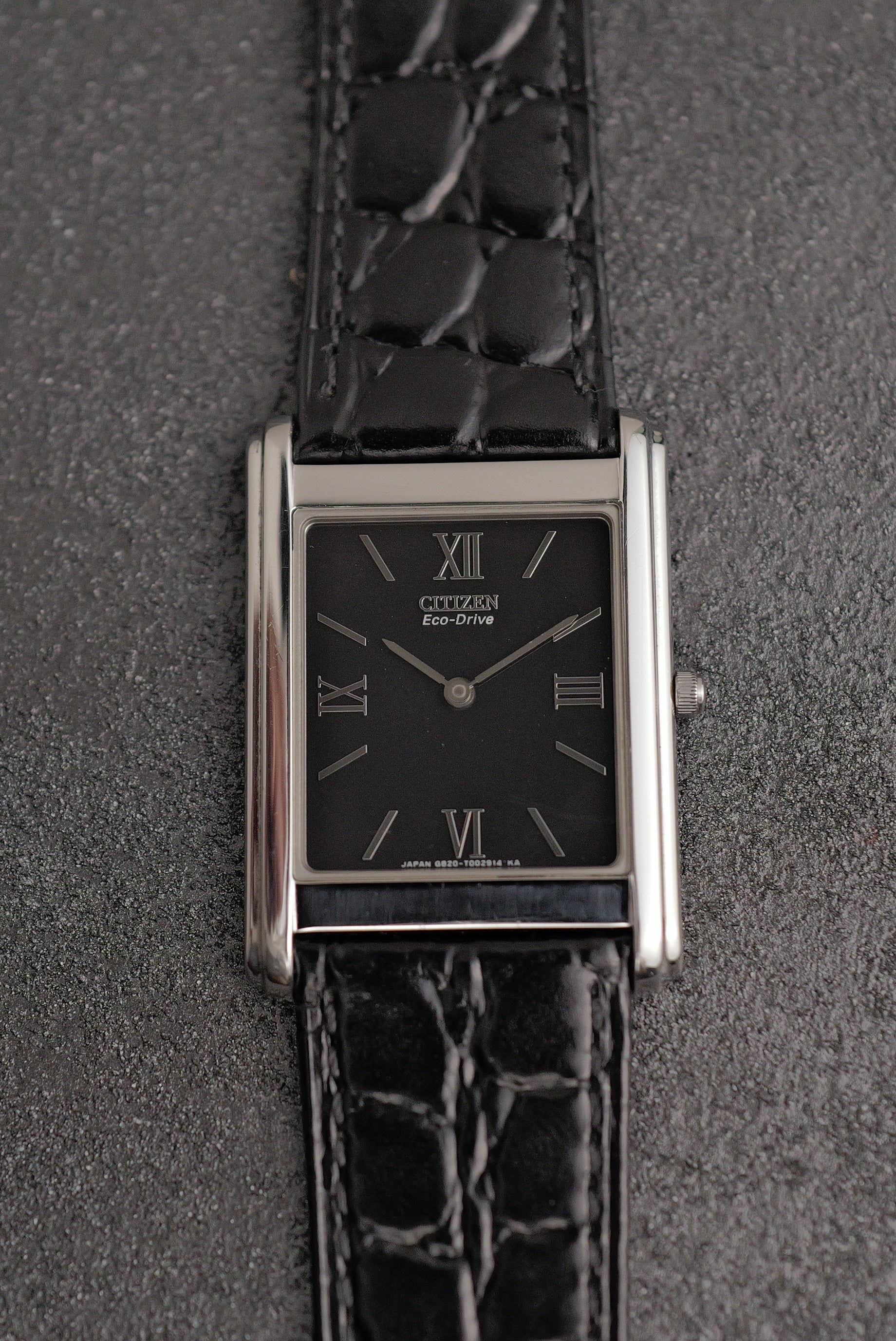| Watch Summary | An ultra slim Citizen tank. only 4mm in thickness which is insane. vertical step case on both sides and a gorgeous dark grey dial which also acts as the panel for charging. comes on a new 21mm strap. |