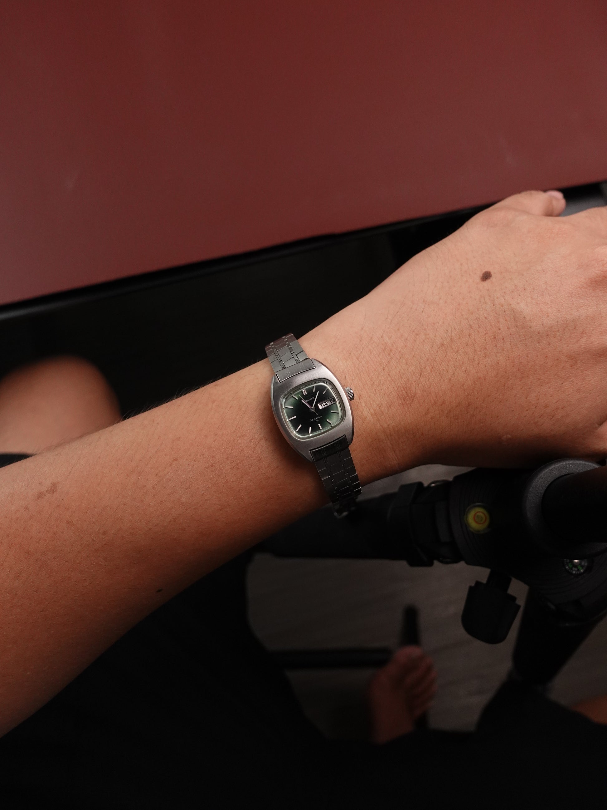 This specific piece comes with a green fume-like dial, which gradients from a light green to a very dark green in the middle. Only during the 80s did seiko produce such gradient pieces.