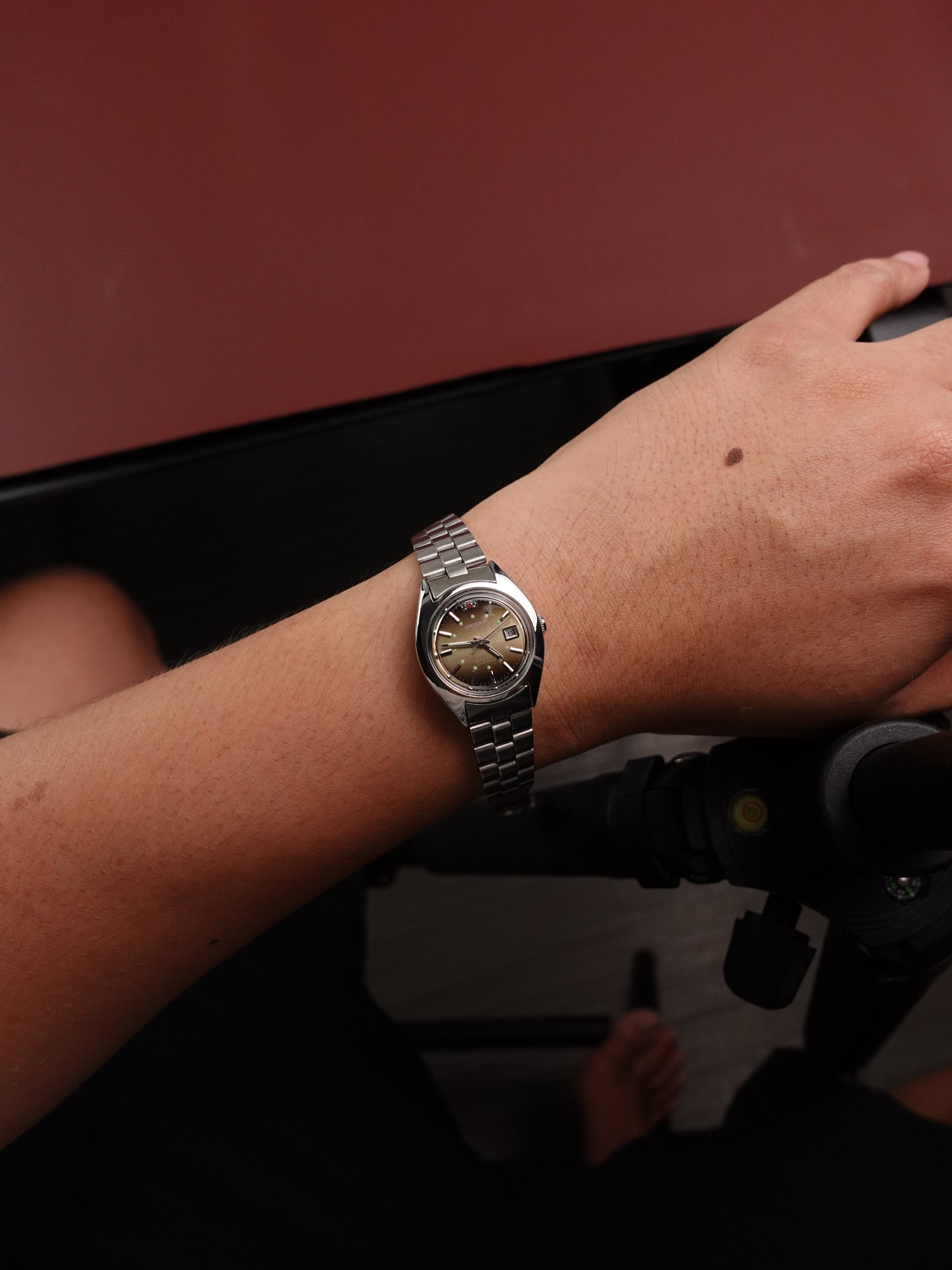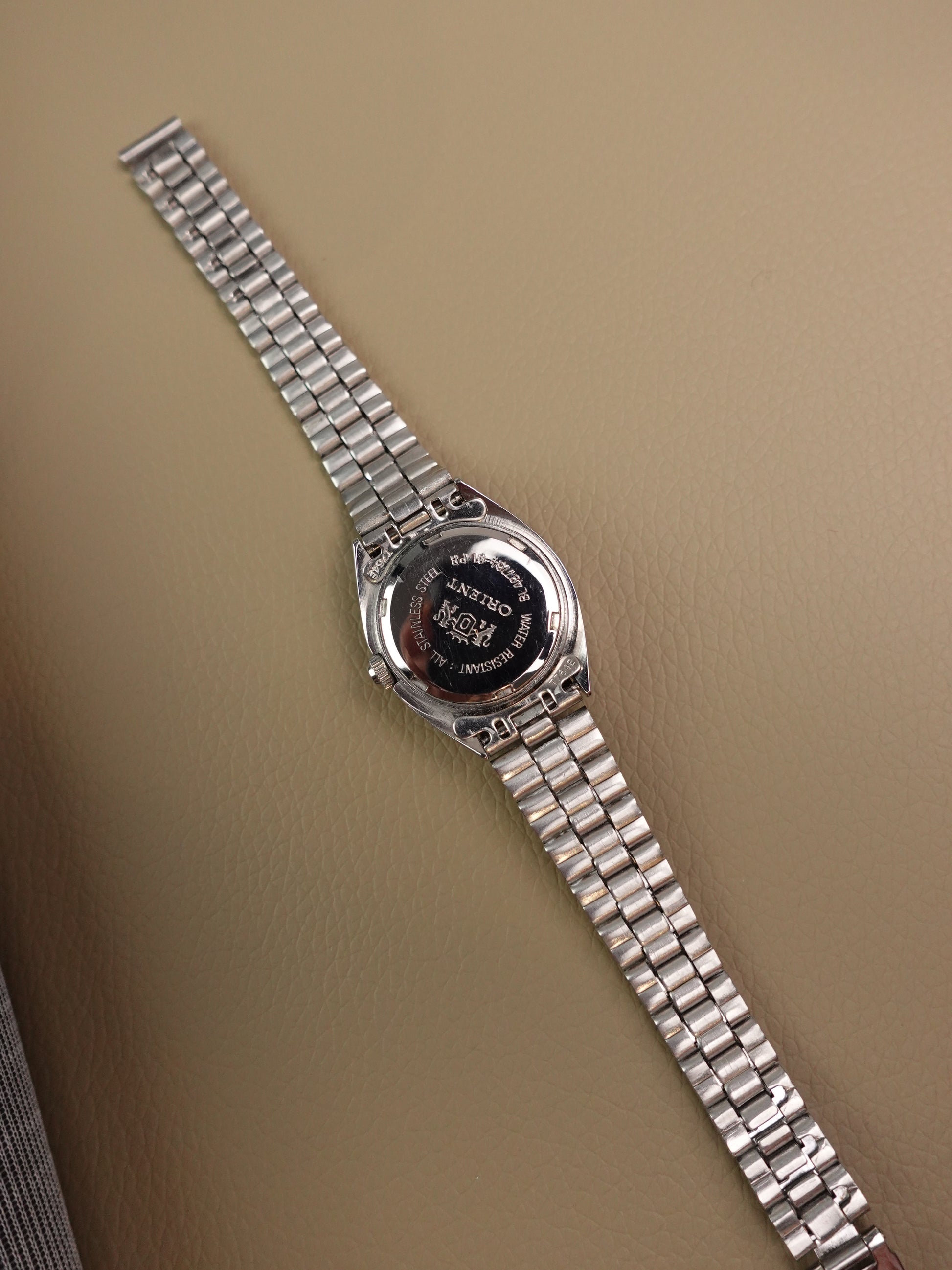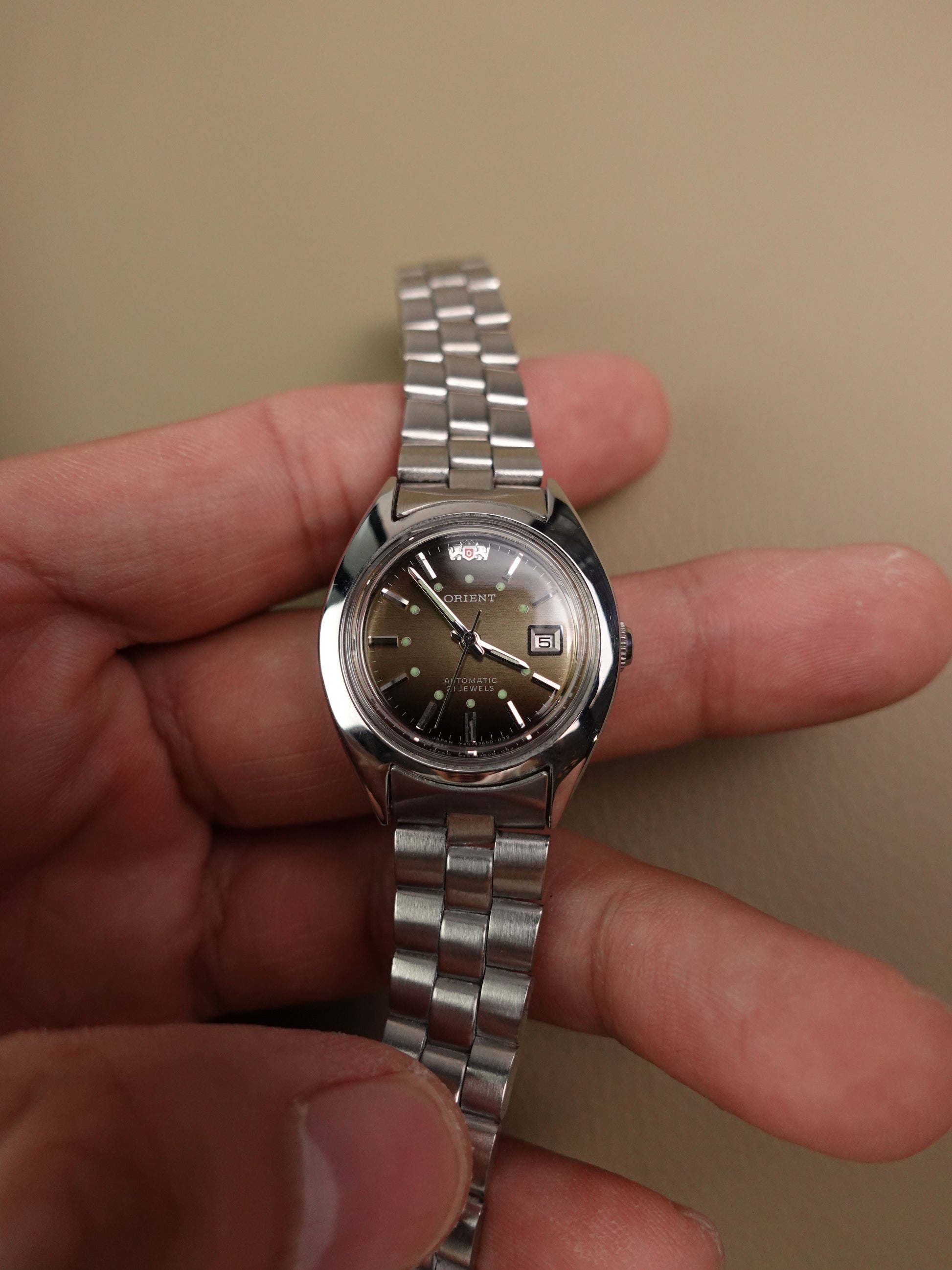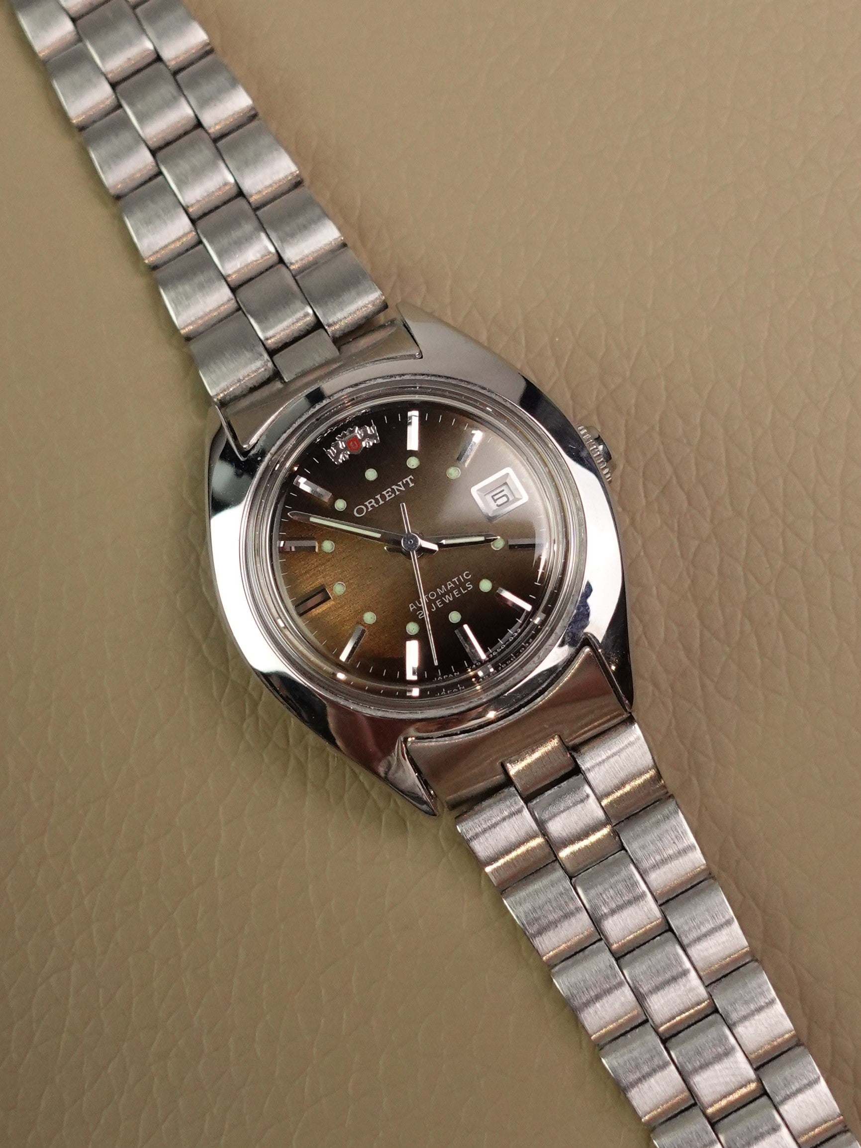 This specific piece comes with a Gradient brown dial, giving a type of wood-like grain design. The dial also comes with mini lume markers and an embossed orient logo. Only during the 80s did orient produce such gradient pieces.