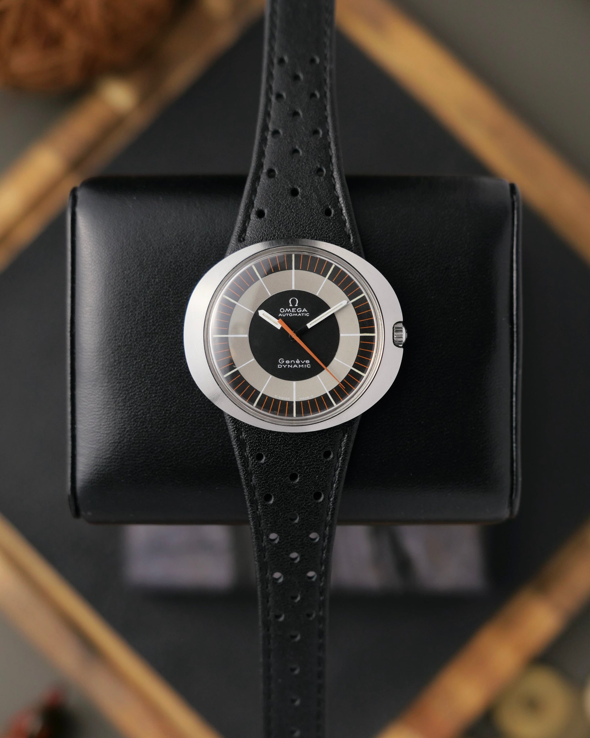 Finally found a ver.1 Dynamic without date. Perfect symmetry is worth waiting for! This sporty watch spanned over 30 size/dial/calibre variations and was a huge success in the future-looking 60s and funky 70s. Not just an interesting shape, these watches were marketed as the most comfortable in the world with improved ergonomics by rotating the watch to horizontal (from straddling wrist bone to avoiding it); an innovative one-piece strap that sits IN the case (who needs lugs?); and perforated straps that aerate the wrist. This example has the automatic Cal. 552 in stellar condition. Shaped, as current trends favour, yet brimming with vintage vibes. In a taupe, grey, white and orange colourway that’s so late 60s/early 70s!
