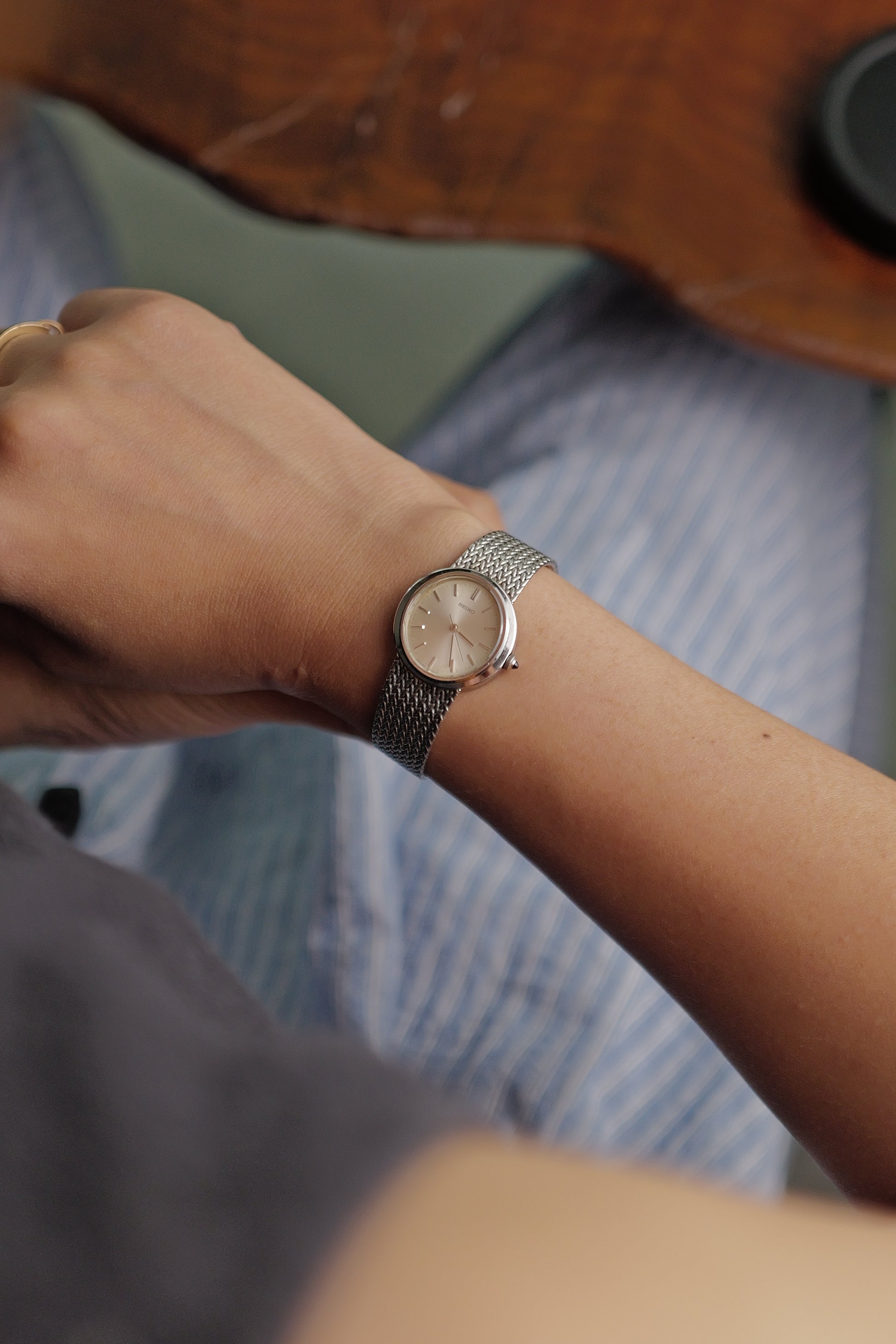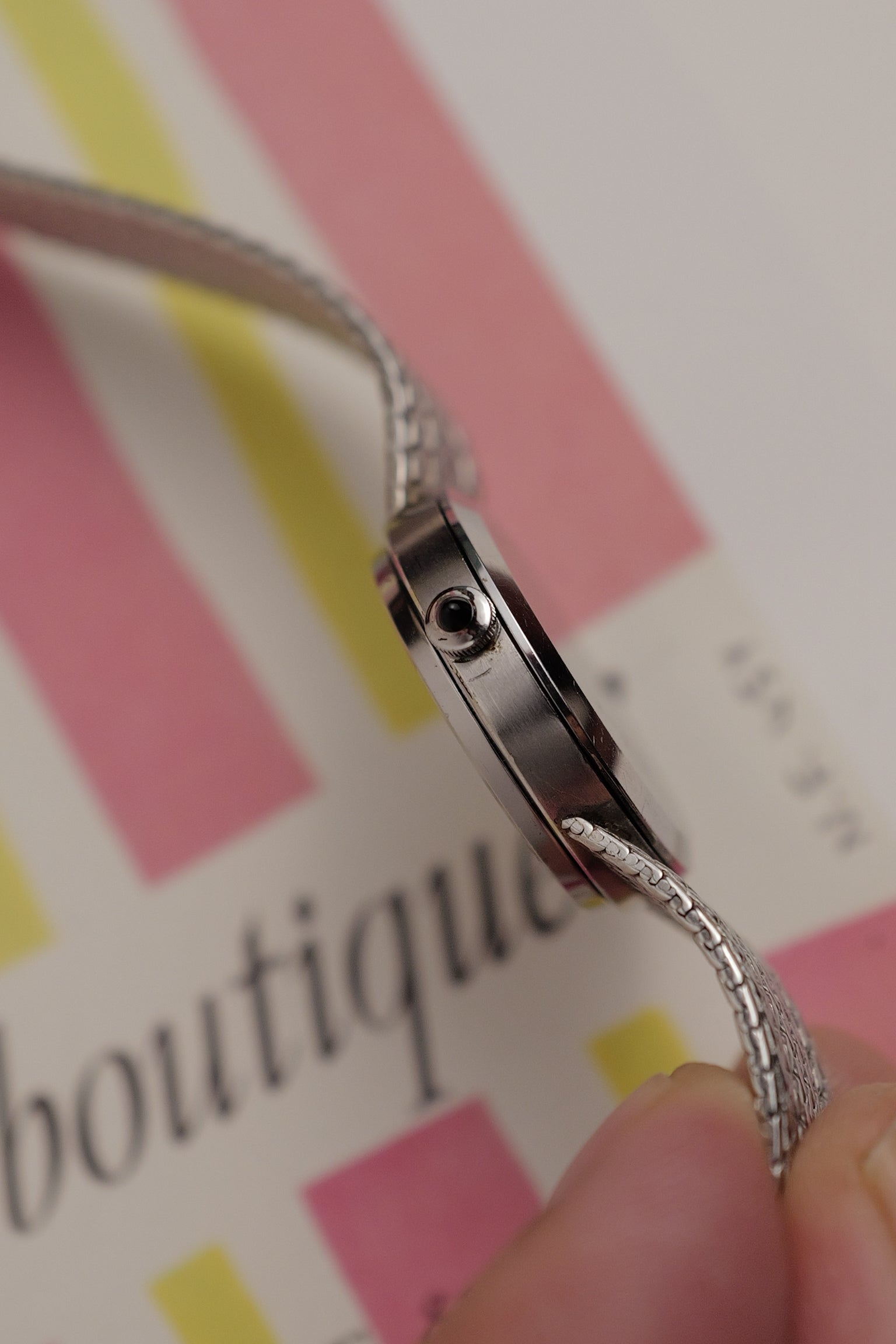 a rarely seen model from the 80s, with a polished bezel and brushed case finish. Tightly woven integrated bracelet which has a cut-to-size end links. A slight patina silver sunburst dial. Currently running at a length of 16.5cm. |