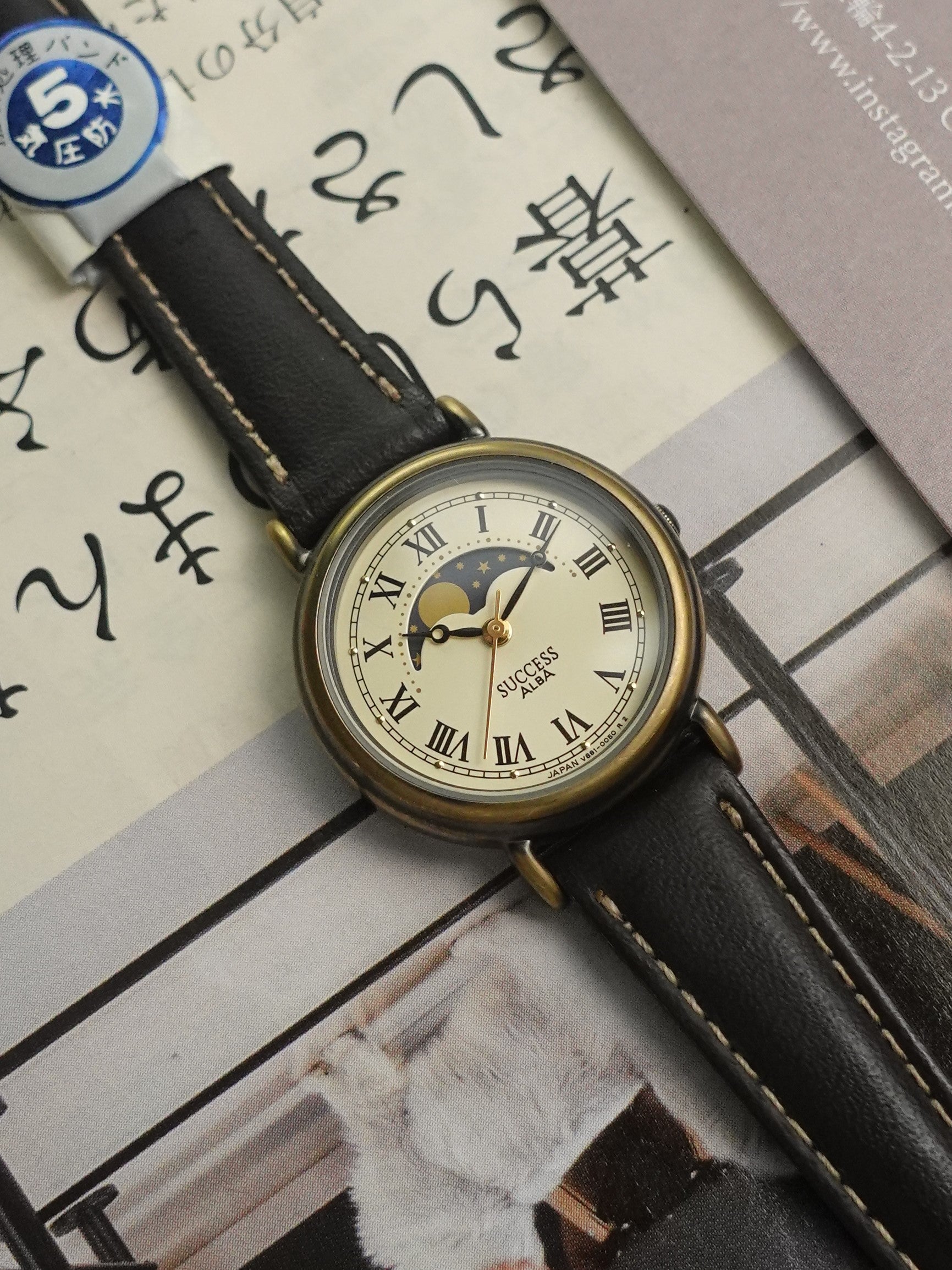 A alba success moonphase with a off-white colour dial, which also comes with its unique breguet hands and roman numeral. Case is also relatively unique, with a bronze like texture case. This is the men's size as im listing 2 of the same watch but in ladies and mens
