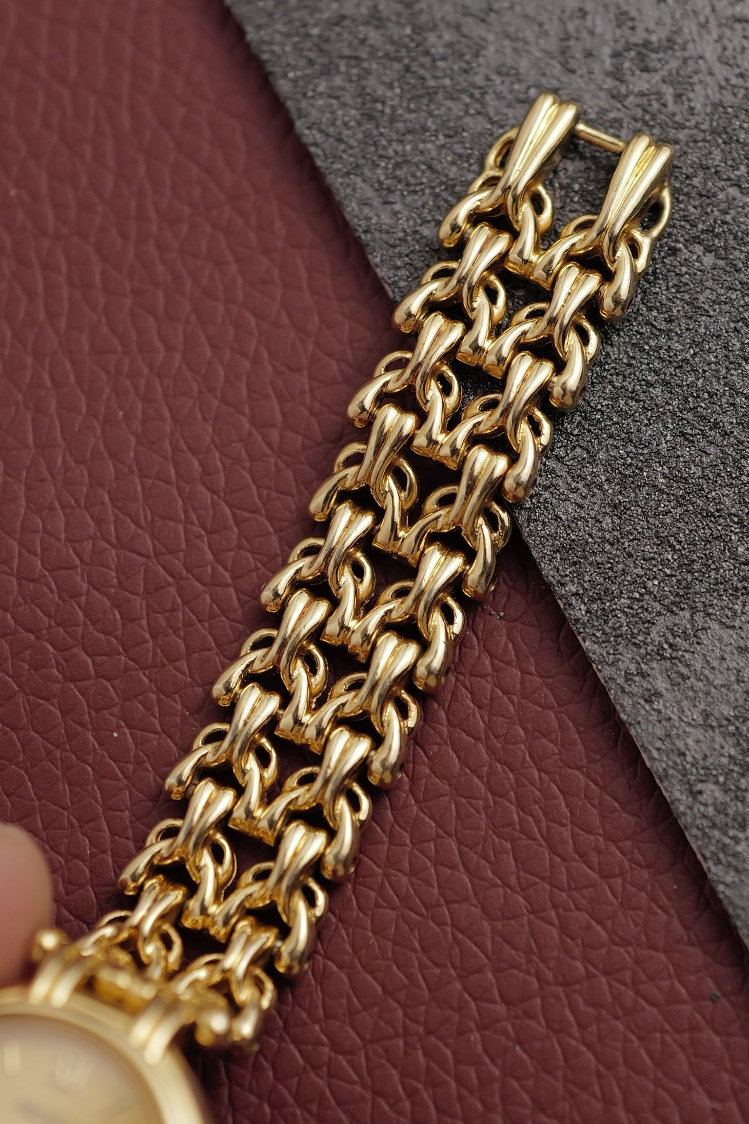a Chain-multi link bracelet which looks like individual ties (or that's just me). Linen dial configuration with applied markers. Rare to source such bracelets as majority of 80s stuff came on woven bracelet than this. |