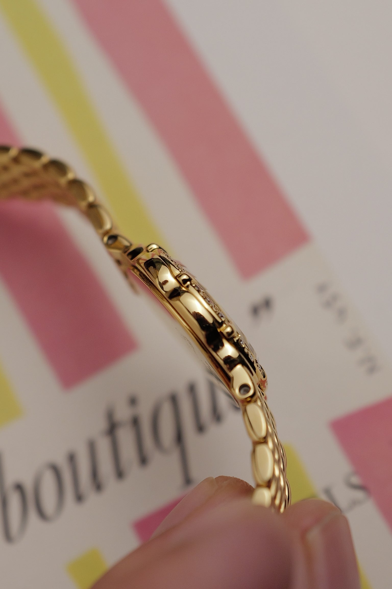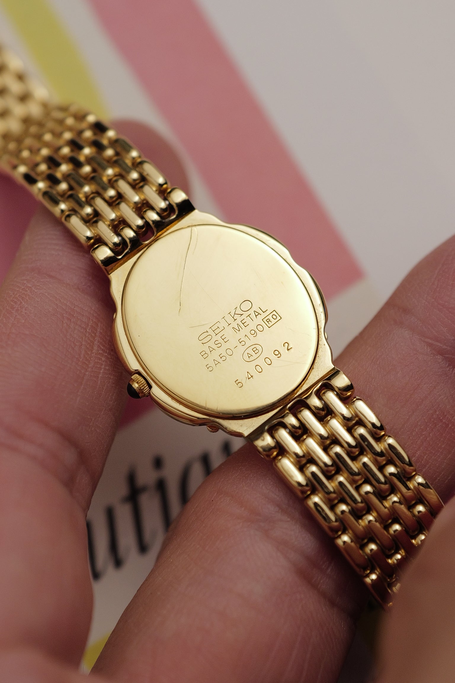 One of the coolest piece for this drop, the cream of the crop exceline piece, a 24 Diamond bezel exceline from the 1990. Ornate flower-shaped gold-tone case with high polish. Dial is pearl white with gold dot indices and slim gold leaf hands. Another 4 gem set on the mother of pearl dial, Full gold-tone bracelet with rounded links. Full glam exposure design. i just love how much volume the bezel has, with inward grooves with the shape of a petal. Watch has no dial corrosion or glass scratches. Bracelet is of long length at 16cm. all links are removable and adjustable to all wrist and the extra links will be given with the purchase. |