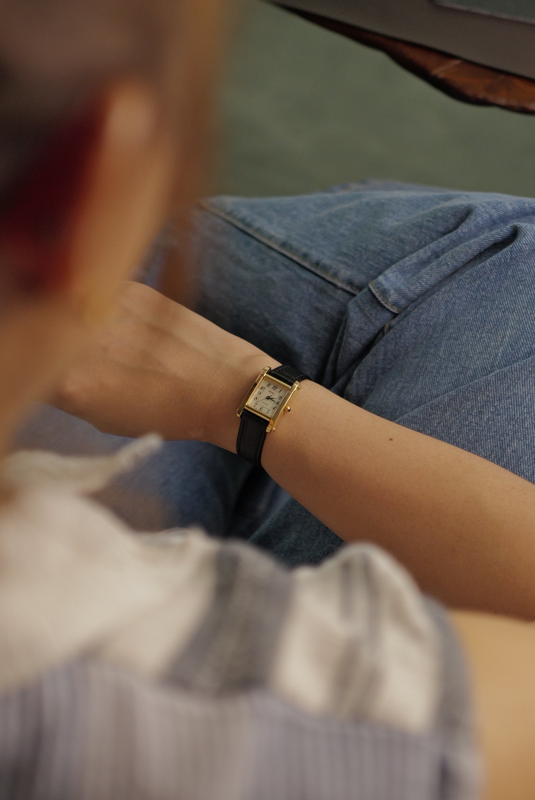 Watch Summary | One of the coolect tank shaped exceline from the 90s line. A relatively chunkier design, with a flowing case shape in polished finish. Love how they used a mother of pearl dial rather than a traditional white one. Arabic numerals to finish off this beauty! Comes attrached on a new black strap and after market gold buckle |