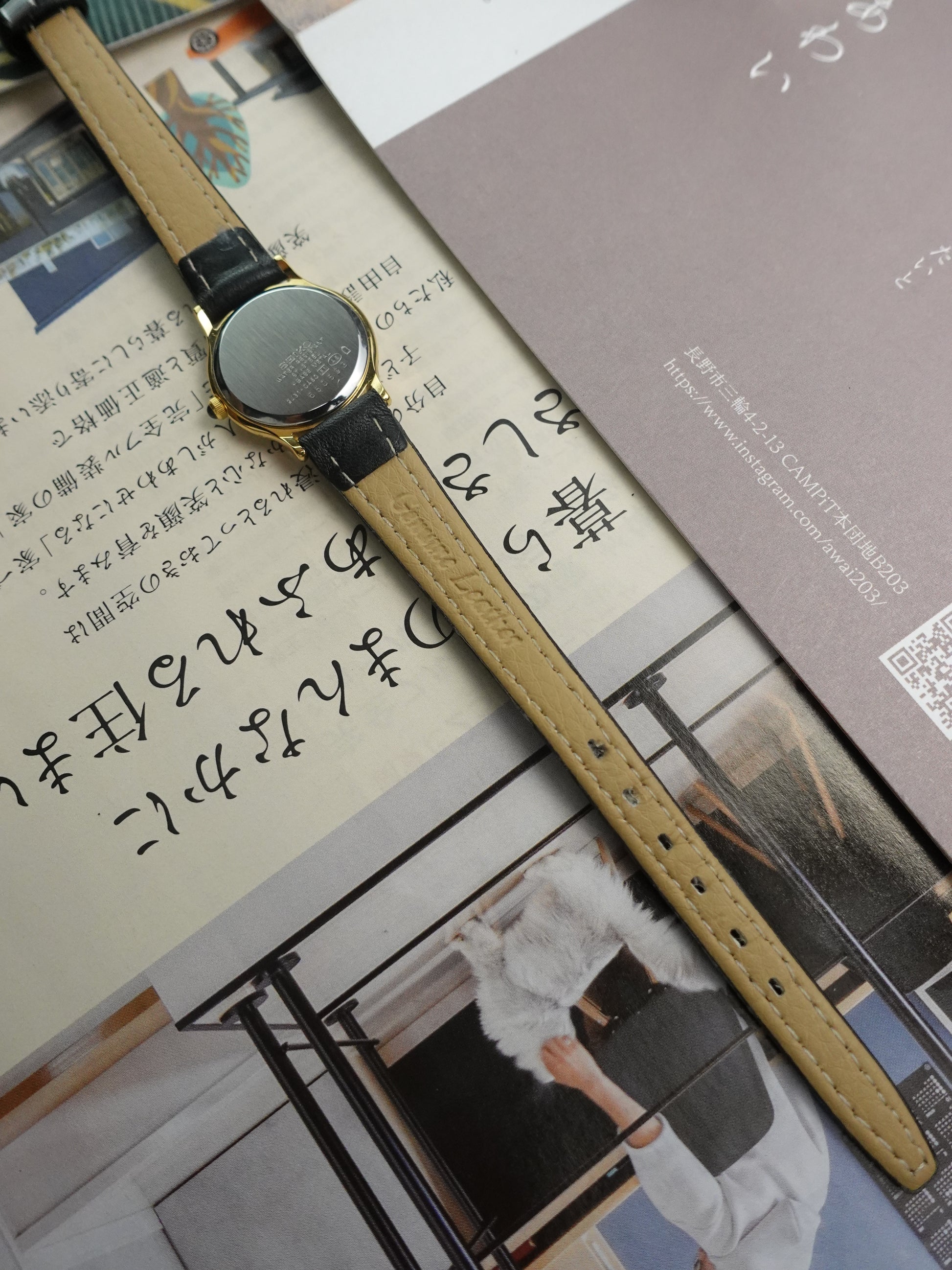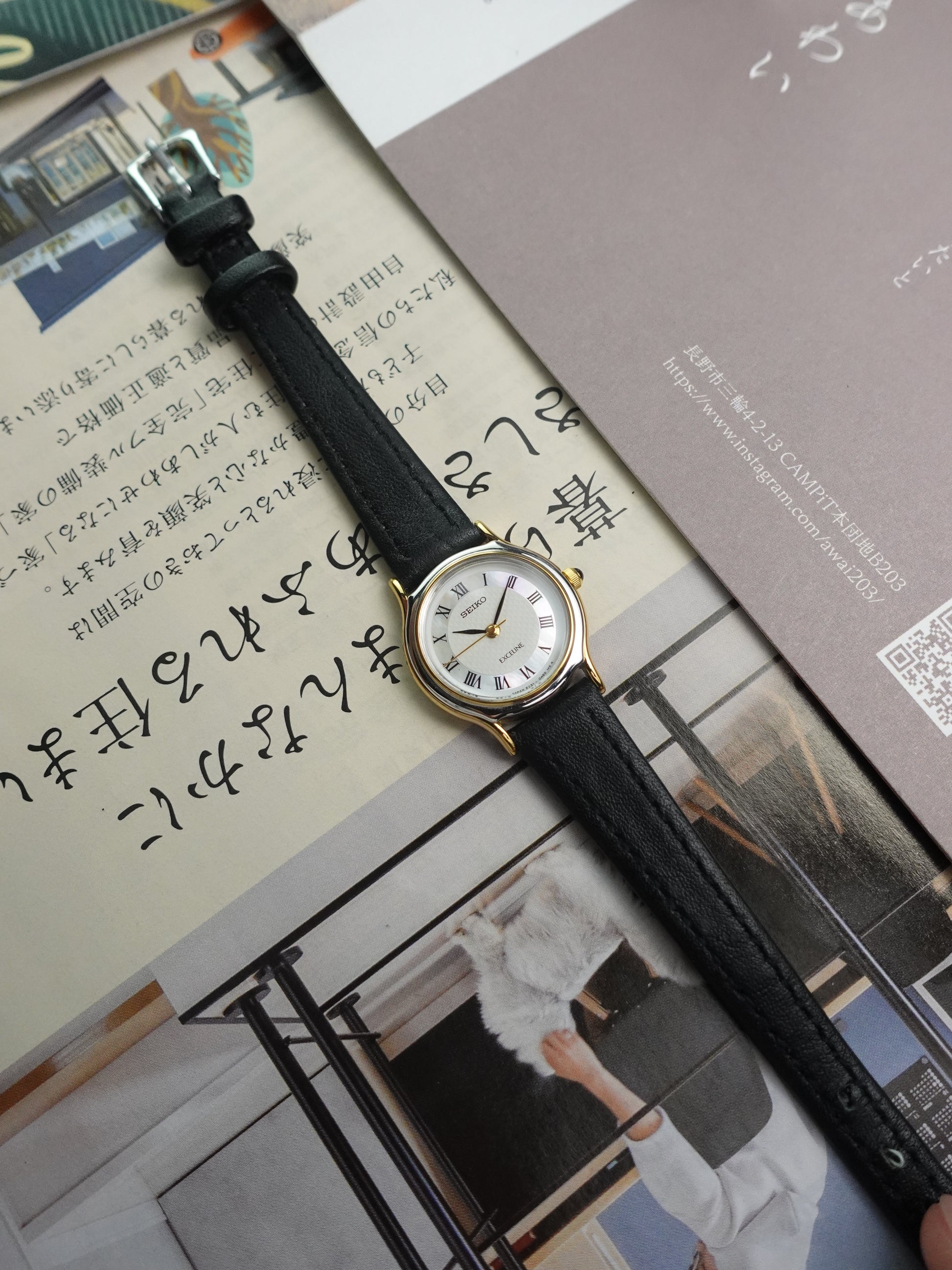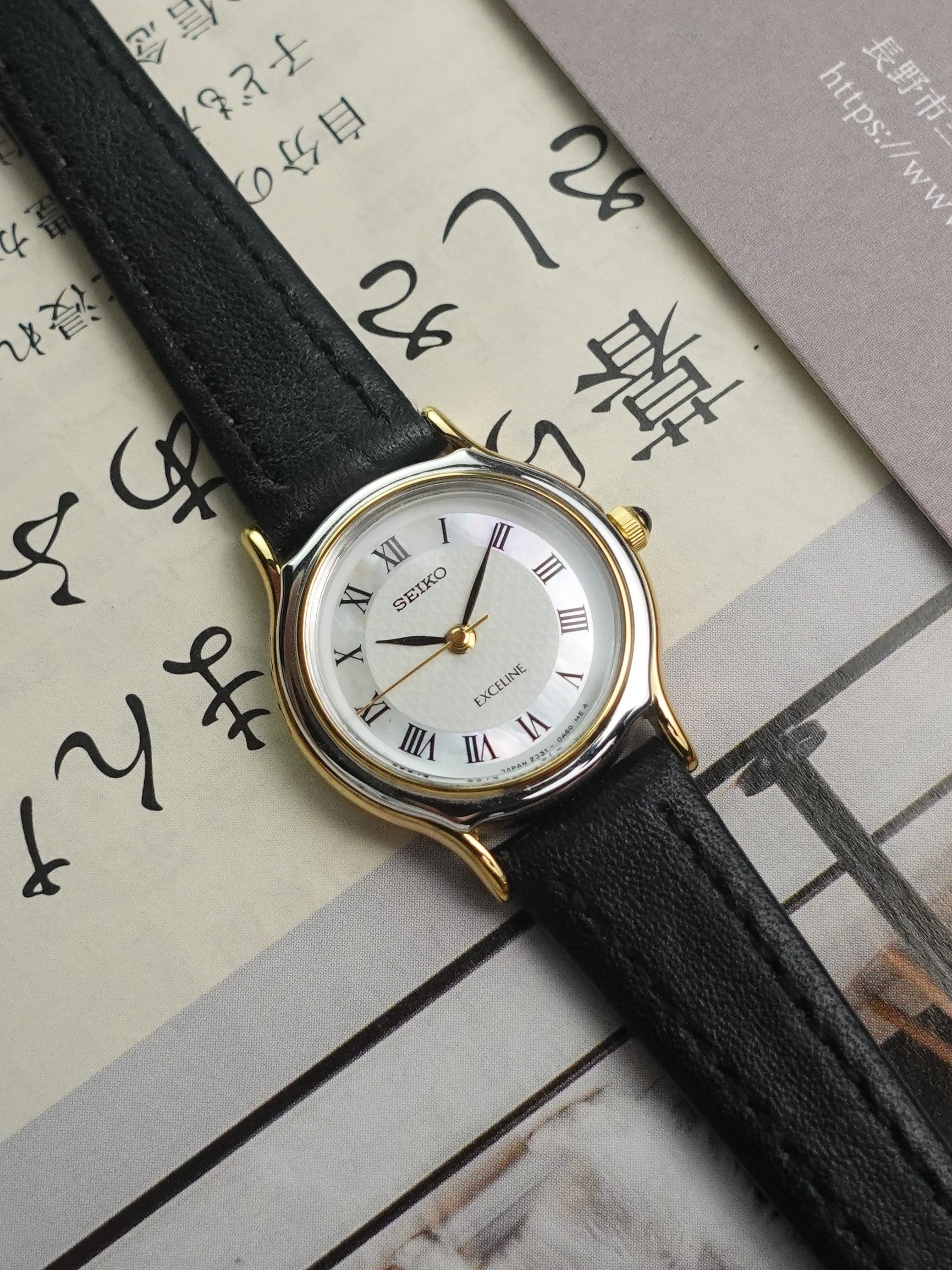 a rare Exceline variation which comes with a mother of pearl dial. Dial is pearl white on white, with a 2 tone case. Under different sunlight the watch reflects differently on the circular mother of pearl section.