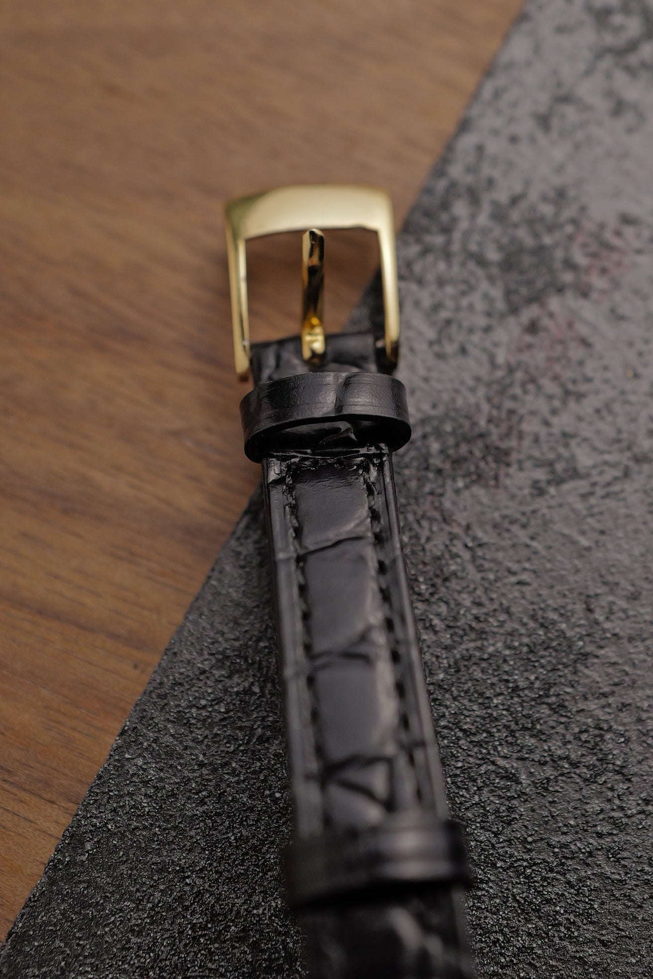 Watch Summary | known on the Cartiers, the Seiko versions are extremely chiq and beautiful with its horn-like lugs and convex glass. Long oval polished gold-tone case with flared lugs. White dial with elegant black Arabic numerals and blue hour/minute hand. new strap and gold buckle |