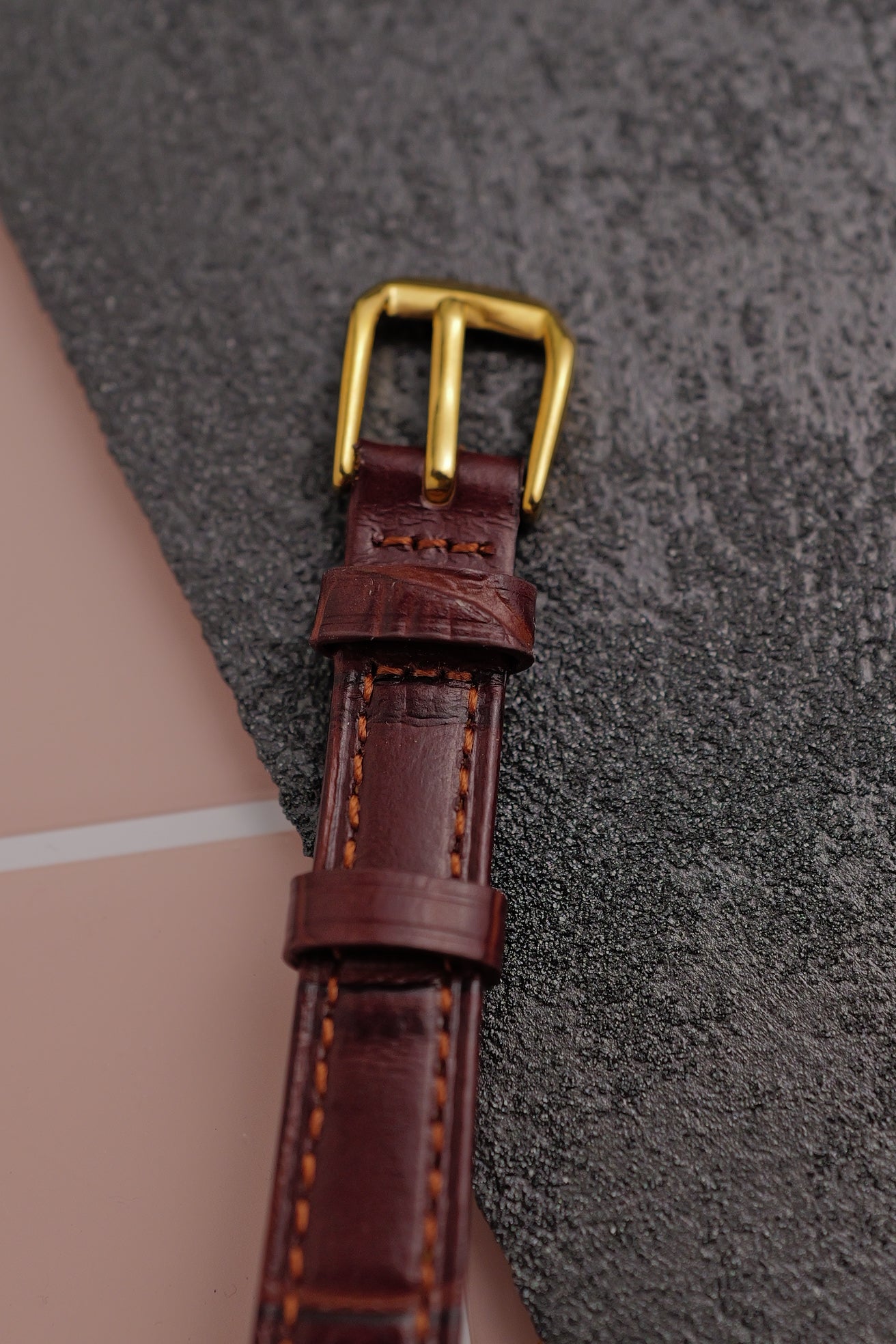 Watch Summary | known on the Cartiers, the Seiko versions are extremely chiq and beautiful with its horn-like lugs and convex glass. Long oval polished gold-tone case with flared lugs. White dial with elegant black Arabic numerals and blue hour/minute hand. new strap and gold buckle |