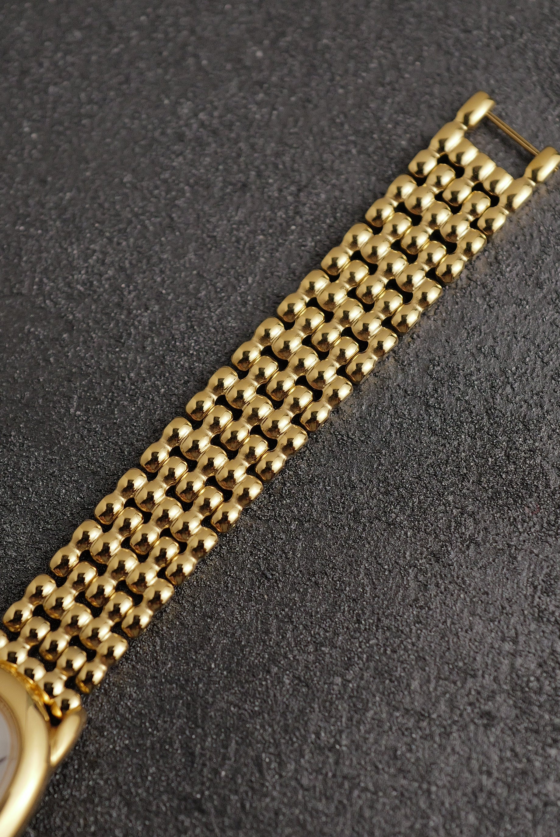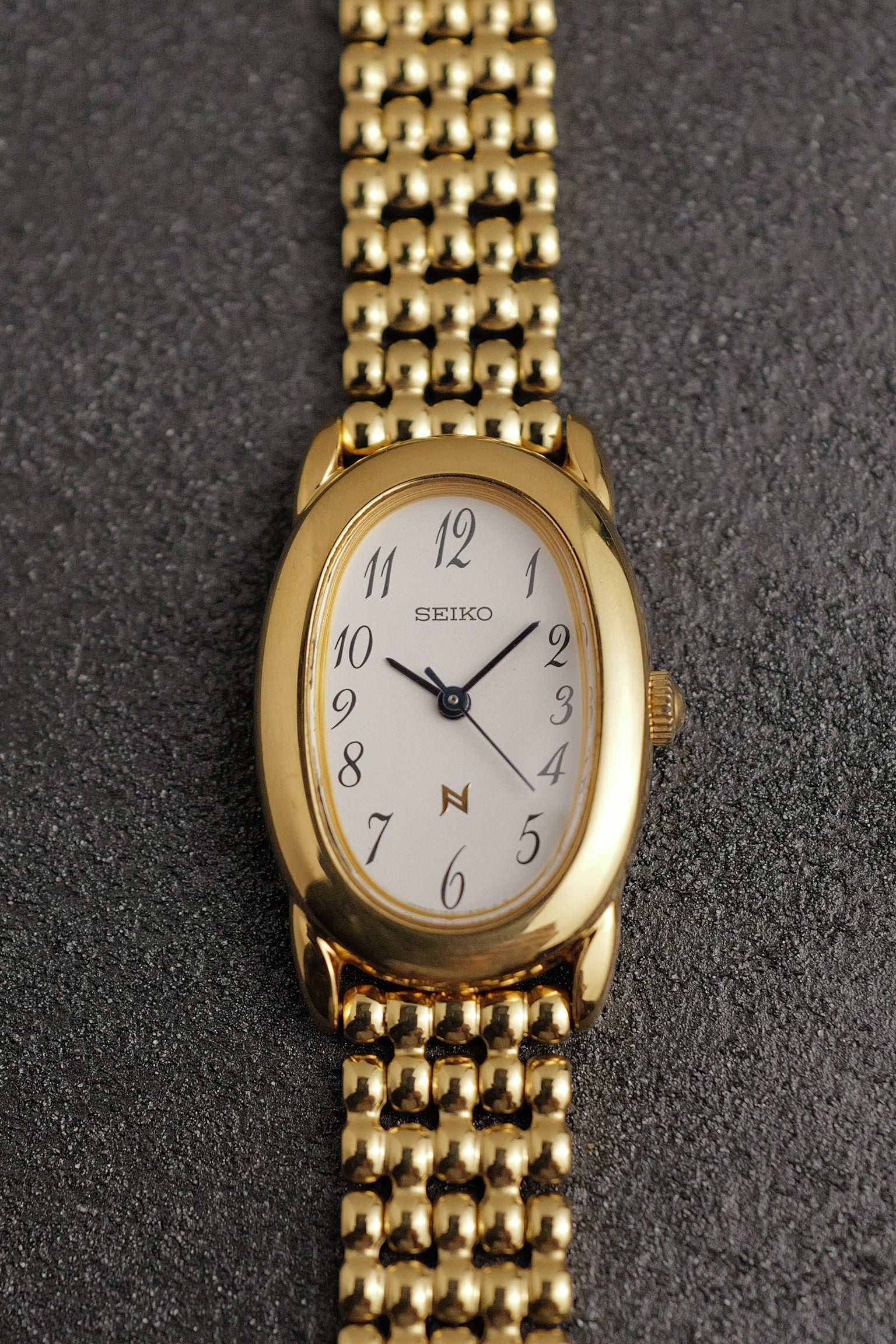 | Watch Summary | known on the Cartiers, the Seiko versions are extremely chiq and beautiful with its horn-like lugs and convex glass. Long oval polished gold-tone case with flared lugs. White dial with elegant black Arabic numerals and blue hour/minute hand. new strap and gold buckle |