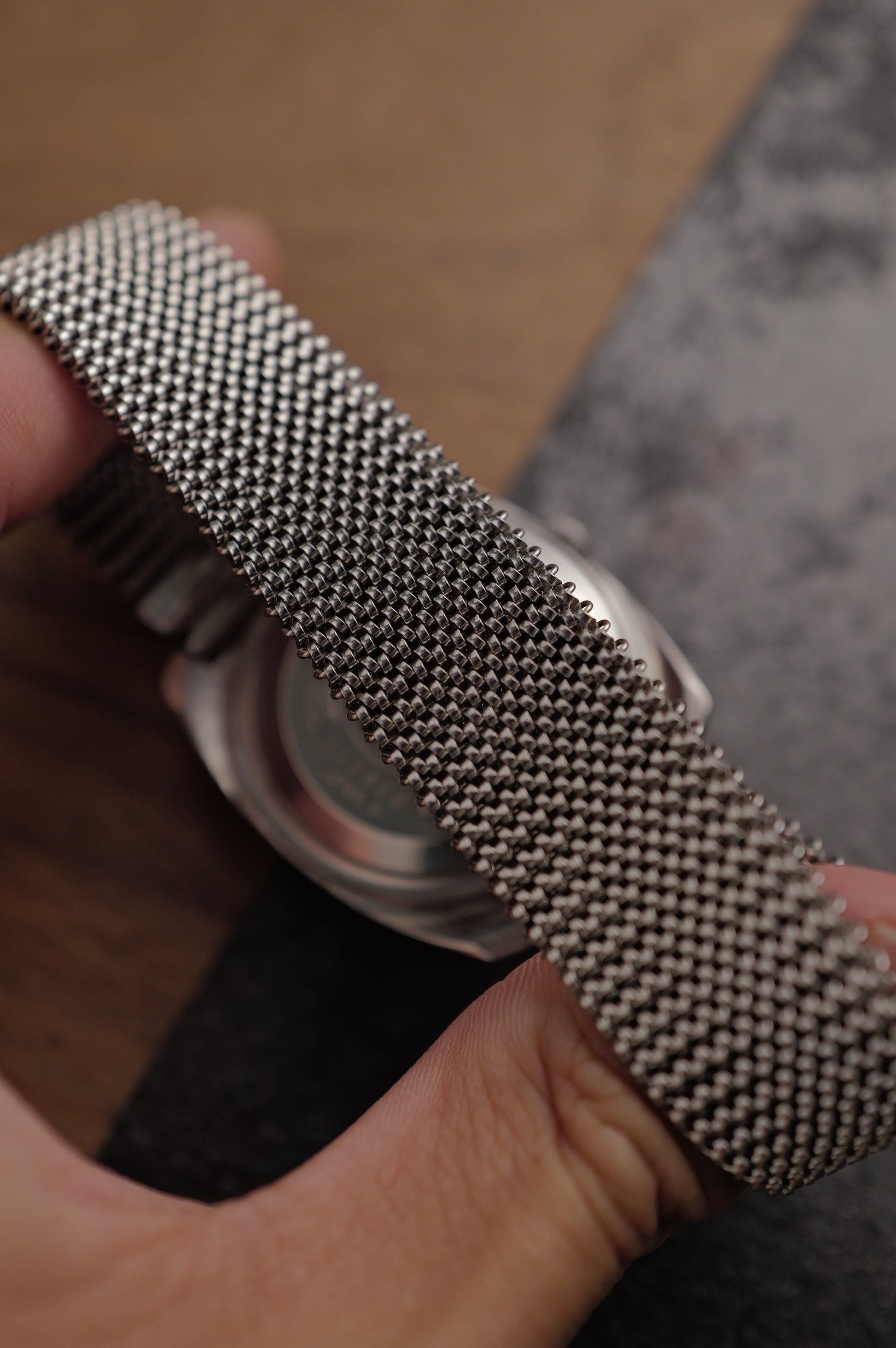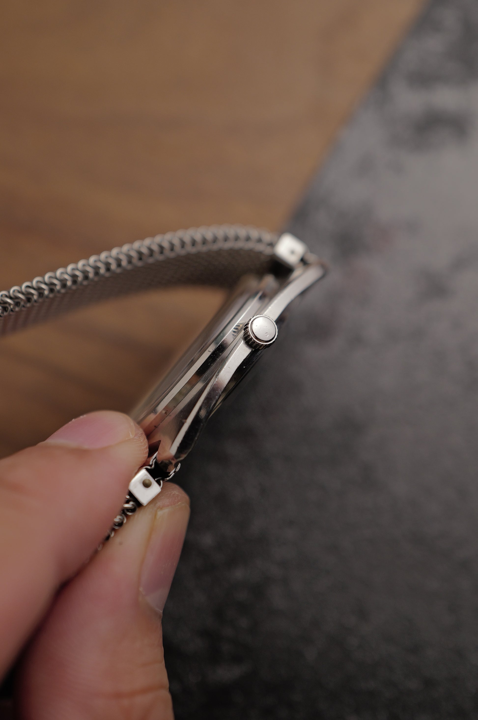Watch Summary | A cushion-shaped stainless-steel case with polished edges and a brushed top surface. The dial is matte black with applied silver indices and matching dauphine hands. The dial is extremely gorgeous, carrying a slightly grey hue finish. Watch was serviced on june 2025. comes attached on an elastic bracelet with the model wrist being at 18cm. |