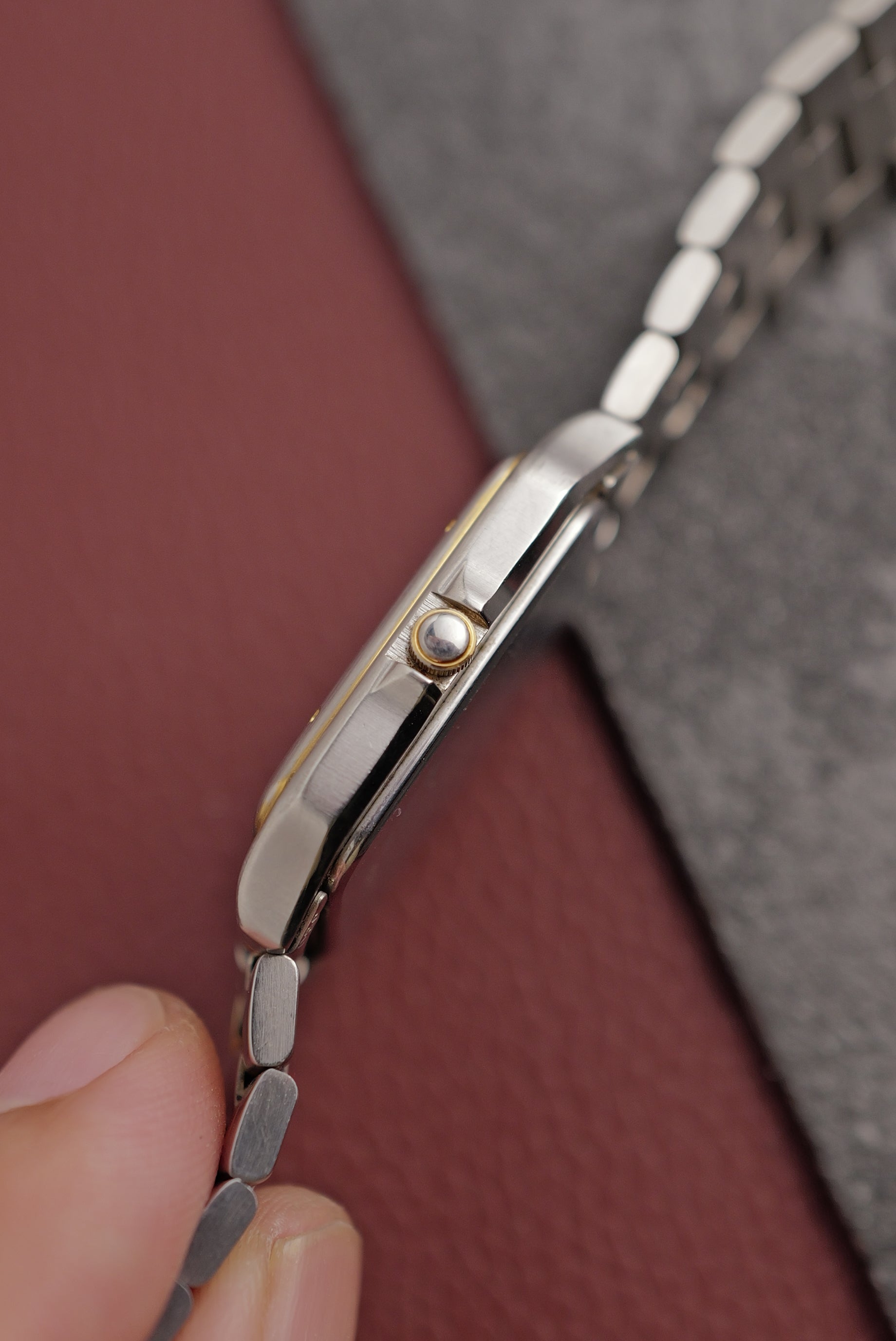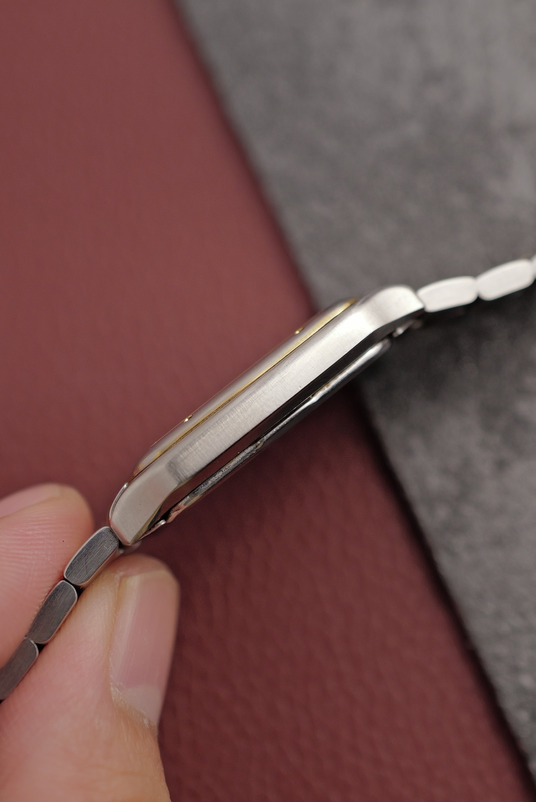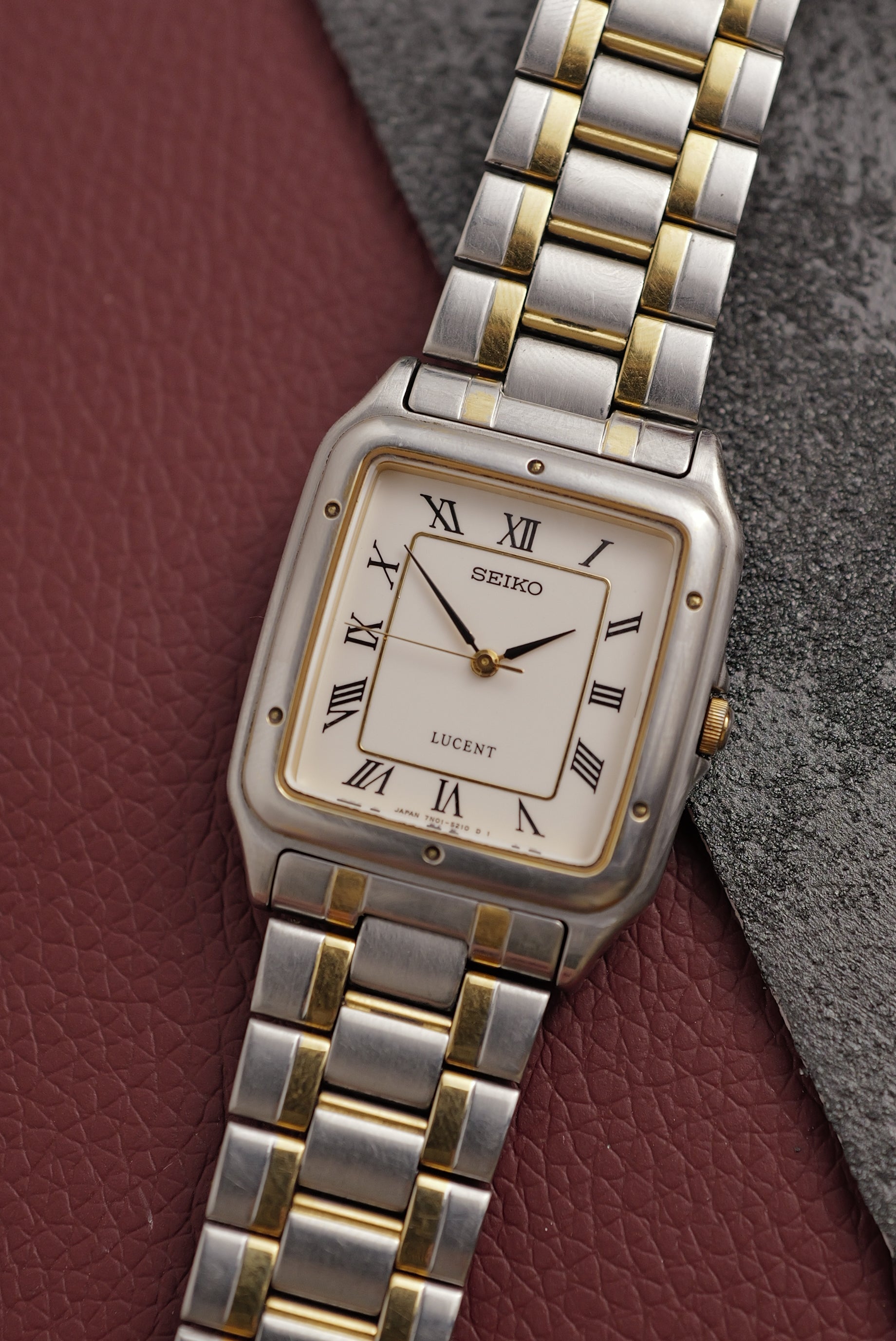 The Seiko Lucent is a classic vintage quartz watch produced in the late 1980s to early 1990s, known for its minimalist aesthetic and similar resemblance to the Cartier Santos. More than its resemblance to Cartier Santos , is its own uniqueness and personality. This particular model features a rectangular, slightly curved case with soft edges and a clean, understated dial. Its gold-tone plated case pairs beautifully with the minimalistic hour markers and slim hands, maintaining a timeless and versatile look. The case is comfortably slim, enhancing wearability as an everyday dress piece.