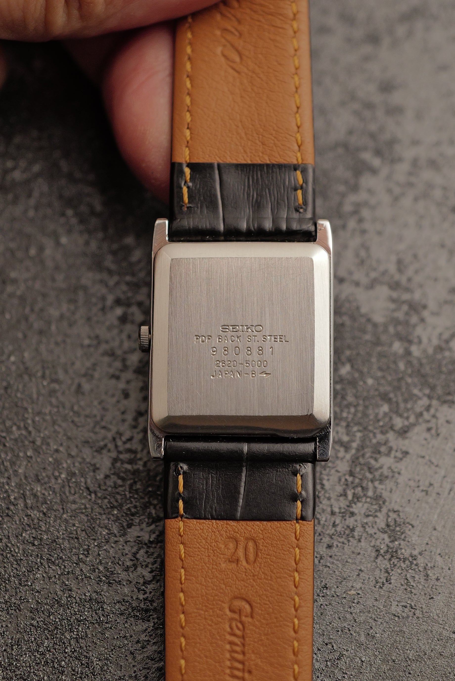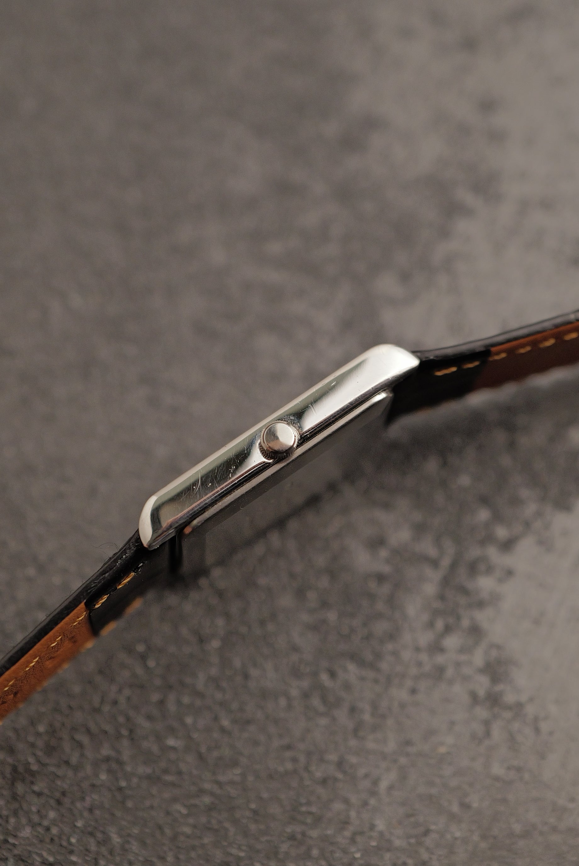 Watch Summary | A grey on grey finishing seiko tank from the late 70s. One of the pioneer models when seiko embraced the quartz technology. Black roman numerals on a grey finished dial. Love how the case design is just flat and angular! |